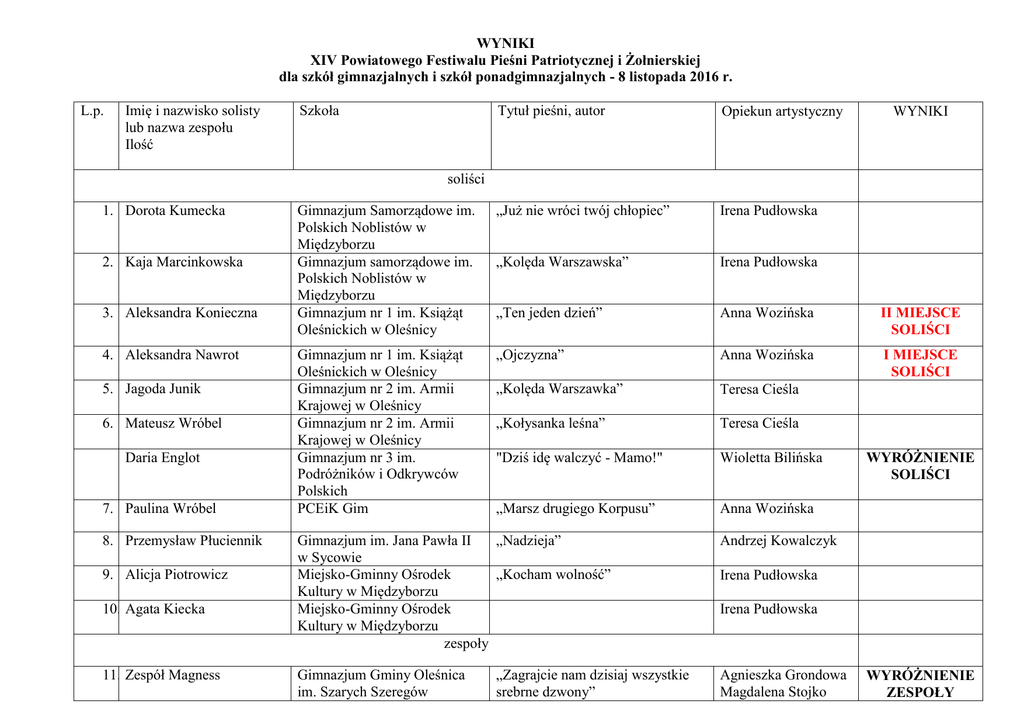 WYNIKI XIV Powiatowego Festiwalu Pieśni Patriotycznej i