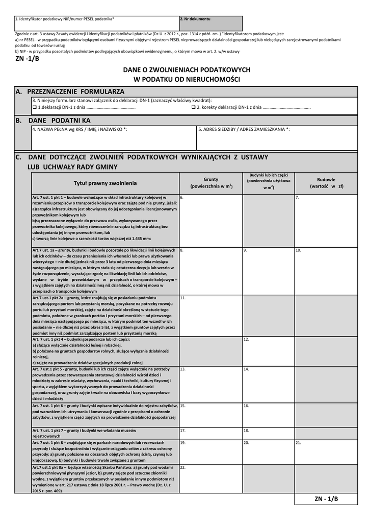 2. Nr dokumentu 1. Identyfikator podatkowy NIP/numer PESEL podatnika* Zgodnie z art. 3 ustawy Zasady ewidencji i identyfikacji podatników i płatników (Dz.U. z 2012 r., poz. 1314 z późń. zm. ) "Identyfikatorem podatkowym jest: a) nr PESEL - w przypadku podatników będącymi osobami fizycznymi objętymi rejestrem PESEL nieprowadzących działalności gospodarczej lub niebędących zarejestrowanymi podatnikami podatku od towarów i usług b) NIP - w przypadku pozostałych podmiotów podlegających obowiązkowi ewidencyjnemu, o którym mowa w art. 2. w/w ustawy ZN -1/B DANE O ZWOLNIENIACH PODATKOWYCH W PODATKU OD NIERUCHOMOŚCI A. PRZEZNACZENIE FORMULARZA 3. Niniejszy formularz stanowi załącznik do deklaracji DN-1 (zaznaczyć właściwy kwadrat): 1.deklaracji DN-1 z dnia ……………………………………. 2. korekty deklaracji DN-1 z dnia …………………………………... B. DANE PODATNI KA 4. NAZWA PEŁNA wg KRS / IMIĘ i NAZWISKO *: 5. ADRES SIEDZIBY / ADRES ZAMIESZKANIA *: C. DANE DOTYCZĄCE ZWOLNIEŃ PODATKOWYCH WYNIKAJĄCYCH Z USTAWY LUB UCHWAŁY RADY GMINY Budynki lub ich części (powierzchnia użytkowa Grunty (powierzchnia w m2) Tytuł prawny zwolnienia wm ) Art. 7 ust. 1 pkt 1 – budowle wchodzące w skład infrastruktury kolejowej w 6. rozumieniu przepisów o transporcie kolejowym oraz zajęte pod nie grunty, jeżeli: a)zarządca infrastruktury jest obowiązany do jej udostępniania licencjonowanym przewoźnikom kolejowym lub b)są przeznaczone wyłącznie do przewozu osób, wykonywanego przez przewoźnika kolejowego, który równocześnie zarządza tą infrastrukturą bez udostępniania jej innym przewoźnikom, lub c) tworzą linie kolejowe o szerokości torów większej niż 1.435 mm: Art.7 ust. 1a – grunty, budynki i budowle pozostałe po likwidacji linii kolejowych 8. lub ich odcinków – do czasu przeniesienia ich własności lub prawa użytkowania wieczystego – nie dłużej jednak niż przez 3 lata od pierwszego dnia miesiąca następującego po miesiącu, w którym stała się ostateczna decyzja lub weszło w życie rozporządzenie, wyrażające zgodę na likwidację linii lub ich odcinków, wydane w trybie przewidzianym w przepisach o transporcie kolejowym – z wyjątkiem zajętych na działalność inną niż działalność, o której mowa w przepisach o transporcie kolejowym Art.7 ust.1 pkt 2a – grunty, które znajdują się w posiadaniu podmiotu zarządzającego portem lub przystanią morską, pozyskane na potrzeby rozwoju portu lub przystani morskiej, zajęte na działalność określoną w statucie tego podmiotu, położone w granicach portów i przystani morskich – od pierwszego dnia miesiąca następującego po miesiącu, w którym podmiot ten wszedł w ich posiadanie – nie dłużej niż przez okres 5 lat, z wyjątkiem gruntów zajętych przez podmiot inny niż podmiot zarządzający portem lub przystanią morską Art. 7 ust. 1 pkt 4 – budynki gospodarcze lub ich części: a) służące wyłącznie działalności leśnej i rybackiej, b) położone na gruntach gospodarstw rolnych, służące wyłącznie działalności rolniczej, c) zajęte na prowadzenie działów specjalnych produkcji rolnej Art. 7 ust.1 pkt 5 - grunty, budynki lub ich części zajęte wyłącznie na potrzeby prowadzenia przez stowarzyszenia statutowej działalności wśród dzieci i młodzieży w zakresie oświaty, wychowania, nauki i techniki, kultury fizycznej i sportu, z wyjątkiem wykorzystywanych do prowadzenia działalności gospodarczej, oraz grunty zajęte trwale na obozowiska i bazy wypoczynkowe dzieci i młodzieży Budowle (wartość w zł) 2 7. 9. 10. 11. 12. 13. 14. Art. 7 ust. 1 pkt 6 – grunty i budynki wpisane indywidualnie do rejestru zabytków, 15. pod warunkiem ich utrzymania i konserwacji zgodnie z przepisami o ochronie zabytków, z wyjątkiem części zajętych na prowadzenie działalności gospodarczej 16. Art. 7 ust. 1 pkt 7 – grunty i budynki we władaniu muzeów rejestrowanych Art. 7 ust. 1 pkt 8 – znajdujące się w parkach narodowych lub rezerwatach przyrody i służące bezpośrednio i wyłącznie osiąganiu celów z zakresu ochrony przyrody: a) grunty położone na obszarach objętych ochroną ścisłą, czynną lub krajobrazową, b) budynki i budowle trwale związane z gruntem 17. 18. 19. 20. Art.7 ust.1 pkt 8a – będące własnością Skarbu Państwa: a) grunty pod wodami powierzchniowymi płynącymi jezior, b) grunty zajęte pod sztuczne zbiorniki wodne, z wyjątkiem gruntów przekazanych w posiadanie innym podmiotom niż wymienione w art. 217 ustawy z dnia 18 lipca 2001 r. – Prawo wodne (Dz. U. z 2015 r. poz. 469) 22. 21. ZN - 1/B Grunty (powierzchnia w m2) Tytuł prawny zwolnienia Art. 7 ust. 1 pkt 9 budowle wałów ochronnych, grunty pod wałami ochronnymi i położone w międzywalach, z wyjątkiem zajętych na prowadzenie działalności gospodarczej przez inne podmioty niż spółki wodne, ich związki oraz związki wałowe 23. Art. 7 ust. 1 pkt 10 – grunty stanowiące nieużytki, użytki ekologiczne, grunty zadrzewione i zakrzewione, z wyjątkiem zajętych na prowadzenie działalności gospodarczej 25. Art. 7 ust. 1 pkt 11 – grunty stanowiące działki przyzagrodowe członków 26. rolniczych spółdzielni produkcyjnych, którzy spełniają jeden z warunków: a) osiągnęli wiek emerytalny, b) są inwalidami zaliczonymi do I albo II grupy, c) są niepełnosprawnymi o znacznym lub umiarkowanym stopniu niepełnosprawności, d) są osobami całkowicie niezdolnymi do pracy w gospodarstwie rolnym albo niezdolnymi do samodzielnej egzystencji Art. 7 ust. 1 pkt 12 – budynki położone na terenie rodzinnych ogrodów działkowych, nieprzekraczające norm powierzchni ustalonych w przepisach Prawa budowlanego dla altan i obiektów gospodarczych, z wyjątkiem zajętych na działalność gospodarczą Budynki lub ich części (powierzchnia użytkowa 2 Budowle (wartość w zł) 24. 27. Art. 7 ust. 1 pkt 13 - budynki i budowl