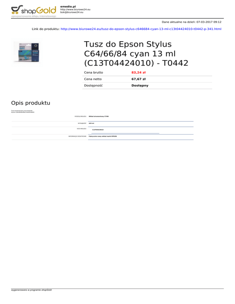 emedio.pl http://www.biurowe24.eu [email protected] Dane aktualne na dzień: 07-03-2017 09:12 Link do produktu: http://www.biurowe24.eu/tusz-do-epson-stylus-c646684-cyan-13-ml-c13t04424010-t0442-p-341.html Tusz do Epson Stylus C64/66/84 cyan 13 ml (C13T04424010) - T0442 Cena brutto 83,24 zł Cena netto 67,67 zł Dostępność Dostępny Opis produktu Tusz przeznaczony do drukarek: Stylus C64/66/84/86/CX6400/6600 RODZAJ WKŁADU WYDAJNOŚĆ KOD WKŁADU INFORMACJE DODATKOWE wygenerowano w programie shopGold Powered by TCPDF (www.tcpdf.org) Wkład atramentowy CYAN 420 str C13T04424010 Fabrycznie nowy wkład marki EPSON