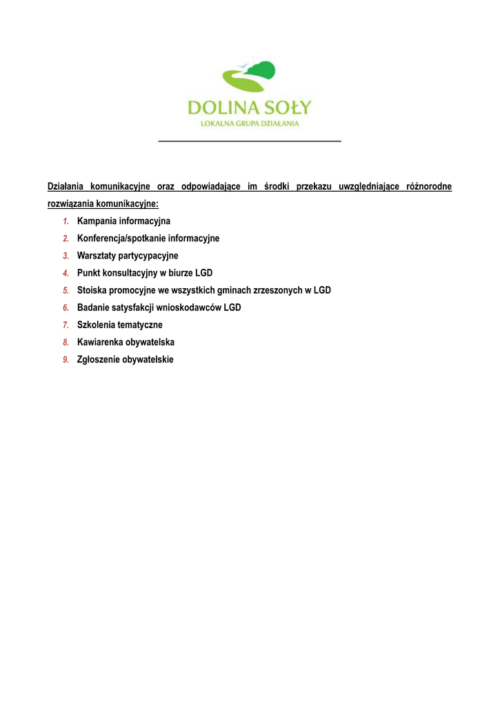 Działania komunikacyjne oraz odpowiadające im środki przekazu uwzględniające różnorodne rozwiązania komunikacyjne: 1. Kampania informacyjna 2. Konferencja/spotkanie informacyjne 3. Warsztaty partycypacyjne 4. Punkt konsultacyjny w biurze LGD 5. Stoiska promocyjne we wszystkich gminach zrzeszonych w LGD 6. Badanie satysfakcji wnioskodawców LGD 7. Szkolenia tematyczne 8. Kawiarenka obywatelska 9. Zgłoszenie obywatelskie