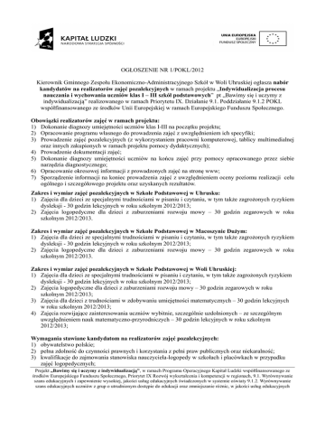OGŁOSZENIE NR 1/POKL/2012 Kierownik Gminnego Zespołu Ekonomiczno-Administracyjnego Szkół w Woli Uhruskiej ogłasza nabór kandydatów na realizatorów zajęć pozalekcyjnych w ramach projektu „Indywidualizacja procesu nauczania i wychowania uczniów klas I – III szkół podstawowych” pt „Bawimy się i uczymy z indywidualizacją” realizowanego w ramach Priorytetu IX. Działanie 9.1. Poddziałanie 9.1.2 POKL współfinansowanego ze środków Unii Europejskiej w ramach Europejskiego Funduszu Społecznego. Obowiązki realizatorów zajęć w ramach projektu: 1) Dokonanie diagnozy umiejętności uczniów klas I-III na początku projektu; 2) Opracowanie programu własnego do prowadzenia zajęć z uwzględnieniem ich specyfiki; 3) Prowadzenie zajęć pozalekcyjnych (z wykorzystaniem pracowni komputerowej, tablicy multimedialnej oraz innych zakupionych w ramach projektu pomocy dydaktycznych); 4) Prowadzenie dokumentacji zajęć; 5) Dokonanie diagnozy umiejętności uczniów na końcu zajęć przy pomocy opracowanego przez siebie narzędzia diagnostycznego; 6) Opracowanie okresowej informacji z prowadzonych zajęć na stronę www; 7) Sporządzenie informacji na koniec prowadzenia zajęć z uwzględnieniem oceny poziomu realizacji celu ogólnego i szczegółowego projektu oraz uzyskanych rezultatów. Zakres i wymiar zajęć pozalekcyjnych w Szkole Podstawowej w Uhrusku: 1) Zajęcia dla dzieci ze specjalnymi trudnościami w pisaniu i czytaniu, w tym także zagrożonych ryzykiem dysleksji - 30 godzin lekcyjnych w roku szkolnym 2012/2013; 2) Zajęcia logopedyczne dla dzieci z zaburzeniami rozwoju mowy – 30 godzin zegarowych w roku szkolnym 2012/2013. Zakres i wymiar zajęć pozalekcyjnych w Szkole Podstawowej w Macoszynie Dużym: 1) Zajęcia dla dzieci ze specjalnymi trudnościami w pisaniu i czytaniu, w tym także zagrożonych ryzykiem dysleksji - 30 godzin lekcyjnych w roku szkolnym 2012/2013; 2) Zajęcia logopedyczne dla dzieci z zaburzeniami rozwoju mowy – 30 godzin zegarowych w roku szkolnym 2012/2013. Zakres i wymiar zajęć pozalekcyjnych w Szkole Podstawowej w Woli Uhruskiej: 1) Zajęcia dla dzieci ze specjalnymi trudnościami w pisaniu i czytaniu, w tym także zagrożonych ryzykiem dysleksji - 30 godzin lekcyjnych w roku szkolnym 2012/2013; 2) Zajęcia logopedyczne dla dzieci z zaburzeniami rozwoju mowy – 30 godzin zegarowych w roku szkolnym 2012/2013; 3) Zajęcia dla dzieci z trudnościami w zdobywaniu umiejętności matematycznych – 30 godzin lekcyjnych w roku szkolnym 2012/2013; 4) Zajęcia rozwijające zainteresowania uczniów wybitnie, szczególnie uzdolnionych – ze szczególnym uwzględnieniem nauk matematyczno-przyrodniczych – 30 godzin lekcyjnych w roku szkolnym 2012/2013; Wymagania stawiane kandydatom na realizatorów zajęć pozalekcyjnych: 1) obywatelstwo polskie; 2) pełna zdolność do czynności prawnych i korzystania z pełni praw publicznych oraz niekaralność; 3) kwalifikacje do zajmowania stanowiska nauczyciela-logopedy w szkołach i placówkach w przypadku zajęć logopedycznych; Projekt „Bawimy się i uczymy z indywidualizacją”, w ramach Programu Operacyjnego Kapitał Ludzki współfinansowanego ze środków Europejskiego Funduszu Społecznego, Priorytet IX Rozwój wykształcenia i kompetencji w regionach, 9.1. Wyrównywanie szans edukacyjnych i zapewnienie wysokiej, jakości usług edukacyjnych świadczonych w systemie oświaty 9.1.2. Wyrównywanie szans edukacyjnych uczniów z grup o utrudnionym dostępie do edukacji oraz zmniejszanie różnic, w jakości usług edukacyjnych 4) kwalifikacje kierunkowe zgodne ze specyfiką zajęć w przypadku pozostałych zajęć lub do zajmowania stanowiska nauczyciela w przedszkolach i klasach I-III szkoły podstawowej; 5) doświadczenie zawodowe w pracy dydaktyczno-wychowawczej z uczniami; 6) znajomość specyfiki pracy szkoły; 7) umiejętność obsługi komputera. UWAGA: Kandydaci na realizatorów zajęć pozalekcyjnych nie mogą być pracownikami szkół w których realizowane będą zajęcia pozalekcyjne. Wymagane dokumenty. 1) List motywacyjny z uzasadnieniem oraz wskazaniem rodzaju zajęć pozalekcyjnych i szkoły w której kandydat deklaruje ich prowadzenie. 2) Życiorys (CV), z uwzględnieniem opisu przebiegu pracy zawodowej, doświadczenia zawodowego kandydata. 3) Kserokopie dokumentów potwierdzających posiadane wykształcenie. 4) Kserokopie zaświadczeń o ukończonych kursach lub szkoleniach. 5) Kwestionariusz osobowy, zgodnie z załącznikiem nr 1. 6) Oświadczenie o niekaralności za przestępstwo popełnione umyślnie, zgodnie z załącznikiem nr 2. 7) Oświadczenie o wyrażeniu zgody na przetwarzanie danych osobowych, zgodnie z załącznikiem nr 3. Wymagane dokumenty należy składać w zaklejonej kopercie w Gminnym Zespole EkonomicznoAdministracyjnym Szkół w Woli Uhruskiej lub pocztą na adres:Gminny Zespół EkonomicznoAdministracyjny Szkół w Woli Uhruskiej, ul. Parkowa 5, 22-230 Wola Uhruska z dopiskiem: “Dotyczy naboru kandydatów na realizatorów zajęć pozalekcyjnych”, w terminie do 30.08. 2012 r. Dokumenty, które wpłyną do GZEAS po upływie wyżej wskazanego terminu nie będą rozpatrywane. Spośród wszystkich kandydatów, którzy złożą dokumenty wyłonieni zostaną realizatorzy zajęć pozalekcyjnych przy uwzględnieniu następujących kryteriów: 1) poziom wykształcenia; 2) stopień awansu zawodowego nauczyciela; 3) staż pracy w zawodzie nauczyciela. Z realizatorami zajęć zawarte zostaną umowy zlecenia. Szczegółowych informacji udziela Lidia Ciszewska-Wilkos Kierownik GZEAS tel. 82 591 50 58. Projekt „Bawimy się i uczymy z indywidualizacją”, w ramach Programu Operacyjnego Kapitał Ludzki współfinansowanego ze środków Europejskiego Funduszu Społecznego, Priorytet IX Rozwój wykształcenia i kompetencji w regionach, 9.1. Wyrównywanie szans edukacyjnych i zapewnienie wysokiej, jakości usług edukacyjnych świadczonych w systemie oświaty 9.1.2. W