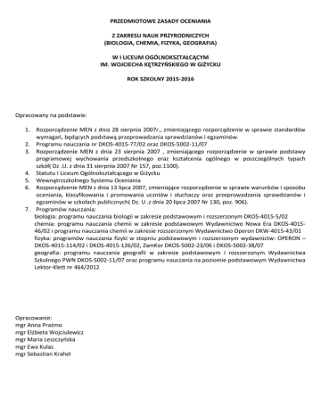 PRZEDMIOTOWE ZASADY OCENIANIA Z ZAKRESU NAUK PRZYRODNICZYCH (BIOLOGIA, CHEMIA, FIZYKA, GEOGRAFIA) W I LICEUM OGÓLNOKSZTAŁCĄCYM IM. WOJCIECHA KĘTRZYŃSKIEGO W GIŻYCKU ROK SZKOLNY 2015-2016 Opracowany na podstawie: 1. Rozporządzenie MEN z dnia 28 sierpnia 2007r., zmieniającego rozporządzenie w sprawie standardów wymagań, będących podstawą przeprowadzania sprawdzianów i egzaminów. 2. Programu nauczania nr DKOS-4015-77/02 oraz DKOS-5002-11/07 3. Rozporządzenie MEN z dnia 23 sierpnia 2007 , zmieniającego rozporządzenie w sprawie podstawy programowej wychowania przedszkolnego oraz kształcenia ogólnego w poszczególnych typach szkół( Dz .U. z dnia 31 sierpnia 2007 Nr 157, poz.1100). 4. Statutu I Liceum Ogólnokształcącego w Giżycku 5. Wewnątrzszkolnego Systemu Oceniania 6. Rozporządzenie MEN z dnia 13 lipca 2007, zmieniające rozporządzenie w sprawie warunków i sposobu oceniania, klasyfikowania i promowania uczniów i słuchaczy oraz przeprowadzania sprawdzianów i egzaminów w szkołach publicznych( Dz. U .z dnia 20 lipca 2007 Nr 130, poz. 906). 7. Programów nauczania: biologia: programu nauczania biologii w zakresie podstawowym i rozszerzonym DKOS-4015-5/02 chemia: programu nauczania chemii w zakresie podstawowym Wydawnictwo Nowa Era DKOS-401546/02 i programu nauczania chemii w zakresie rozszerzonym Wydawnictwo Operon DKW-4015-43/01 fizyka: programów nauczania fizyki w stopniu podstawowym i rozszerzonym wydawnictw: OPERON – DKOS-4015-114/02 i DKOS-4015-126/02, ZamKor DKOS-5002-23/06 i DKOS-5002-38/07 geografia: programu nauczania geografii w zakresie podstawowym i rozszerzonym Wydawnictwa Szkolnego PWN DKOS-5002-11/07 oraz programu nauczania na poziomie podstawowym Wydawnictwa Lektor-Klett nr 464/2012 Opracowanie: mgr Anna Prażmo mgr Elżbieta Wojciulewicz mgr Maria Leszczyńska mgr Ewa Kulas mgr Sebastian Krahel PRZEDMIOTOWE ZASADY OCENIANIA Z ZAKRESU NAUK PRZYRODNICZYCH Cele Przedmiotowego Zakresu Oceniania z przedmiotów przyrodniczych 1. Poinformowanie ucznia o poziomie jego osiągnięć edukacyjnych i postępach w dziedzinie przedmiotów przyrodniczych. 2. Pomoc uczniowi w samodzielnym planowaniu jego rozwoju 3. Motywowanie ucznia do dalszej pracy 4. Dostarczenie rodzicom lub opiekunom prawnym i nauczycielom informacji o postępach trudnościach i zdolnościach ucznia. 5. Dostarczenie nauczycielowi informacji koniecznych do doskonalenia metod pracy dydaktycznowychowawczej. I. Ocenianie 1. Przedmiotem oceny są: A. Wiadomości i umiejętności wg podstaw programowych, B. Zaangażowanie w proces nauczania – uczenia się (aktywność) 2. Ocenianiu podlegać będą: A. Wypowiedzi ustne (przynajmniej raz w semestrze), oceniane pod względem rzeczowości, stosowania fachowego słownictwa z zakresu przedmiotu oraz formułowania dłuższych wypowiedzi. Obowiązuje materiał z trzech ostatnich lekcji, w przypadku lekcji powtórzeniowych – z całego działu. Wypowiedź ustna może mieć formę pisemną i nie dotyczyć całej klasy. B. Prace klasowe (przynamniej jedna w semestrze) przeprowadzone po zakończeniu każdego działu, zapowiedziane z tygodniowym wyprzedzeniem. Prace mogą mieć formę testu. Przyjmuje się wówczas skalę procentową przeliczaną na skale cyfrową wg następujących kryteriów: Celujący Bardzo Dobry Dobry Dostateczny Dopuszczający Niedostateczny C. 3. 4. 5. 6. - powyżej 95 % punktów - 90-94 % punktów - 75-89 % punktów - 50-74 % punktów - 30-49 % punktów - 0-29 % punktów Sprawdziany obejmujące materiał z trzech ostatnich tematów, zapowiedziane na ostatniej lekcji. Skala ocen będzie opracowana indywidualnie przy każdym sprawdzianie. D. Kartkówki z ostatniej lekcji , które mogą być niezapowiedziane. E. Prace domowe mogą podlegać ocenianiu na podstawie sprawdzenia wykonania wskazanych poleceń . F. Prace dodatkowe – plansze, schematy, wykresy – oceniane w skali dobry – celujący, a także w postaci plusów, które przeliczane są analogicznie do ocen za aktywność na lekcji. G. Za aktywność na lekcji uczeń otrzyma ocenę celującą gdy zgromadzi 5plusów, bardzo dobrą, gdy zgromadzi 3 plusy; dobrą – gdy zgromadzi 2 plusy. Nauczyciel oddaje sprawdzone prace pisemne w terminie dwóch tygodni. Nauczyciel oddając prace pisemne obowiązany jest omówić najważniejsze błędy popełnione przez uczniów. Uczeń ma prawo wglądu do sprawdzonej pracy pisemnej. Uczeń jest obowiązany napisać wszystkie prace klasowe kończące poszczególne działy. W przypadku braku oceny z którejkolwiek z prac klasowych przy wystawianiu ocen nauczyciel brak oceny traktować będzie równoważnie z oceną zero. Jeżeli uczeń Nie przyjdzie w umówionym terminie poprawy bądź zaliczenia pracy klasowej jest również równoważne z oceną zero- WZO. 7. Uczeń, który z przyczyn losowych (długotrwała choroba lub inne przyczyny losowe, o których uczeń informuje nauczyciela indywidualnie) nie może napisać sprawdzianu w wyznaczonym terminie, ma obowiązek uzgodnić z nauczycielem na najbliższych zajęciach termin zaliczenia sprawdzianu. 8. Po dłuższej, usprawiedliwionej nieobecności (co najmniej tydzień) uczeń bezpośrednio po powrocie do szkoły nie podlega ocenianiu. 9. Uczeń ma prawo do poprawy oceny otrzymanej na danym przedmiocie. Po poprawie pod uwagę brane są obie oceny. 10. Uczniowi przysługuje raz w semestrze możliwość zgłoszenia nieprzygotowania, o ile fakt ten zostanie zgłoszony na początku lekcji. 11. Prowadzenie zeszytu przedmiotowego jest obowiązkowe, natomiast sposób prowadzenia, przy założeniu, że zachowana jest estetyka, jest indywidualną sprawą ucznia. 12. Wystawienie oceny semestralnej i na koniec roku dokonuje się na podstawie ocen cząstkowych, przy pomocy średniej ważonej. Największą wagę mają oceny z prac klasowych – 3, sprawdziany-2 , pozostałe oceny mają wagę 1. Kryteria oceniania semestralnego i końcowowrocznego 6,00-5,50– celujący 5,49-4,50 – bardzo dobry 4,