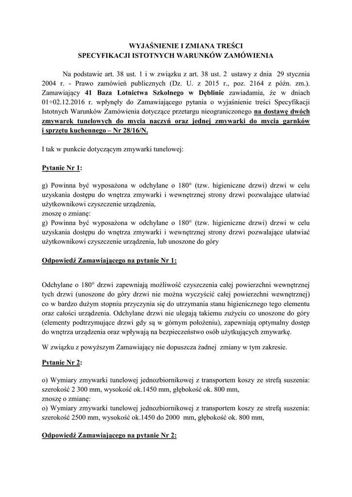 WYJAŚNIENIE I ZMIANA TREŚCI SPECYFIKACJI ISTOTNYCH WARUNKÓW ZAMÓWIENIA Na podstawie art. 38 ust. 1 i w związku z art. 38 ust. 2 ustawy z dnia 29 stycznia 2004 r. - Prawo zamówień publicznych (Dz. U. z 2015 r., poz. 2164 z późn. zm.). Zamawiający 41 Baza Lotnictwa Szkolnego w Dęblinie zawiadamia, że w dniach 01÷02.12.2016 r. wpłynęły do Zamawiającego pytania o wyjaśnienie treści Specyfikacji Istotnych Warunków Zamówienia dotyczące przetargu nieograniczonego na dostawę dwóch zmywarek tunelowych do mycia naczyń oraz jednej zmywarki do mycia garnków i sprzętu kuchennego – Nr 28/16/N. I tak w punkcie dotyczącym zmywarki tunelowej: Pytanie Nr 1: g) Powinna być wyposażona w odchylane o 180° (tzw. higieniczne uzyskania dostępu do wnętrza zmywarki i wewnętrznej strony drzwi użytkownikowi czyszczenie urządzenia, znoszę o zmianę: g) Powinna być wyposażona w odchylane o 180° (tzw. higieniczne uzyskania dostępu do wnętrza zmywarki i wewnętrznej strony drzwi użytkownikowi czyszczenie urządzenia, lub unoszone do góry drzwi) drzwi w celu pozwalające ułatwiać drzwi) drzwi w celu pozwalające ułatwiać Odpowiedź Zamawiającego na pytanie Nr 1: Odchylane o 180° drzwi zapewniają możliwość czyszczenia całej powierzchni wewnętrznej tych drzwi (unoszone do góry drzwi nie można wyczyścić całej powierzchni wewnętrznej) co w bardzo dużym stopniu przyczynia się do utrzymania stanu higienicznego tego elementu oraz całości urządzenia. Odchylane drzwi nie ulegają takiemu zużyciu co unoszone do góry (elementy podtrzymujące drzwi gdy są w górnym położeniu), zapewniają optymalny dostęp do wnętrza urządzenia oraz wpływają na bezpieczeństwo osób użytkujących zmywarkę. W związku z powyższym Zamawiający nie dopuszcza żadnej zmiany w tym zakresie. Pytanie Nr 2: o) Wymiary zmywarki tunelowej jednozbiornikowej z transportem koszy ze strefą suszenia: szerokość 2 300 mm, wysokość ok.1450 mm, głębokość ok. 800 mm, znoszę o zmianę: o) Wymiary zmywarki tunelowej jednozbiornikowej z transportem koszy ze strefą suszenia: szerokość 2500 mm, wysokość ok.1450 do 2000 mm, głębokość ok. 800 mm, Odpowiedź Zamawiającego na pytanie Nr 2: Wymiary zmywarki tunelowej jednozbiornikowej z transportem koszy ze strefą suszenia, Zamawiający podał szerokość 2 300 mm, biorąc pod uwagę warunki lokalowe gdzie urządzenie będzie zainstalowane wraz z dodatkowym wyposażeniem (stoły, również podając wymiary), dopuszczając większą szerokość maszyny trzeba zmienić wymiary stołów na co Zamawiający nie wyraża zgody. Ze względu na nie dopuszczenie zmiany szerokości zmywarki pozostałe wymiary zostają bez zmian, gdyż nie wpływają znacząco na całokształt sprawy. W związku z powyższym Zamawiający nie dopuszcza żadnej zmiany w tym zakresie. Pytanie Nr 3: q) Ilość wody płuczącej (w warunkach idealnych)260 l/h, r) Certyfikat zgodności CB, SVGW, WRAS znoszę o zmianę: q) Ilość wody płuczącej (w warunkach idealnych) do 260 l/h, r) Certyfikat zgodności CB, SVGW, WRAS wykreślenie tego punktu (są to niewymagane w Polsce certyfikaty, a posiada je tylko Winterhalter Odpowiedź Zamawiającego na pytanie Nr 3: Zamawiający zmienia: Ilość wody płuczącej (w warunkach idealnych) do 260 l/h Wykreśla: Certyfikat zgodności CB, SVGW, WRAS W punkcie dotyczącym zmywarki do mycia garnków Pytanie Nr 4: r) Szerokość wejścia minimum 1300 mm znoszę o zmianę r) Szerokość wejścia minimum 1200-1300 mm Odpowiedź Zamawiającego na pytanie Nr 4: Zamawiający podał szerokość wejścia minimum 1 300 mm, w celu możliwości zmywania 2 dużych garnków jednocześnie (na wyposażeniu stołówek znajdują się garnki 100 l, których średnica wynosi 62 cm), a podana szerokość umożliwi załadować większy sprzęt kuchenny między innymi wymienione garnki. W związku z powyższym Zamawiający nie dopuszcza żadnej zmiany w tym zakresie. Pytanie Nr 5: s) Certyfikat zgodności CB, SVGW, WRAS, s) Certyfikat zgodności CB, SVGW, WRAS, wykreślenie tego punktu (są to niewymagane w Polsce certyfikaty, a posiada je tylko Winterhalter Odpowiedź Zamawiającego na pytanie Nr 5: Zamawiający wykreśla: Certyfikat zgodności CB, SVGW, WRAS Pytanie Nr 6: x) Wymiary zmywarki do mycia garnków i sprzętu kuchennego: szerokość 1400 â 1500 mm, wysokość 2000 â2100 mm, głębokość 800 â900 mm. x) Wymiary zmywarki do mycia garnków i sprzętu kuchennego: szerokość 1400 â 1500 mm, wysokość 2000 â2100 mm, głębokość 800 â 900 mm. znoszę o zmianę: x) Wymiary zmywarki do mycia garnków i sprzętu kuchennego: szerokość 1375 â1500 mm, wysokość 2000 â 2200 mm, głębokość 800 â 950 mm. Odpowiedź Zamawiającego na pytanie Nr 6: Wymiary zmywarki do mycia garnków i sprzętu kuchennego: szerokość 1400 – 1500 mm, wysokość 2000 – 2100 mm, głębokość 800 – 900 mm. Wymiary zmywarki zostały podane z uwzględnieniem wymiarów drzwi wejściowych (szerokość oraz wysokość) do budynku oraz pomieszczeń w obiekcie, w którym uradzenie zostanie zainstalowane. W związku z powyższym Zamawiający nie dopuszcza żadnej zmiany w tym zakresie. Pytanie Nr 7: Czy Zamawiający dopuszcza inny termin wykonania dostawy niż 22,12,2016r, gdyż do tego terminu żadna fabryka nie jest w stanie wyprodukować w/w sprzętu - a jest to sprzęt tylko na zamówienie, gdzie termin realizacji od chwili zamówienia określony jest przez producenta na okres od 6 do 7 tygodni? Odpowiedź Zamawiającego na pytanie Nr 7: Zamawiający nie dopuszcza innego terminu wykonania dostawy. Zamawiający 41 Baza Lotnictwa Szkolnego w Dęblinie działając na podstawie art. 38 ust. 4 ustawy Prawo Zamówień Publicznych zawiadamia, że dokonuje zmiany treści specyfikacji istotnych warunków zamówienia w zakresie: 1. CZĘŚĆ III – opis przedmiotu zamówienia: pkt.1 SZCZEGÓŁOWY OPIS PRZEDMIOTU ZAMÓWIENIA: ppkt. 1 lit. q brzmiał: Ilość wody