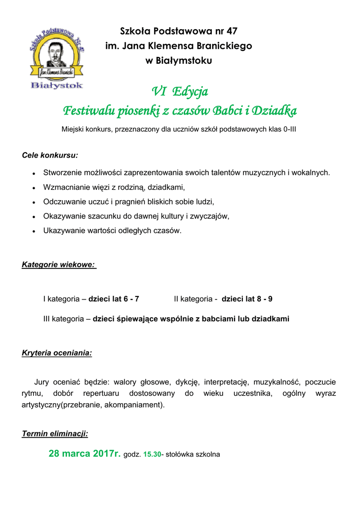 Szkoła Podstawowa nr 47 im. Jana Klemensa Branickiego w Białymstoku VI Edycja Festiwalu piosenki z czasów Babci i Dziadka Miejski konkurs, przeznaczony dla uczniów szkół podstawowych klas 0-III Cele konkursu: Stworzenie możliwości zaprezentowania swoich talentów muzycznych i wokalnych. Wzmacnianie więzi z rodziną, dziadkami, Odczuwanie uczuć i pragnień bliskich sobie ludzi, Okazywanie szacunku do dawnej kultury i zwyczajów, Ukazywanie wartości odległych czasów. Kategorie wiekowe: I kategoria – dzieci lat 6 - 7 II kategoria - dzieci lat 8 - 9 III kategoria – dzieci śpiewające wspólnie z babciami lub dziadkami Kryteria oceniania: Jury oceniać będzie: walory głosowe, dykcję, interpretację, muzykalność, poczucie rytmu, dobór repertuaru dostosowany do wieku uczestnika, ogólny wyraz artystyczny(przebranie, akompaniament). Termin eliminacji: 28 marca 2017r. godz. 15.30- stołówka szkolna Warunki uczestnictwa i regulamin konkursu: 1. Konkurs jest adresowany do dzieci w wieku od 6 do 9lat. 2. Każda placówka może zgłosić do 3 solistów. 3. Każdy z uczestników przygotowuje jedną piosenkę śpiewaną kiedyś przez dziadków, pradziadków lub z ich czasów (mile widziane piosenki z 20-lecia międzywojennego lub żołnierskie) Prosimy, aby czas trwania prezentowanej piosenki nie przekraczał 2 minut. 4. Utwór można wykonać zarówno z własnym akompaniamentem jak i podkładem muzycznym. 5. Podkład muzyczny należy dostarczyć w formie elektronicznej do organizatorów festiwalu przesyłając plik muzyczny (Mp3), na adres [email protected] lub kontaktując się osobiście w terminie do 22.03.2017r.(sala 109 lub 106). 6. Nad przesłuchaniami będzie czuwać jury, które wyłoni laureatów. 7. Organizator zastrzega sobie prawo zmiany regulaminu lub przedłużenia konkursu w razie wystąpienia przyczyn od niego niezależnych. O zmianach uczestnicy zostaną poinformowani. 8. W dniu 27.03.2017r. na stronie szkoły zostanie opublikowana lista uczestników oraz kolejność ich występowania. 9. Organizator zastrzega sobie prawo do publikacji zdjęć z konkursu na stronach internetowych SP 47 im. Jana Klemensa Branickiego w Białymstoku. Administrowanie danych osobowych uczestników konkursu przez organizatorów odbywać się będzie wyłącznie w celach związanych z organizacją niniejszego konkursu. Pisemne potwierdzenie prawnego opiekuna dziecka- zgłoszenie. Inauguracja konkursu Nagrody oraz dyplomy wręczone zostaną laureatom w dniu 05.04.2017r. w Muzeum Wojska w Białymstoku, podczas którego nagrodzeni laureaci proszeni będą o ponowne wykonanie swoich utworów. Zgłoszenia: Zgłoszenia będą przyjmowane do 22.03.2017r.Prosimy wysyłać je na adres: SZKOŁA PODSTAWOWA NR 47 IM. JANA KLEMENSA BRANICKIEGO UL. PALMOWA 28 W BIAŁYMSTOKU (z dopiskiem „FESTIWAL PIOSENKI Z CZASÓW BABCI I DZIADKA”) elektronicznie lub telefonicznie (organizatorzy konkursu): Agnieszka Myszkowska [email protected] tel. 607703830 Ewa Wojciuk [email protected] tel. 669429105 KARTA ZGŁOSZENIOWA Imię i nazwisko solisty………………………………………………………………………………… Wiek dziecka…………………………………………………………………………………………….. Imię i nazwisko opiekuna…………………………………………………………………..………….. Tytuł wykonywanego utworu…………………………………………………….……………………. Numer szkoły i nr telefonu opiekuna- nauczyciela………………………………………….…..…. W związku z organizacją „Festiwalu piosenki z czasów Babci i Dziadka” wyrażam zgodę na przetwarzanie danych osobowych i publikacji wyników konkursu mojego dziecka ……………………………………………… na stronach internetowych organizatora festiwalu zgodnie z ustawą z dnia 29.08.1997r. o ochronie danych osobowych (Dz. U. z. 2016r. poz. 922). Jestem świadomy, że podanie danych osobowych mojego dziecka jest dobrowolne i w każdej chwili mam prawo do wglądu ich treści oraz ich poprawiania, a dane osobowe będą przetwarzane wyłącznie w zakresie niezbędnym do prawidłowej organizacji konkursu. Administratorem danych osobowych jest dyrektor Szkoły Podstawowej Nr 47 im. Jana Klemensa Branickiego w Białymstoku z siedzibą przy ul. Palmowej 28. Odbiorcami danych osobowych są uczniowie, rodzice uczniów SP47 oraz inni uczestnicy konkursu i ich rodzice. …………………………………………………… podpis rodzica (opiekuna prawnego) KARTA ZGŁOSZENIOWA Imię i nazwisko solisty………………………………………………………………………………… Wiek dziecka…………………………………………………………………………………………….. Imię i nazwisko opiekuna…………………………………………………………………..………….. Tytuł wykonywanego utworu…………………………………………………….……………………. Numer szkoły i nr telefonu opiekuna- nauczyciela………………………………………….…..…. W związku z organizacją „Festiwalu piosenki z czasów Babci i Dziadka” wyrażam zgodę na przetwarzanie danych osobowych i publikacji wyników konkursu mojego dziecka ……………………………………………… na stronach internetowych organizatora festiwalu zgodnie z ustawą z dnia 29.08.1997r. o ochronie danych osobowych (Dz. U. z. 2016r. poz. 922). Jestem świadomy, że podanie danych osobowych mojego dziecka jest dobrowolne i w każdej chwili mam prawo do wglądu ich treści oraz ich poprawiania, a dane osobowe będą przetwarzane wyłącznie w zakresie niezbędnym do prawidłowej organizacji konkursu. Administratorem danych osobowych jest dyrektor Szkoły Podstawowej Nr 47 im. Jana Klemensa Branickiego w Białymstoku z siedzibą przy ul. Palmowej 2