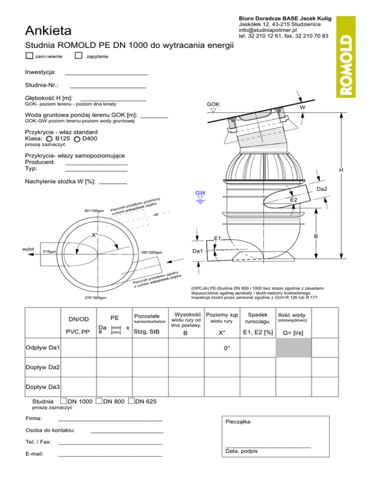 Biuro Doradcze BASE Jacek Kulig Jaskółek 12, 43-215 Studzienice [email protected] tel. 32 210 12 61, fax. 32 210 70 83 Studnia ROMOLD PE DN 1000 do wytracania energii Inwestycja: ________________________ Studnia-Nr.: ______________________ Głębokość H [m]: ___________________ GOK- poziom terenu - poziom dna kinety GOK W Woda gruntowa poniżej terenu GOK [m]: ________ GOK- GW poziom terenu-poziom wody gruntowej Przykrycie - właz standard Klasa: o B125 o D400 proszę zaznaczyć Przykrycia- włazy samopoziomujące Producent: __________________ Typ: __________________ H Nachylenie stożka W [%]: ________ Da2 GW ny eciw u prz p yw zegara e z r p nek Kieru wi o ruch E2 B E1 wylot Da1 dny u zgo gara p yw ze prze k e n Kieru em h z ruc Pozostałe PE DN/OD Da e PVC, PP [mm] [mm] x kamionka/beton Stzg, StB (OPCJA) PE-Studnia DN 800 i 1000 bez stopni zgodnie z zasadami dopuszczenia aprobaty i służb nadzoru budowlanego. Inspekcja studni przez personel zgodnie z GUV-R 126 lub R 177 Wysokość Poziomy kąt wlotu rury od dna postawy. B wlotu rury Spadek rurociagu E1, E2 [%] Ilość wody (obowiązkowo) Q= [l/s] Odpływ Da1 Dopływ Da2 Dopływ Da3 Studnia DN 1000 proszę zaznaczyć Firma: DN 800 DN 625 _________________________________ Osoba do kontaktu: Pieczątka _______________________ Tel. / Fax: _________________________________ E-mail: _________________________________ ___________________________ Data, podpis