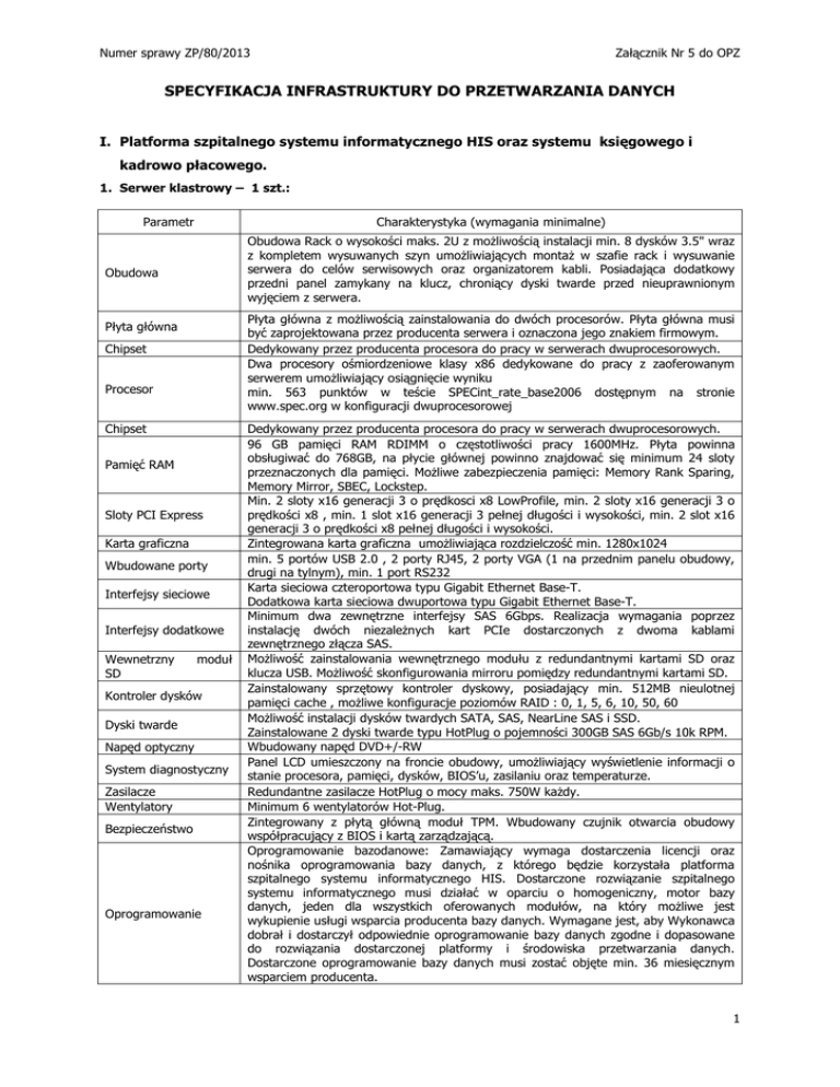 Numer sprawy ZP/80/2013 Załącznik Nr 5 do OPZ SPECYFIKACJA INFRASTRUKTURY DO PRZETWARZANIA DANYCH I. Platforma szpitalnego systemu informatycznego HIS oraz systemu księgowego i kadrowo płacowego. 1. Serwer klastrowy – 1 szt.: Parametr Charakterystyka (wymagania minimalne) Obudowa Rack o wysokości maks. 2U z możliwością instalacji min. 8 dysków 3.5" wraz z kompletem wysuwanych szyn umożliwiających montaż w szafie rack i wysuwanie serwera do celów serwisowych oraz organizatorem kabli. Posiadająca dodatkowy przedni panel zamykany na klucz, chroniący dyski twarde przed nieuprawnionym wyjęciem z serwera. Obudowa Płyta główna z możliwością zainstalowania do dwóch procesorów. Płyta główna musi być zaprojektowana przez producenta serwera i oznaczona jego znakiem firmowym. Dedykowany przez producenta procesora do pracy w serwerach dwuprocesorowych. Dwa procesory ośmiordzeniowe klasy x86 dedykowane do pracy z zaoferowanym serwerem umożliwiający osiągnięcie wyniku min. 563 punktów w teście SPECint_rate_base2006 dostępnym na stronie www.spec.org w konfiguracji dwuprocesorowej Płyta główna Chipset Procesor Chipset Pamięć RAM Sloty PCI Express Karta graficzna Wbudowane porty Interfejsy sieciowe Interfejsy dodatkowe Wewnetrzny SD moduł Kontroler dysków Dyski twarde Napęd optyczny System diagnostyczny Zasilacze Wentylatory Bezpieczeństwo Oprogramowanie Dedykowany przez producenta procesora do pracy w serwerach dwuprocesorowych. 96 GB pamięci RAM RDIMM o częstotliwości pracy 1600MHz. Płyta powinna obsługiwać do 768GB, na płycie głównej powinno znajdować się minimum 24 sloty przeznaczonych dla pamięci. Możliwe zabezpieczenia pamięci: Memory Rank Sparing, Memory Mirror, SBEC, Lockstep. Min. 2 sloty x16 generacji 3 o prędkosci x8 LowProfile, min. 2 sloty x16 generacji 3 o prędkości x8 , min. 1 slot x16 generacji 3 pełnej długości i wysokości, min. 2 slot x16 generacji 3 o prędkości x8 pełnej długości i wysokości. Zintegrowana karta graficzna umożliwiająca rozdzielczość min. 1280x1024 min. 5 portów USB 2.0 , 2 porty RJ45, 2 porty VGA (1 na przednim panelu obudowy, drugi na tylnym), min. 1 port RS232 Karta sieciowa czteroportowa typu Gigabit Ethernet Base-T. Dodatkowa karta sieciowa dwuportowa typu Gigabit Ethernet Base-T. Minimum dwa zewnętrzne interfejsy SAS 6Gbps. Realizacja wymagania poprzez instalację dwóch niezależnych kart PCIe dostarczonych z dwoma kablami zewnętrznego złącza SAS. Możliwość zainstalowania wewnętrznego modułu z redundantnymi kartami SD oraz klucza USB. Możliwość skonfigurowania mirroru pomiędzy redundantnymi kartami SD. Zainstalowany sprzętowy kontroler dyskowy, posiadający min. 512MB nieulotnej pamięci cache , możliwe konfiguracje poziomów RAID : 0, 1, 5, 6, 10, 50, 60 Możliwość instalacji dysków twardych SATA, SAS, NearLine SAS i SSD. Zainstalowane 2 dyski twarde typu HotPlug o pojemności 300GB SAS 6Gb/s 10k RPM. Wbudowany napęd DVD+/-RW Panel LCD umieszczony na froncie obudowy, umożliwiający wyświetlenie informacji o stanie procesora, pamięci, dysków, BIOS’u, zasilaniu oraz temperaturze. Redundantne zasilacze HotPlug o mocy maks. 750W każdy. Minimum 6 wentylatorów Hot-Plug. Zintegrowany z płytą główną moduł TPM. Wbudowany czujnik otwarcia obudowy współpracujący z BIOS i kartą zarządzającą. Oprogramowanie bazodanowe: Zamawiający wymaga dostarczenia licencji oraz nośnika oprogramowania bazy danych, z którego będzie korzystała platforma szpitalnego systemu informatycznego HIS. Dostarczone rozwiązanie szpitalnego systemu informatycznego musi działać w oparciu o homogeniczny, motor bazy danych, jeden dla wszystkich oferowanych modułów, na który możliwe jest wykupienie usługi wsparcia producenta bazy danych. Wymagane jest, aby Wykonawca dobrał i dostarczył odpowiednie oprogramowanie bazy danych zgodne i dopasowane do rozwiązania dostarczonej platformy i środowiska przetwarzania danych. Dostarczone oprogramowanie bazy danych musi zostać objęte min. 36 miesięcznym wsparciem producenta. 1 Numer sprawy ZP/80/2013 Karta zarządzająca Gwarancja Certyfikaty Załącznik Nr 5 do OPZ Niezależna od zainstalowanego na serwerze systemu operacyjnego posiadająca dedykowane port RJ-45 Gigabit Ethernet umożliwiająca: - zdalny dostęp do graficznego interfejsu Web karty zarządzającej - zdalne monitorowanie i informowanie o statusie serwera (m.in. prędkości obrotowej wentylatorów, konfiguracji serwera, ) - szyfrowane połączenie (SSLv3) oraz autentykacje i autoryzację użytkownika - możliwość podmontowania zdalnych wirtualnych napędów - wirtualną konsolę z dostępem do myszy, klawiatury - wsparcie dla IPv6 - wsparcie dla WSMAN (Web Service for Managament); SNMP; IPMI2.0, VLAN tagging, Telnet, SSH - możliwość zdalnego monitorowania w czasie rzeczywistym poboru prądu przez serwer - możliwość zdalnego ustawienia limitu poboru prądu przez konkretny serwer - integracja z Active Directory - możliwość obsługi przez dwóch administratorów jednocześnie - wsparcie dla dynamic DNS - wysyłanie do administratora maila z powiadomieniem o awarii lub zmianie konfiguracji sprzętowej - możliwość podłączenia lokalnego poprzez złącze RS-232 - zainstalowana wewnetrzna dedykowana do karty zarządzającej, karta Sd o pojemności min. 8 GB Trzy lata gwarancji producenta od daty dostarczenia realizowanej w miejscu instalacji sprzętu, z czasem reakcji do czterech godzin od przyjęcia zgłoszenia, możliwość zgłaszania awarii w trybie 24x7x365. W przypadku awarii, dyski twarde pozostają własnością Zamawiającego. Firma serwisująca musi posiadać ISO 9001 na świadczenie usług serwisowych oraz posiadać autoryzacje producenta serwera – dokumenty potwierdzające załączyć do oferty. Oświadczenie producenta serwera, że w przypadku nie wywiązywania się z obowiązków gwarancyjnych oferenta lub firmy serwisującej, przejmie na siebie 