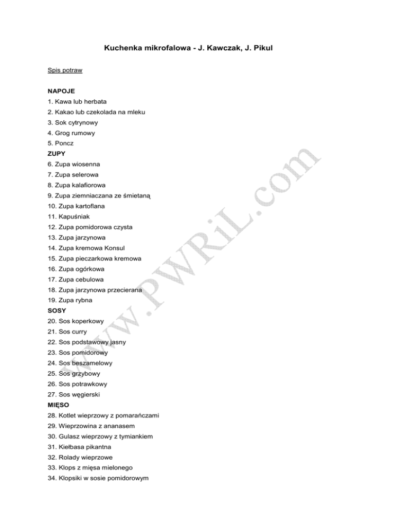 Kuchenka mikrofalowa - J. Kawczak, J. Pikul Spis potraw NAPOJE 1. Kawa lub herbata 2. Kakao lub czekolada na mleku 3. Sok cytrynowy 4. Grog rumowy 5. Poncz ZUPY 6. Zupa wiosenna 7. Zupa selerowa 8. Zupa kalafiorowa 9. Zupa ziemniaczana ze śmietaną 10. Zupa kartoflana 11. Kapuśniak 12. Zupa pomidorowa czysta 13. Zupa jarzynowa 14. Zupa kremowa Konsul 15. Zupa pieczarkowa kremowa 16. Zupa ogórkowa 17. Zupa cebulowa 18. Zupa jarzynowa przecierana 19. Zupa rybna SOSY 20. Sos koperkowy 21. Sos curry 22. Sos podstawowy jasny 23. Sos pomidorowy 24. Sos beszamelowy 25. Sos grzybowy 26. Sos potrawkowy 27. Sos węgierski MIĘSO 28. Kotlet wieprzowy z pomarańczami 29. Wieprzowina z ananasem 30. Gulasz wieprzowy z tymiankiem 31. Kiełbasa pikantna 32. Rolady wieprzowe 33. Klops z mięsa mielonego 34. Klopsiki w sosie pomidorowym 35. Gołąbki 36. Pieczeń wołowa 37. Wołowina z warzywami 38. Papryka nadziewana 39. Gulasz węgierski 40. Stek wołowy z cebulą DRÓB 41. Kurczak w sosie barbecue 42. Kurczak orientalnie 43. Kurczak bałkański 44. Kurczak nadziewany 45. Panierowane piersi kurcząt 46. Panierowane uda kurcząt 47. Potrawka z kurcząt lub indyków 48. Indyk a la Terrazzini 49. Uda indycze z cebulą 50. Pieczone podudzia indycze 51. Kaczka pieczona z jabłkami 52. Kaczka nadziewana oliwkami RYBY 53. Karp faszerowany 54. Tuńczyk z puszki „inaczej" 55. Pstrąg nadziewany 56. Morszczuk w sosie winogronowym 57. Łosoś gotowany 58. Ryba pieczona panierowana 59. Ryba orientalnie 60. Filety z mintaja w maśle cytrynowym 61. Filety z makreli w sosie musztardowym JAJA I SERY 62. Jajecznica z szynką i grzybami 63. Jajecznica 64. Jajecznica z kiełbasą 65. Omlet podstawowy 66. Omlet z cebulą, papryką i szynką 67. Jaja w pomidorach 68. Serowe fondue 69. Zapiekanka z serem, cebulą i pieczarkami 70. Zapiekanka z serem i boczkiem lub kiełbasą 71. Grzyby z serem WARZYWA 72. Groszek z marchewką 73. Kalafior 74. Szpinak zasmaŜany 75. Pomidory nadziewane 76. Leczo 77. Szparagi z masłem 78. Sałatka z papryki 79. Cukinia duszona 80. Fasolka szparagowa ze śmietaną 81. Kapusta włoska ze śmietaną 82. Sałatka z czerwonej kapusty 83. Brukselka po holendersku 84. Kapusta kiszona zasmaŜana 85. Ziemniaki duszone z boczkiem i śliwkami 86. Ziemniaki Dauphin 87. Ziemniaki zapiekane 88. Ziemniaki w mundurkach 89. Marchewka z ziemniakami RYś, KASZE, MAKARONY 90. RyŜ na Ŝółto 91. Risotto z groszkiem i pieczarkami 92. Gotowany makaron 93. Zupa mleczna owsianka PRZEKĄSKI 94.Hotdog 95. Grzanka z szynką po hawajsku 96. Grzanki z pieczarkami 97. Grzanki z kiełbasą pikantne 98. Grzanka z szynką 99. Roladki z szynki 100. Parówki z serem i boczkiem 101. Pizza miniaturowa 102. Bułki z pomidorem DESERY 103. Brzoskwinie w sosie malinowym 104. Brzoskwinie w czekoladzie 105. Banany w sosie czekoladowym 106. Banany rumowe 107. Delicja ananasowa 108. Pieczone jabłka 109. Kisiel owocowy 110. Kompot z owoców suszonych 111. Kompot z jabłek 112. Kaszka z cynamonem 113. Budyń orzechowy 114. RyŜowy pudding 115. Krem kawowy 116. Krem malinowy 117. Suflet wiśniowy 118. Kruchy placek z jagodami 119. Szarlotka 120. Sernik 121. Tort czekoladowy 122. Kulki czekoladowe 123. Sos czekoladowy 124. Sos waniliowy