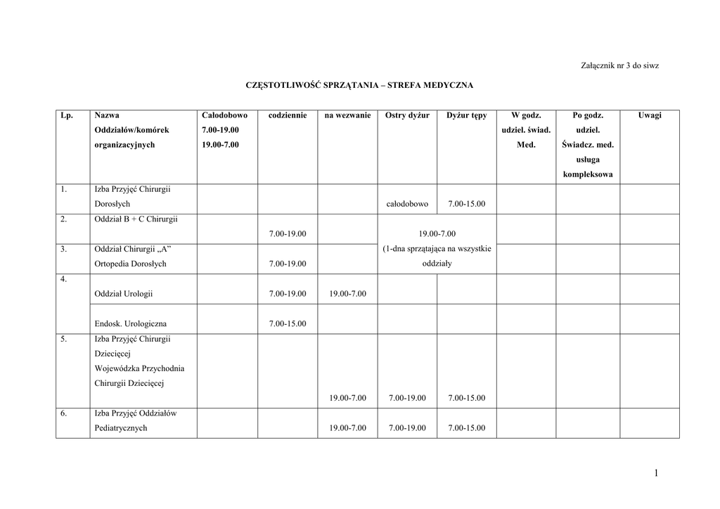 Załącznik nr 3 do siwz CZĘSTOTLIWOŚĆ SPRZĄTANIA – STREFA MEDYCZNA Lp. Nazwa Całodobowo Oddziałów/komórek organizacyjnych codziennie na wezwanie Ostry dyŜur DyŜur tępy W godz. Po godz. 7.00-19.00 udziel. świad. udziel. 19.00-7.00 Med. Świadcz. med. Uwagi usługa kompleksowa 1. Izba Przyjęć Chirurgii Dorosłych 2. całodobowo Oddział B + C Chirurgii 7.00-19.00 3. 7.00-15.00 19.00-7.00 (1-dna sprzątająca na wszystkie Oddział Chirurgii „A” Ortopedia Dorosłych 7.00-19.00 Oddział Urologii 7.00-19.00 Endosk. Urologiczna 7.00-15.00 oddziały 4. 5. 19.00-7.00 Izba Przyjęć Chirurgii Dziecięcej Wojewódzka Przychodnia Chirurgii Dziecięcej 6. 19.00-7.00 7.00-19.00 7.00-15.00 19.00-7.00 7.00-19.00 7.00-15.00 Izba Przyjęć Oddziałów Pediatrycznych 1 7. Oddział Chirurgii, Urologii, Ortopedii i Otolaryngologii Dziecięcej 7.00-19.00 8. 19.00-7.00 Dział Diagnostyki Układu KrąŜenia 9. x Dział Diagnostyki Sobota Laboratoryjnej 10. 7.00-15.00 7.00-11.00 Izba Przyjęć Chorób Oczu, Usługa laryngologia Dorosłych łącznie z Wojewódzką 7.00-19.00 7.00-15.00 na wezwanie na wezwanie Przychodnią po 14.00 Okulistyki i Laryngologii 11. Oddział Intensywnej Terapii x 12. Oddział Chorób Oczu 13. 14. 7.00-19.00 19.00-7.00 7.00-19.00 19.00-7.00 7.00-19.00 19.00-7.00 7.00-19.00 19.00-7.00 Laryngologia Dorosłych Chorób Dzieci i MłodzieŜy 15. Chirurgia Plastyczna 2 16. Laryngologia Dziecięca 7.00-19.00 19.00-7.00 7.00-19.00 19.00-7.00 7.00-15.00 sobota 17. Neurologia Dziecięca 18. Sterylizatornia – CentralnaTlenkiem Etylenu 19. Przychodnia Konsultacyjna dla Kobiet z Prac. Cytol., USG, i Laboratorium oraz Dział. Diag.-Zab. 20. x Pracownia Diagnostyki Poniedziałek – Histopatologicznej i piątek Cytologicznej 21. 7.00-15.00 7.00-19.00 19.00-7.00 7.00-19.00 19.00-7.00 7.00-19.00 19.00-7.00 7.00-19.00 19.00-7.00 Patologia CiąŜy i PołoŜnictwo 23. x Izba Przyjęć Ginekol.PołoŜnicza 22. x Oddział Ginekologiczny 24. Oddział PołoŜ. przy Sali Porodowej 25. x Pododdział Noworodków z Salą Int. Terapii i Nowor. Septycznych 3 26. Izba Przyjęć Interny Szpitalny Oddział Ratunkowy 27. całodobowo 7.00-15.00 19.00-7.00 na wezwanie Oddział Kardilogii z Pododdziałem Reanimacji i Pracownią Kardiologii 7.00-19.00 19.00-7.00 Leczniczej 7.00-19.00 19.00-7.00 I Neurologia 7.00-19.00 Inwazyjnej 28. Oddział Rehabilitacji 29. 30. II Neurologia 31. x Oddział Gasteroenterologii i Przez 4 godz. Chorób Wewnętrznych, obsada stała, Ośrodek Diagnostyki i w pozostałych Leczenia Endoskopowego, Pracownia Endoskopii 32. godz. na 7.00-19.00 19.00-7.00 7.00-19.00 19.00-7.00 7.00-19.00 19.00-7.00 wezwanie I Oddział Endokryn. I Diabetologii Chorób Wewnętrznych 33. II Oddział Chorób Wewnętrzn. i Reumatologii 34. Zakład Diagnostyki Obrazowej - Hole x x 4 35. Dział Rehabilitacji 36. x x x x x x Woj. Przych. Chorób dzieci i Mł., Dział Fizjoterapii Dzieci i MłodzieŜy 37. 7.00-19.00 Woj. Przych. Chirurgiczna poniedziałekpiatek 38. Woj. Przych. Chorób na wezwanie Wewnętrznych 39. x x Woj. Przych. Otolaryngologiczna na wezwanie Woj. Przych. Chorób Oczu x 14.00-22.00 40. Blok Porodowy 41. x Blok Operacyjny Chirurgii Dziecięcej 42. 7.00-16.00 całodobowo 7.00-19.00 7.00-19.00 7.00-15.00 Blok Operacyjny Chirurgii Dorosłych 43. całodobowo Blok Operacyjny godz. 15.00- Otolaryngologii 7.00 w dniach ostrego 7.00-15.00 44. dyŜuru Blok Operacyjny PołoŜniczo-Ginekologiczny 7.00-19.00 na wezwanie 5 45. Blok Operacyjny Chirurgii Plastycznej 7.00-15.00 poniedziałekpiątek 46. Blok Operacyjny Chorób Oczu 7.00-15.00 poniedziałek- 15.00-7.00 piątek osty dyŜur Liczba osób niezbędna do wykonania przedmiotu zamówienia Uwagi Wykonawcy: 6