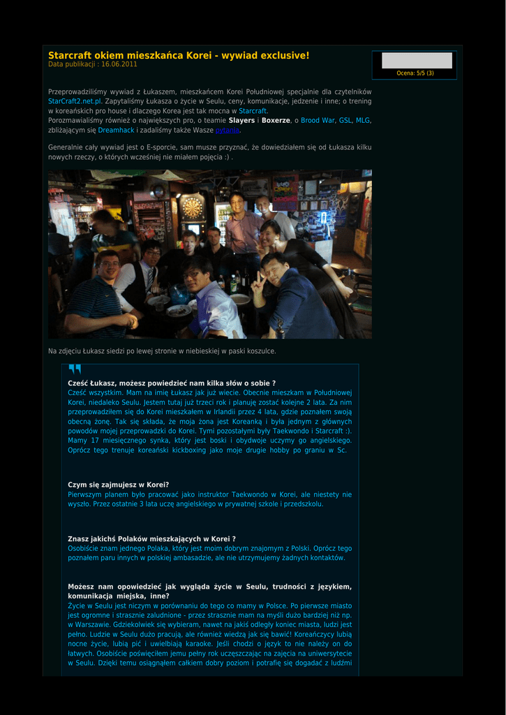 Starcraft okiem mieszkańca Korei - wywiad exclusive! Data publikacji : 16.06.2011 Ocena: 5/5 (3) Przeprowadziliśmy wywiad z Łukaszem, mieszkańcem Korei Południowej specjalnie dla czytelników StarCraft2.net.pl. Zapytaliśmy Łukasza o życie w Seulu, ceny, komunikacje, jedzenie i inne; o trening w koreańskich pro house i dlaczego Korea jest tak mocna w Starcraft. Porozmawialiśmy również o największych pro, o teamie Slayers i Boxerze, o Brood War, GSL, MLG, zbliżającym się Dreamhack i zadaliśmy także Wasze pytania. Generalnie cały wywiad jest o E-sporcie, sam musze przyznać, że dowiedziałem się od Łukasza kilku nowych rzeczy, o których wcześniej nie miałem pojęcia :) . Na zdjęciu Łukasz siedzi po lewej stronie w niebieskiej w paski koszulce. Cześć Łukasz, możesz powiedzieć nam kilka słów o sobie ? Cześć wszystkim. Mam na imię Łukasz jak już wiecie. Obecnie mieszkam w Południowej Korei, niedaleko Seulu. Jestem tutaj już trzeci rok i planuję zostać kolejne 2 lata. Za nim przeprowadziłem się do Korei mieszkałem w Irlandii przez 4 lata, gdzie poznałem swoją obecną żonę. Tak się składa, że moja żona jest Koreanką i była jednym z głównych powodów mojej przeprowadzki do Korei. Tymi pozostałymi były Taekwondo i Starcraft :). Mamy 17 miesięcznego synka, który jest boski i obydwoje uczymy go angielskiego. Oprócz tego trenuje koreański kickboxing jako moje drugie hobby po graniu w Sc. Czym się zajmujesz w Korei? Pierwszym planem było pracować jako instruktor Taekwondo w Korei, ale niestety nie wyszło. Przez ostatnie 3 lata uczę angielskiego w prywatnej szkole i przedszkolu. Znasz jakichś Polaków mieszkających w Korei ? Osobiście znam jednego Polaka, który jest moim dobrym znajomym z Polski. Oprócz tego poznałem paru innych w polskiej ambasadzie, ale nie utrzymujemy żadnych kontaktów. Możesz nam opowiedzieć jak wygląda życie w Seulu, trudności z językiem, komunikacja miejska, inne? Życie w Seulu jest niczym w porównaniu do tego co mamy w Polsce. Po pierwsze miasto jest ogromne i strasznie zaludnione - przez strasznie mam na myśli dużo bardziej niż np. w Warszawie. Gdziekolwiek się wybieram, nawet na jakiś odległy koniec miasta, ludzi jest pełno. Ludzie w Seulu dużo pracują, ale również wiedzą jak się bawić! Koreańczycy lubią nocne życie, lubią pić i uwielbiają karaoke. Jeśli chodzi o język to nie należy on do łatwych. Osobiście poświęciłem jemu pełny rok uczęszczając na zajęcia na uniwersytecie w Seulu. Dzięki temu osiągnąłem całkiem dobry poziom i potrafię się dogadać z ludźmi bez problemów. Komunikacja w Seulu zasługuje na 5. Poza autobusami i metrem, są również bardzo tanie taksówki. Autobusy i metro są bardzo zadbane, komfortowe i niedrogie. Jedynie wolę ich unikać w godzinach szczytu! Ile zarabia przeciętny mieszkaniec Seulu w przeciętnej pracy ? Około 1500$. < Porozmawiajmy trochę o E-sporcie, ile czasu interesujesz się Starcraftem ? Od momentu jak wyszedł w "96 jak się nie mylę. Na jakim nicku można spotkać Cie na Battlenecie i jaką rasą grasz? W Sc BW już nie gram odkąd Sc2 wyszedł. Gram na UnceL na europejskim serwerze i na NosElvinator na KOR. Jaka liga ? :) Top Diament na Euro i Plat na KOR, nie gram dużo bo nie mam czasu ;( Masz porównanie do Bnnetu KR i EU, duża jest różnica ? Z mojej perspektywy to jest różnica i to całkiem spora. Powiedziałbym o ligę w górę na KOR. Daleko masz do studia GOMtv, odwiedzasz je nieraz ? Trochę mam daleko do studia GomTV, około 1,5h do 2h. Nie byłem jeszcze, ale się wybieram w przyszły piątek na mecz FXO w GSTL. Ulubiony team i gracz? Ulubiony team oczywiście SlayerS! Jestem wielkim fanem Boxera i wierzę w jego drużynę! Ulubiony gracz to pewnie MMA i NesTea. Spotkałeś kiedyś jakiegoś pro na ulicy czy w metrze ? Niestety nie :( . ale już niedługo ;p Ale za to raz udało mi się obsować gre NaDa'y, byłem w jego grze, ale przeżycie! hehe Co to była za okazja ? :) Jak wcześniej wspomniałem na KOR gram na NosElvinator. Nos to jest top klan w Korei, poza tymi pro klanami. Mamy graczy którzy są w GM i są znajomymi progamerów takich jak NaDa, YoungHwa, DongReagu itp. Raz załapałem się na showmatch pomiędzy naszym graczem a NaDa. nieźle :) Co myślisz o Artosisie i Tastelessu, rozmawiałeś kiedyś z nimi ? Miałem okazję poznać Artosisa osobiście na spotkaniu TeamLiquid community w Seulu. To akurat były urodziny lilsusie, użytkownika TL. Artosis to spoko gość jak i Tasteless choć nie miałem okazji go poznać osobiście. Według mnie oni tworzą najlepszą drużynę komentatorską w scenie Sc2 Tak zgadzam się, oni są najlepsi! Porozmawiajmy chwile o pro-housach, ile ich może być w Seulu? Zwykły gość pewnie nie ma szans odwiedzić taki house ? Jest ich około 8 albo i więcej. Zazwyczaj jeden prohouse przypada na jeden pro team. Jest możliwość odwiedzenia takiego hous przez Tastosis :) Oni mają dostęp i możliwość 'oprowadzenia'. Co sądzisz o treningu Slayers? Mówi się, że to najbardziej "hardcorowy" house w Korei pod względem treningu. Też tak słyszałem i uważam, że nowy trening przynosi sukces. Gracze są pod stałym nadzorem i muszą przegrać ustaloną ilość gier na danej mapie w danym czasie. Inne prohouse mają więcej luzu i gracze nie muszą starać się tak bardzo w czasie treningu. Popieram styl SlayerSów. Slayers od jakiegoś czasu odnosi duże sukcesy, jeszcze kilka miesięcy temu niewiele osób słyszało o MMA, a co sądzisz o Boxerze na dzień dzisiejszy ? Boxer zawsze był moim idolem jako gracz SC i jako osoba, którą sobą reprezentuje. Po tym jak przestawił się na Sc2 jednak nie odniósł większych sukcesów. Ja ciągle w niego wierzę, ale będąc realistą wątpię żeby wrócił do full time grania jako progamer. Boxer ma teraz ważniejsze i lepsze zadanie - trenować SlayerSów. Jak widzimy do tej pory, Boxer wyn