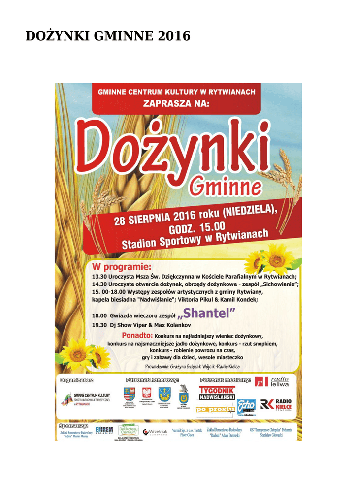 DOŻYNKI GMINNE 2016 Scenariusz ramowy DOŻYNKI 2016 - 28 sierpnia 2016r. 13.30 – 14.30 Uroczysta Msza Św. Dziękczynna w Kościele Parafialnym w Rytwianach 14.30 – 14.40 Przemarsz korowodu dożynkowego na stadion sportowy 14.40 – 15.00 Oficjalne otwarcie dożynek przez Wójta Gminy Rytwiany, powitanie zaproszonych gości i przybyłych mieszkańców. Obrzęd dożynkowy („ Sichowianie”) 15.00 – 15.05 Powołanie przez Wójta Gminy Rytwiany komisji konkursowej na: „Najsmaczniejsze jadło wiejskie”, ( powołanie komisji oceniającej) 15.05 – 15.25 Występ kapeli „Nadwiślanie” 15.25 – 15.35 Występ taneczny dzieci z sekcji tanecznej z GCK 15.35 – 15.50 Występ uczniów ze szkoły podstawowej ze Strzegomia 15.50 – 16.05 Występ solistek z Zespołu Placówek Oświatowych im. Marii Firlejczyk w Sichowie Dużym 16.05 – 16.20 Występ wokalny młodzieży z Zespołu Placówek Oświatowych z Rytwian 16.20 – 16.35 Występ zespołu muzycznego „ Dęciaki 16.35 – 16.50 Występ zespołu muzycznego „Aksam” z GCK. 16.50 – 17.20 Występ Kamila Kondka 17.20 – 18.00 Konkursy - III konkurs „Rzut snopkiem”- ogłoszenie wyników -„Robienie powrozu na czas” (wygrywa ten kto zrobi więcej) Rozstrzygnięcie wszystkich ogłoszonych konkursów: - „ Najładniejszy wieniec dożynkowy” (wręczenie dyplomów) - „Najsmaczniejsze jadło dożynkowe”, ( wręczenie dyplomów) 18.00 – 19.30 Gwiazda wieczoru zespół „Shantel” 19.30 Dyskoteka z DJ Viper & Dj Max Kolakov Gmina Rytwiany - www.rytwiany.com.pl