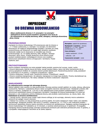 IMPREGNAT DO DREWNA BUDOWLANEGO - Klasa użytkowania drewna 1-3: wewnątrz i na zewnątrz - Zabezpiecza drewno przed owadami i grzybami oraz leczy je - Do stosowania na więźbę dachową, belki, dźwigary, elewacje drewniane, okna, bramy PRZEZNACZENIE Impregnat do drewna budowlanego V33 przeznaczony jest do drewna w 1, 2 i 3 klasie użytkowania, tj. wewnątrz i na zewnątrz, do elementów drewnianych nie mających bezpośredniego kontaktu z gruntem ani wodą powierzchniową, ale narażonych na częste bądź okresowe nawilżanie. Doskonale nadaje się do stosowania na wszystkie typy drewna konstrukcyjnego, np. na więźbę dachową, belki, dźwigary, elewacje drewniane, okna, bramy. Produkt skutecznie chroni drewno przed grzybami podstawczakami rozkładającymi drewno oraz owadami – technicznymi szkodnikami drewna (chrząszczami i termitami). Postać użytkowa: płyn. Narzędzia : pędzel lub spryskiwacz Wydajność 1 warstwa : drewno zdrowe 1L = +/- 5m2, drewno zainfekowane 1L = +/-3m2 Czas schnięcia : - między warstwami : 15 min - całkowity : 12h Czyszczenie narzędzi : woda PRZYGOTOWANIE Drewno poddane impregnacji nie może posiadać żadnej powłoki, powinno być surowe, czyste i suche. • Drewno lakierowane, pokryte lazurą lub farbą: usunąć warstwy lakieru, lazury lub farby mechanicznie lub za pomocą specjalnych środków do usuwania starych powłok lakierniczych. Powierzchnię przemyć wodą, pozostawić do wyschnięcia na 24 godziny, a następnie przeszlifować i odpylić. • Drewno woskowane: usunąć wosk z powierzchni drewna. Przeszlifować i odpylić. • Drewno wcześniej impregnowane: nie zalecamy impregnacji na innego typu produkty. Prosimy skontaktować się z naszym działem technicznym. Nie należy nakładać na drewno woskowane i olejowane. NAKŁADANIE Do zabezpieczenia nowego lub zdrowego drewna: Nałożyć pędzlem dwie warstwy na całą powierzchnię. Pierwszą warstwę nanieść pędzlem na czystą, zdrową, odkurzoną powierzchnię. Pęknięcia i uszkodzenia drewna należy szczególnie starannie zakonserwować. Wydajność produktu 200 ml/m2 (2 warstwy, wydajność ok. 1 l/5 m2) w celu zabezpieczenia przed grzybami podstawczakami i owadami – technicznymi szkodnikami drewna (chrząszczami, termitami). Impregnat do drewna budowlanego V33 może być stosowany w celu zwiększenia ochrony biobójczej drewna, pod produkty wykończeniowe, np. lazurę, lakier, olej. Nakładanie na drewno zainfekowane: 1. Usunąć kruche i stoczone przez owady części drewna szlifując je lub wycinając, elementy mocno uszkodzone wzmocnić lub zastąpić nowym drewnem. 2. Nałożyć trzy warstwy na całą powierzchnię za pomocą pędzla. Do trudno dostępnych miejsc należy użyć pistoletu natryskowego. Wydajność produktu 300 ml/m2 (3 warstwy, wydajność ok. 1 l/ 3 m2) w celu zwalczania owadów – technicznych szkodników drewna (oprócz termitów) na drewnie już zainfekowanym. Następną warstwę Impregnatu do drewna budowlanego V33 nakładamy po 15 minutach, a warstwę wykończeniową po 12 godzinach. W przypadku impregnacji drewna konstrukcyjnego wewnątrz pomieszczeń konieczne jest wietrzenie pomieszczeń przez 72 godziny, a w przypadku niesprzyjających warunków aż do zaniku zapachu. ŚRODKI OSTROŻNOŚCI Zawiera: Propikonazol (PN)((RS)-1-[2-(2,4-dichlorofenylo)-4-propylo-1,3-dioksolan-2-ylometylo]-1H- -1,2,4-triazol. Może powodować wystąpienie reakcji alergicznej. Środki ostrożności: R50/53 Działa bardzo toksycznie na organizmy wodne; może powodować długo utrzymujące się zmiany w środowisku wodnym. S2 Chronić przed dziećmi. S23 Nie wdychać pary. S24/25 Unikać zanieczyszczenia oczu i skóry. S29 Nie wprowadzać do kanalizacji. S37/39 Nosić odpowiednie rękawice i okulary lub ochronę twarzy. S46 W razie połknięcia niezwłocznie zasięgnąć porady lekarza – pokazać opakowanie lub etykietę. S51 Stosować wyłącznie w dobrze wentylowanych pomieszczeniach. Środki ostrożności dotyczące bezpiecznego postepowania: Unikać zanieczyszczenia oczu. Unikać zanieczyszczenia skóry. Nie wdychać par, gazów, rozpylonej cieczy. Nosić odpowiednie środki ochrony indywidualnej. Postępować zgodnie z zaleceniami podanymi w instrukcji technicznej produktu i w karcie charakterystyki. Nie jeść, nie pic, nie palic tytoniu ani nie przechowywać żywności w pomieszczeniach roboczych. Zanieczyszczoną odzież niezwłocznie zdjąć i uprać przed ponownym użyciem. Warunki bezpiecznego magazynowania: Przechowywać w szczelnie zamkniętym, oryginalnym pojemniku. Nie dopuszczać osób postronnych. Po użyciu szczelnie zamykać pojemnik i ustawiać w pozycji pionowej w celu uniknięcia wycieków produktu. Nie przechowywać z żywnością, napojami i paszą. Postępowanie z odpadami: Nie usuwać do kanalizacji. Opróżnione opakowania przekazać do firmy zajmującej się recyklingiem odpadów. Nieczyszczone opakowania oraz resztki produktu przekazać do firmy zajmującej się utylizacją bądź składowaniem lub spaleniem w odpowiednich instalacjach. UWAGA: Ryzyko samoistnego zapalenia tkanin i narzędzi zabrudzonych produktem. Poddawać likwidacji w hermetycznie zamkniętym opakowaniu. Pierwsza pomoc: W przypadku zatrucia lub podejrzenia o zatrucie zapewnić poszkodowanemu pomoc lekarską. Wdychanie: Osobę poszkodowaną wyprowadzić na świeże powietrze, zapewnić ciepło i spokój. Kontakt ze skórą: Skórę umyć dużą ilością wody z mydłem lub innym łagodnym środkiem myjącym i starannie spłukać. Kontakt z oczami: Usunąć soczewki kontaktowe, jeśli są. Przy podwiniętych powiekach niezwłocznie przemyć oczy duża ilością czystej bieżącej wody. Połkniecie: Przepłukać usta wodą w przypadku połknięcia mniejszej ilości produktu. Nie wywoływać wymiotów bez uprzedniego zalecenia przez lekarza. Osobie nieprzytomnej nie podawać żadnych środków doustnie. Zasięgnąć porady lekarza i przedstawić etykietę produktu. Skutki ubo