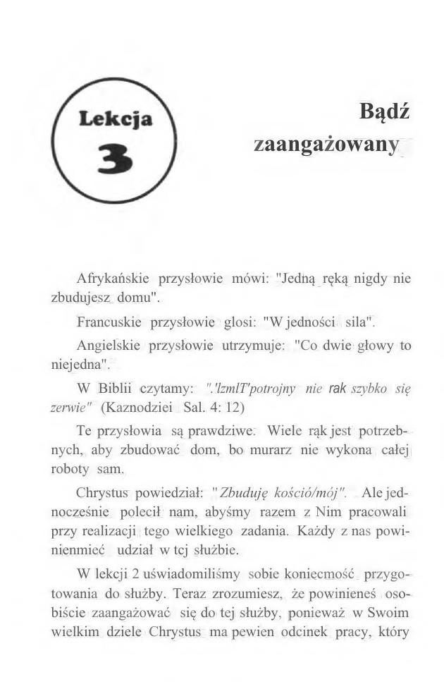 Bądź zaangażowany Afrykańskie przysłowie mówi: "Jedną ręką nigdy nie zbudujesz domu". Francuskie przysłowie glosi: "W jedności sila". Angielskie przysłowie utrzymuje: "Co dwie głowy to niejedna". W Biblii czytamy: ".'lzmlT'potrojny nie rak szybko się zerwie" (Kaznodziei Sal. 4: 12) Te przysłowia są prawdziwe. Wiele rąk jest potrzebnych, aby zbudować dom, bo murarz nie wykona całej roboty sam. Chrystus powiedział: " Zbuduję kośció/mój". Ale jednocześnie polecił nam, abyśmy razem z Nim pracowali przy realizacji tego wielkiego zadania. Każdy z nas powinienmieć udział w tcj służbie. W lekcji 2 uświadomiliśmy sobie koniecmość przygotowania do służby. Teraz zrozumiesz, że powinieneś osobiście zaangażować się do tej służby, ponieważ w Swoim wielkim dziele Chrystus ma pewien odcinek pracy, który jest przeznaczony do wykonania przez ciebie! Niech Bóg błogosławi cię podczas nauki! W tej lekcji będziesz uczyć się o tym, jak: Być posłusznym Być solą Być odpowiedzialnym Być zaangażowanym Ta lekcja pozwoli ci: • Opisać, w jaki sposób możesz być zaangażowany w indywidualnej ewangelizacji. • Zrozumieć.jak ważnejest posłuszeństwo i odpowiedzialność w indywidualnej ewangelizacji. 42 Ewangelizacja RYC POSŁUSZNYM Cel I. Wyjaśnij ważność posłuszeństwa niu świadectwa. przy składa- Zapewne pamiętasz, gdy mówiliśmy o uroczystości weselnej, podczas której Jezus przemienił wodę w wino. Wierzę, że rada, którą dała sługom Maria, matka Jezusa, może być mottem życia każdego chrześcijanina. Powiedziała ona: "Co walii powie, czyńcie!" (Jan 2:5). Dopóki nie będziesz posłusznym i nie zaangażujesz się osobiście, nie osiągniesz sukcesu w indywidualnej ewangelizacji. Jest prawdą, że zostaliśmy posłani na cały świat. Rozkazem Chrystusa dla ciebie i dla mnie jest głoszenie dobrej nowiny. Jaka będzie twoja odpowiedź na to wezwanie? Dlaczego Filip opuścił Samarię, miejsce wielkiego przebudzenia i poszedł na odludną pustynię? Ponieważ tak kazał mu Pan. Bóg żądał, a on był Mu posłuszny (Dzieje Ap. 8:26). Dlaczego Abraham opuścił swój kraj, swoich przyjaciół i swoją ziemię idąc do nieznanego miejsca? Zrobi! to, ponieważ tak kazał mu Pan (I Mojżeszowa 12:I). Dlaczego zabrał swojego jedynego syna, którego tak bardzo kochał, aby złożyć go na ofiarę całopalenia Bogu? Być może wtedy nie rozumiał jeszcze przyczyny, dla której otrzymał to polecenie. Ale ponieważ Bóg mu kazał, był Bogu posłuszny (I Mojżeszowa 22:9-1 O). Bodź zaangażowany 43 Przez wieki wielu ludzi znosiło cierpienia, ponieważ byli posłuszni Chrystusowi. Wielu z nich wybrało raczej śmierć, a nie wyparli się Chrystusa. Ich zasadą było całkowite posłuszeństwo Bogu. Biblia porównuje nas do żołnierzy (2Tymoteusz 2:3). Chrystus jest naszym wodzem. Jako żolnierze Chrystusa winniśmy być całkowicie posłuszni swojemu Panu. Jeśli żołnierz nie jest posłuszny swojemu dowódcy, bitwa zostanie przegrana. Posłuszeństwo jest kluczem do zwycięstwa każdej armii' ZADANIE DLA CIEBIE 1 Jaką zasadę postępowania powinien przestrzegać każdy chrześcijanin prowadzący indywidualną ewangelizację? (Wybierz jedną odpowiedź). a) Postępować tak. jak wydaje się najrozsądniej. b) Postępować tak, jak nam mówi Chrystus. c) Postępować tak, aby dotrzeć do większości ludzi. 2 Chrześcijanin jest jak żołnierz, gdy: a) jest calkowicie posłuszny. b)jest posłuszny rozkazom, które są dla niego zrozumiałc. c) unika dróg związanych z cierpieniem. Ewangelizacja 3 Czego możemy się spodziewać, gdy jesteśmy posłuszni'? . BYC SOLĄ Cel 2. Wska::postępowanie. przez które charakter chrześcijanina jest podobny do działania soli. Zanim możemy coś naprawdę zrobić dla Chrystusa, musimy być tacy, jakimi On chce, abyśmy byli. Mamy być świadkami. Takie świadectwo uzyskujemy nie tylko przez czynienie, ale przede wszystkim przez bycie. Świadczenie to nie tylko nasza praca, ale to postępowanie wynikające z charakteru. Oto dlaczego Jezus powiedział do swoich uczniów: .. Wyjestescie solą ziemi" (Mateusz 5: 13). Dlaczego Jezus porównał ich do soli? Otóż jak wiesz. sól ma różne zastosowania. Chciałbym ci powiedzieć o niektórych z nich w naszym kraju. Sól jednoczy, W moim kraju, w Górnej Wolcie w Afryce, sól jest używana jako symbol zjednoczenia dwóch ludzi, dwóch rodzin, czy nawet dwóch plemion. Zanim młody mężczyzna ożeni się, daje rodzicom swojej narzeczonej symboliczny podarunek - sól. W ten sposób ich związek zostaje przypieczętowany. Jezus uczynił nas solą, abyśmy w ten sam sposób mogli łączyć ludzi z BogIem. Bad: zaangażowany -15 Sól Morz)' przyjain. Sól była jednym z pierwszych prezentów ofiarowanych przez białych odkrywców, w celu pozyskania przyjaźni afrykańskich wodzów. Grzech zmienia wszystkich ludzi w nieprzyjaciół Boga. My jesteśmy Jego solą, która ma doprowadzić ich z powrotem do Boga. Sól czyni pokój. Mój dziadek miał agresywnego byka. Byk tak bódł ostrymi rogami, że nikt nie mógł nawet przejść obok niego. Ale mój dziadek znał sekret. Gdy chciał podejść blisko byka, trzymał bryłkę soli w swoim ręku. Byk widząc sól podchodził do mojego dziadka jak jagnię. Jezus posłał nas na ziemię, abyśmy czynili pokój. Jeśli ludzie zauważą, że troszczymy się o ich potrzeby, wówczas będziemy mogli nieść im pokój Boży. 46 Ewangelizacja Sól zabezpiecza. Na całym świecie, a zwłaszcza w krajach rozwijających się, sól jest stosowana do zabezpieczania mięsa przed psuciem się. Gdyby Bóg nie dodał soli do morza, ludzie nie mogliby żyć na ziemi. W wodzie byłoby zbyt wiele zanieczyszczeń. Nasza obecność.jako soli Bożej, ma zabezpieczać ludzi przed grzechem poprzez głoszenie o Jezusie Chrystusie i zwycięskiej mocy w Nim. Sól dodaje smaku. Gdy Jezus porównuje nas do soli, to daje do zrozumienia,