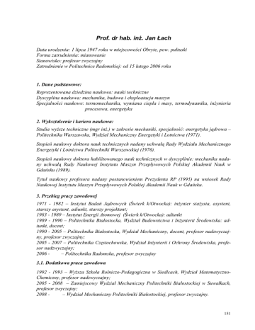 Prof. dr hab. inż. Jan Łach Data urodzenia: 1 lipca 1947 roku w miejscowości Obryte, pow. pułtuski Forma zatrudnienia: mianowanie Stanowisko: profesor zwyczajny Zatrudnienie w Politechnice Radomskiej: od 15 lutego 2006 roku 1. Dane podstawowe: Reprezentowana dziedzina naukowa: nauki techniczne Dyscyplina naukowa: mechanika, budowa i eksploatacja maszyn Specjalności naukowe: termomechanika, wymiana ciepła i masy, termodynamika, inżynieria procesowa, energetyka 2. Wykształcenie i kariera naukowa: Studia wyższe techniczne (mgr inż.) w zakresie mechaniki, specjalność: energetyka jądrowa – Politechnika Warszawska, Wydział Mechaniczny Energetyki i Lotnictwa (1971). Stopień naukowy doktora nauk technicznych nadany uchwałą Rady Wydziału Mechanicznego Energetyki i Lotnictwa Politechniki Warszawskiej (1976). Stopień naukowy doktora habilitowanego nauk technicznych w dyscyplinie: mechanika nadany uchwałą Rady Naukowej Instytutu Maszyn Przepływowych Polskiej Akademii Nauk w Gdańsku (1989). Tytuł naukowy profesora nadany postanowieniem Prezydenta RP (1995) na wniosek Rady Naukowej Instytutu Maszyn Przepływowych Polskiej Akademii Nauk w Gdańsku. 3. Przebieg pracy zawodowej 1971 - 1982 – Instytut Badań Jądrowych (Świerk k/Otwocka): inżynier stażysta, asystent, starszy asystent, adiunkt, starszy projektant; 1983 - 1989 – Instytut Energii Atomowej (Świerk k/Otwocka): adiunkt 1989 - 1990 – Politechnika Białostocka, Wydział Budownictwa i Inżynierii Środowiska: adiunkt, docent; 1990 - 2005 – Politechnika Białostocka, Wydział Mechaniczny, docent, profesor nadzwyczajny, profesor zwyczajny; 2005 - 2007 – Politechnika Częstochowska, Wydział Inżynierii i Ochrony Środowiska, profesor nadzwyczajny; 2006 – Politechnika Radomska, profesor zwyczajny 3.1. Dodatkowa praca zawodowa 1992 - 1993 – Wyższa Szkoła Rolniczo-Pedagogiczna w Siedlcach, Wydział MatematycznoChemiczny, profesor nadzwyczajny; 2005 - 2008 – Zamiejscowy Wydział Mechaniczny Politechniki Białostockiej w Suwałkach, profesor zwyczajny; 2008 – Wydział Mechaniczny Politechniki Białostockiej, profesor zwyczajny. 151 3.2. Staże i wyjazdy zagraniczne: 1. Centre d’Ètudes Nuléaires (Services des Piles), Saclay, Francja (1980 – 1982); 2. City University, London, Wielka Brytania (1995); 3. Liczne, kilku – bądź kilkunastodniowe – wyjazdy służbowe i na konferencje naukowe do wielu krajów, w tym w charakterze przedstawiciela Polski. 4. Zajmowane stanowiska: 1992 - 2005 – kierownik Katedry Termodynamiki i Mechaniki Płynów na Wydziale Mechanicznym Politechniki Białostockiej; 1994 - 1999 – dziekan Wydziału Mechanicznego Politechniki Białostockiej; 2008 – dyrektor Instytutu Mechaniki Stosowanej na Wydziale Mechanicznym Politechniki Radomskiej. 5. Pełnione funkcje: 1973 - 1980 – sekretarz Komisji Wydawniczej Raportów Instytutu Badań Jądrowych; 1990 -2002 – członek Senatu Politechniki Białostockiej, w tym: przewodniczący Senackiej Komisji ds. Organizacji i Zarządzania (1996 – 1999), Wydawnictw (1999 – 2002), Studenckich i Dydaktyki (2001 – 2002); 1993 - 1996 – redaktor Zeszytów Naukowych Politechniki Białostockiej, seria: Mechanika; 1995 - 2000 – członek Sekcji Energetyki (T-10B) przy Zespole Elektrotechniki, Energetyki i Metrologii (T-10) Komitetu Badań Naukowych w konkursach: XII, XIII, XIV i XIX; 2000 - 2002 – przewodniczący Sekcji Energetyki (T-10B) przy Zespole Elektrotechniki, Energetyki i Metrologii (T-10) Komitetu Badań Naukowych w konkursach: XX, XXI i XXII; 2002 - 2005 – redaktor Zeszytów Naukowych Politechniki Białostockiej, seria: Mechanika; 2005 - 2008 – przewodniczący bądź członek Zespołu Recenzentów w konkursach projektów badawczych własnych i rozwojowych. 6. Dorobek naukowy: Działalność naukowo-badawcza koncentrowała bądź koncentruje się na takich zagadnieniach, jak: wymiana ciepła i masy w układach o geometrii typowej dla techniki reaktorowej, przybliżone metody analityczne i numeryczne w wymianie ciepła i masy; adaptacja, modyfikacja i implementacja dużych kodów obliczeniowych do analizy zjawisk cieplnoprzepływowych w siłowniach z reaktorami jądrowymi; analizy bezpieczeństwa reaktorowych instalacji doświadczalnych; dynamika wymienników ciepła i masy, efektywne narzędzia obliczeniowe do konstrukcji rozwiązań różnych modeli procesów wymiany ciepła, agregaty absorpcyjne, odnawialne źródła energii, ekologiczna gospodarka energią, spalanie, gospodarka odpadami, paliwa z odpadów. Oryginalne opublikowane prace twórcze (autor lub współautor), to: podręczniki akademickie (3), monografie studia i rozprawy (7), rozdziały w monografiach i poradnikach (3), artykuły w czasopismach z tzw. listy filadelfijskiej (12) oraz liczne artykuły w periodykach PAN, w innych czasopismach recenzowanych o zasięgu krajowym, recenzowane referaty opublikowane w materiałach konferencji międzynarodowych i krajowych (głównie pod patronatem PAN), konferencji naukowo-technicznych. Oryginalne nie opublikowane prace twórcze (autor lub współautor), to przede wszystkim sprawozdania z realizowanych prac badawczo-rozwojowych, prac własnych i statutowych, projektów badawczych i prac projektowych. 152 Udział – w charakterze przewodniczącego bądź członka – w pracach 15 Komitetów Naukowych konferencji krajowych i międzynarodowych oraz w 20 Komitetów Organizacyjnych. 7. Osiągnięcia w kształceniu kadry naukowej: Promotor pięciu zakończonych rozpraw doktorskich (2 w dyscyplinie: mechanika, 2 w dyscyplinie: budowa i eksploatacja maszyn, 1 w dyscyplinie: inżynieria środowiska), w tym dwóch z wyróżnieniem, które były przeprowadzane przez: Radę Wydziału Mechanicznego Politechniki Białostockiej (1), Radę Naukową Instytutu Maszyn Przepływowych Polskiej Akademii Nauk w Gdańsku (2), Radę Wydziału Mechanicznego Politechniki Łódzkiej (1), Radę Wydziału Inżynierii Środowiska i Energetyki Po