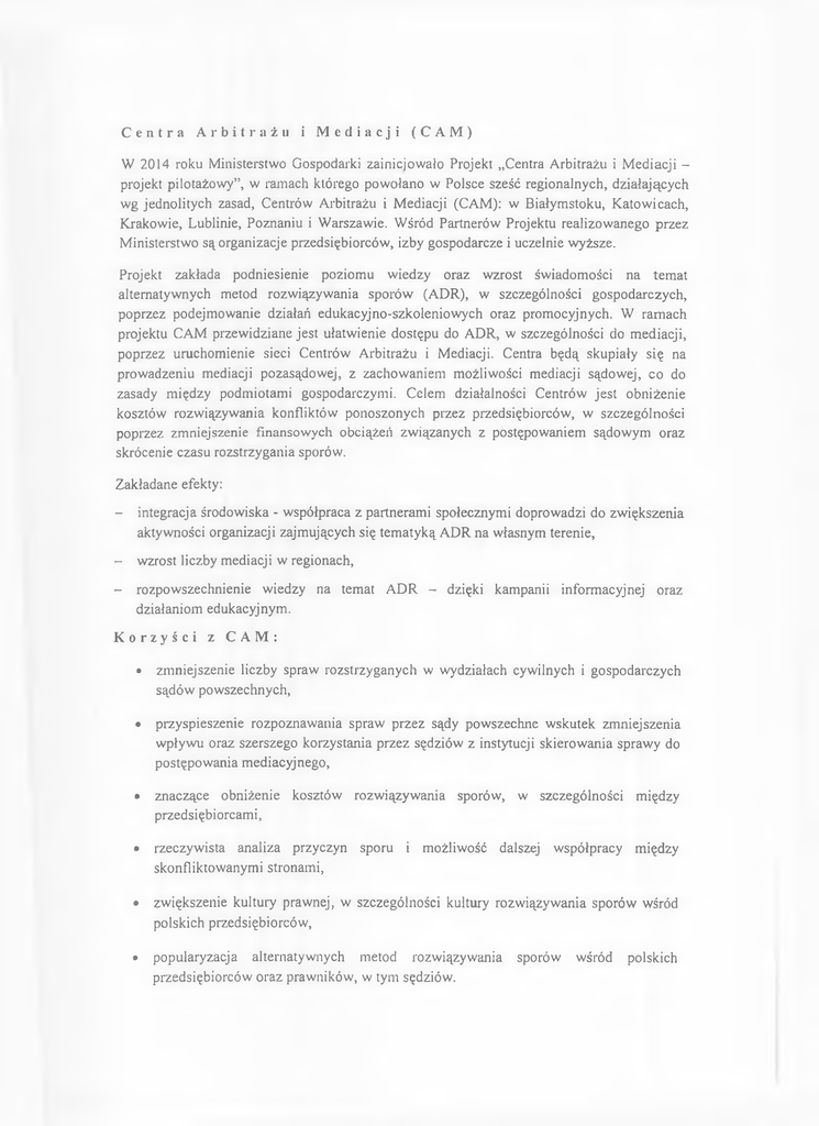 Centra Arbitrażu i Mediacji (C A M ) W 2014 roku M inisterstwo Gospodarki zainicjow ało Projekt „Centra A rbitrażu i M ediacji projekt pilotażow y”, w ramach którego pow ołano w Polsce sześć regionalnych, działających wg jednolitych zasad, Centrów Arbitrażu i M ediacji (CAM ): w Białym stoku, K atow icach, Krakowie, Lublinie, Poznaniu i W arszawie. W śród Partnerów Projektu realizow anego przez M inisterstw o są organizacje przedsiębiorców , izby gospodarcze i uczelnie wyższe. Projekt zakłada podniesienie poziom u wiedzy oraz wzrost świadomości na tem at alternatyw nych metod rozw iązyw ania sporów (ADR), w szczególności gospodarczych, poprzez podejm owanie działań edukacyjno-szkoleniow ych oraz promocyjnych. W ram ach projektu CAM przew idziane jest ułatwienie dostępu do ADR, w szczególności do m ediacji, poprzez uruchom ienie sieci Centrów A rbitrażu i Mediacji. Centra będą skupiały się na prow adzeniu mediacji pozasądow ej, z zachow aniem m ożliwości mediacji sądowej, co do zasady m iędzy podm iotam i gospodarczymi. Celem działalności Centrów jest obniżenie kosztów rozw iązywania konfliktów ponoszonych przez przedsiębiorców , w szczególności poprzez zmniejszenie finansowych obciążeń związanych z postępow aniem sądowym oraz skrócenie czasu rozstrzygania sporów. Zakładane efekty: - integracja środow iska - współpraca z partneram i społecznym i doprowadzi do zw iększenia aktywności organizacji zajm ujących się tem atyką AD R na własnym terenie, - wzrost liczby m ediacji w regionach, - rozpow szechnienie wiedzy na temat AD R działaniom edukacyjnym. Korzyści • dzięki kampanii informacyjnej oraz z CAM: zm niejszenie liczby spraw rozstrzyganych w wydziałach cywilnych i gospodarczych sądów powszechnych, • przyspieszenie rozpoznaw ania spraw przez sądy pow szechne w skutek zm niejszenia w pływu oraz szerszego korzystania przez sędziów z instytucji skierow ania spraw y do postępow ania m ediacyjnego, • znaczące obniżenie przedsiębiorcam i, kosztów • rzeczyw ista przyczyn analiza rozw iązyw ania sporu sporów, i m ożliwość w szczególności dalszej współpracy między między skonfliktow anym i stronam i, • zw iększenie kultury prawnej, w szczególności kultury rozw iązyw ania sporów wśród polskich przedsiębiorców , • popularyzacja alternatyw nych metod rozw iązywania przedsiębiorców oraz praw ników , w tym sędziów. sporów wśród polskich