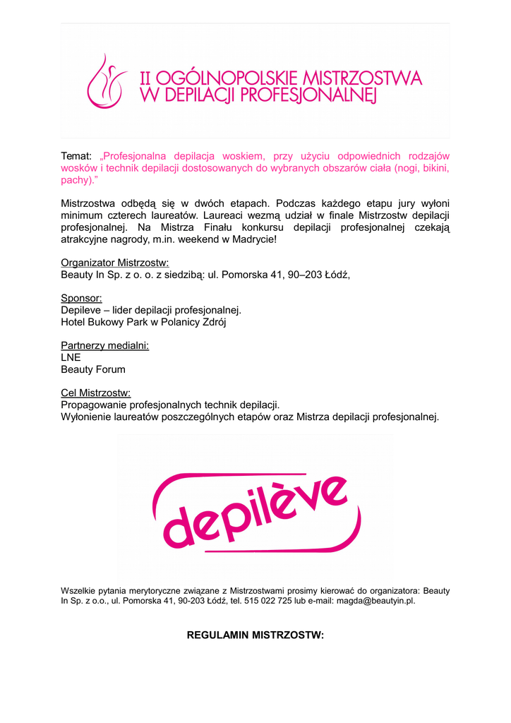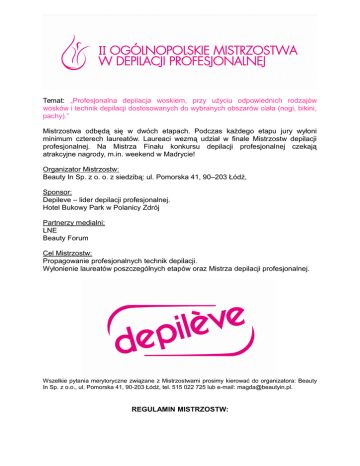 Temat: „Profesjonalna depilacja woskiem, przy użyciu odpowiednich rodzajów wosków i technik depilacji dostosowanych do wybranych obszarów ciała (nogi, bikini, pachy).” Mistrzostwa odbędą się w dwóch etapach. Podczas każdego etapu jury wyłoni minimum czterech laureatów. Laureaci wezmą udział w finale Mistrzostw depilacji profesjonalnej. Na Mistrza Finału konkursu depilacji profesjonalnej czekają atrakcyjne nagrody, m.in. weekend w Madrycie! Organizator Mistrzostw: Beauty In Sp. z o. o. z siedzibą: ul. Pomorska 41, 90–203 Łódź, Sponsor: Depileve – lider depilacji profesjonalnej. Hotel Bukowy Park w Polanicy Zdrój Partnerzy medialni: LNE Beauty Forum Cel Mistrzostw: Propagowanie profesjonalnych technik depilacji. Wyłonienie laureatów poszczególnych etapów oraz Mistrza depilacji profesjonalnej. Wszelkie pytania merytoryczne związane z Mistrzostwami prosimy kierować do organizatora: Beauty In Sp. z o.o., ul. Pomorska 41, 90-203 Łódź, tel. 515 022 725 lub e-mail: [email protected]. REGULAMIN MISTRZOSTW: Pierwszy etap Mistrzostw odbędzie się na 30. Międzynarodowym Kongresie i Targach Kosmetycznych LNE & SPA w Krakowie (15.11.2014r., w Międzynarodowym Centrum TargowoKongresowym EXPO Kraków). Zgłoszenia do I etapu przyjmowane są do dnia 10.11.2014r. Drugi etap Mistrzostw odbędzie się na 18. Międzynarodowych Targach Beauty Forum w Warszawie (7.03.2014r., w Centrum Targowo Kongresowym MT Polska). Zgłoszenia do II etapu przyjmowane są do dnia 27.02.2015r. Finał Mistrzostw odbędzie się na 31. Międzynarodowym Kongresie i Targach Kosmetycznych LNE & SPA w Krakowie (18.04.2015r., w Międzynarodowym Centrum Targowo-Kongresowym EXPO Kraków). 1. WARUNKI KONKURSU a) Mistrzostwa obejmują profesjonalną depilację następujących obszarów: - bikini (pełne lub częściowe) - pachy - łydki b) Podczas konkursu uczestnicy wykorzystują technikę paskową i bezpaskową. c) Uczestnicy korzystają z wosków miękkich i Film Wax. d) Każdy uczestnik zaprasza swoją modelkę przygotowaną do przeprowadzenia profesjonalnej depilacji. e) Technika i rodzaj wosku dobierany jest do rodzaju skóry i włosów modelki 2. NAGRODY a) W poszczególnych etapach jury wyłoni laureatów I–go, II–go, III–go i IV-ego miejsca. I MIEJSCE Certyfikat za zajęcie 1-ego miejsca w danym etapie Konkursu Kwalifikacja do finału II Ogólnopolskich Mistrzostw w Depilacji Profesjonalnej Pakiet Weekendowy dla 2 osób (2 noclegi ze śniadaniem – dla dwóch osób, wraz zabiegiem pielęgnacyjnym) w ekskluzywnym SPA Zestaw urządzeń, akcesoriów i kosmetyków do depilacji profesjonalnej marki Depileve o wartości 1500 PLN. Promocja laureata w pismach branżowych oraz na stronach: www.beautyin.pl, www.depilevepolska.pl II MIEJSCE Certyfikat za zajęcie 2-ego miejsca w danym etapie Konkursu Kwalifikacja do finału II Ogólnopolskich Mistrzostw w Depilacji Profesjonalnej Zestaw akcesoriów i kosmetyków do depilacji profesjonalnej marki Depileve o wartości 1000 PLN. Promocja laureata w pismach branżowych oraz na stronach: www.beautyin.pl, www.depilevepolska.pl III MIEJSCE Certyfikat za zajęcie 3- ego miejsca w danym etapie Konkursu Kwalifikacja do finału II Ogólnopolskich Mistrzostw w Depilacji Profesjonalnej Zestaw kosmetyków do depilacji profesjonalnej marki Depileve o wartości 500 PLN. Promocja laureata w pismach branżowych oraz na stronach: www.beautyin.pl, www.depilevepolska.pl IV MIEJSCE Certyfikat za zajęcie 4- ego miejsca w danym etapie Konkursu Kwalifikacja do finału II Ogólnopolskich Mistrzostw w Depilacji Profesjonalnej Bon o wartości 200zł na zakupy marki Depileve w firmie Beauty In. b) Nagrody Wielkiego Finału: I MIEJSCE Certyfikat Mistrza Depilacji 2015. Weekend dla dwóch osób w Madrycie oraz odwiedzenie siedziby marki Depileve. Stolik kosmetyczny marki Depileve. Promocja laureata w pismach branżowych oraz na stronach: www.beautyin.pl, www.depilevepolska.pl. II MIEJSCE Certyfikat za zajęcie 2-ego miejsca w Finale Mistrzostw. Stolik kosmetyczny marki Depileve oraz bon o wartości 200zł na zakupy marki Depileve w firmie Beauty In. Promocja laureata w pismach branżowych oraz na stronach: www.beautyin.pl, www.depilevepolska.pl III MIEJSCE Certyfikat za zajęcie 3- ego miejsca w Finale Mistrzostw. Stolik kosmetyczny marki Depileve. Promocja laureata w pismach branżowych oraz www.depilevepolska.pl. na stronach: www.beautyin.pl, 3. UCZESTNICY Warunkiem uczestnictwa w konkursie jest: - posiadanie dyplomu ukończenia szkoły kosmetycznej - min. 2-letnie doświadczenie w zawodzie kosmetyczki - znajomość paskowej i bezpaskowej techniki depilacji 4. ELIMINACJE a) Warunkiem uczestnictwa w konkursie jest przesłanie na adres e–mail: [email protected] następujących dokumentów: - formularz zgłoszeniowy - zgoda na przetwarzanie danych osobowych - kopię dyplomu ukończenia szkoły lub uczelni o profilu kosmetycznym - zgodę na publikację wizerunku uczestnika Mistrzostw oraz jego modelki b) Zgłoszenia przyjmowane są do: I etap do 10.11.2014 r., II etap do 27.02.2015r. c) Organizatorzy nie zwracają nadesłanych dokumentów 5. KRYTERIA OCENY W ELIMINACJACH a) Na podstawie nadesłanych dokumentów jury wyłoni 12-stu uczestników, którzy wezmą udział w poszczególnych etapach Mistrzostw. b) Głównym kryterium kwalifikacji jest staż wykonywania depilacji, znajomość techniki przy użyciu pasków i metody bezpaskowej oraz kolejność nadsyłania zgłoszeń. 6. ORGANIZATOR MISTRZOSTW ZAPEWNIA: a) wejście na Kongres/Targi uczestnika i modelki, b) miejsce do przygotowania modelki do depilacji, c) stanowiska do depilacji (fotele kosmetyczne, stoliki zabiegowe, urządzenia, akcesoria, woski i kosmetyki do depilacji), 7. POZOSTAŁE INFORMACJE: a) Organizator nie zwraca kosztów poniesionych przez uczestnika i modelkę w związku z udziałem w Mistrzostwach. b) Numery startującym uczestnikom przyznawane są w drodze losowania. c) Każdy z jurorów i uczestników