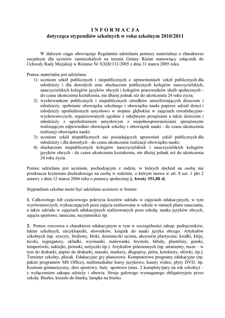 INFORMACJA dotycząca stypendiów szkolnych w roku szkolnym 2010/2011 W dalszym ciągu obowiązuje Regulamin udzielania pomocy materialnej o charakterze socjalnym dla uczniów zamieszkałych na terenie Gminy RóŜan stanowiący załącznik do Uchwały Rady Miejskiej w RóŜanie Nr XXIII/131/2005 z dnia 31 marca 2005 roku. Pomoc materialna jest udzielana: 1) uczniom szkół publicznych i niepublicznych o uprawnieniach szkół publicznych dla młodzieŜy i dla dorosłych oraz słuchaczom publicznych kolegiów nauczycielskich, nauczycielskich kolegiów języków obcych i kolegiów pracowników słuŜb społecznych do czasu ukończenia kształcenia, nie dłuŜej jednak niŜ do ukończenia 24 roku Ŝycia; 2) wychowankom publicznych i niepublicznych ośrodków umoŜliwiających dzieciom i młodzieŜy, spełnianie obowiązku szkolnego i obowiązku nauki poprzez udział dzieci i młodzieŜy upośledzonych umysłowo w stopniu głębokim w zajęciach rewalidacyjnowychowawczych, organizowanych zgodnie z odrębnymi przepisami a takŜe dzieciom i młodzieŜy z upośledzeniem umysłowym z niepełnosprawnościami sprzęŜonymi realizującym odpowiednio obowiązek szkolny i obowiązek nauki - do czasu ukończenia realizacji obowiązku nauki; 3) uczniom szkół niepublicznych nie posiadających uprawnień szkół publicznych dla młodzieŜy i dla dorosłych - do czasu ukończenia realizacji obowiązku nauki; 4) słuchaczom niepublicznych kolegiów nauczycielskich i nauczycielskich kolegiów języków obcych - do czasu ukończenia kształcenia, nie dłuŜej jednak niŜ do ukończenia 24 roku Ŝycia. Pomoc udzielana jest uczniom, pochodzącym z rodzin, w których dochód na osobę nie przekracza kryterium dochodowego na osobę w rodzinie, o którym mowa w art. 8 ust. 1 pkt 2 ustawy z dnia 12 marca 2004 roku o pomocy społecznej tj. kwoty 351,00 zł. Stypendium szkolne moŜe być udzielane uczniowi w formie: 1. Całkowitego lub częściowego pokrycia kosztów udziału w zajęciach edukacyjnych, w tym wyrównawczych, wykraczających poza zajęcia realizowane w szkole w ramach planu nauczania, a takŜe udziału w zajęciach edukacyjnych realizowanych poza szkołą: nauka języków obcych, zajęcia sportowe, taneczne, recytatorskie itp. 2. Pomoc rzeczowa o charakterze edukacyjnym w tym w szczególności zakup: podręczników, lektur szkolnych, encyklopedii, słowników, ksiąŜek do nauki języka obcego. Artykułów szkolnych (np. zeszyty, bruliony, bloki, dzienniczki ucznia, akcesoria plastyczne, kredki, kleje, teczki, segregatory, okładki, wycinanki, malowanki, brystole, bibuły, plasteliny, gumki, temperówki, naklejki, piórniki, noŜyczki itp.). Artykułów piśmiennych (np. atramenty, tusze – w tym do drukarki, papier do drukarki, mazaki, markery, długopisy, pióra, korektory, ołówki, itp.). Tornister szkolny, plecak. Edukacyjne gry planszowe. Komputerowe programy edukacyjne (np. pakiet programów MS Office), multimedialne kursy językowe, kasety wideo, płyty DVD, itp. Kostium gimnastyczny, dres sportowy, buty sportowe (max. 2 komplety/pary na rok szkolny) – z wyłączeniem zakupu odzieŜy i obuwia. Stroju galowego wymaganego obligatoryjnie przez szkołę. Biurko, krzesło do biurka, lampka na biurko. 3. Całkowitego lub częściowego pokrycia kosztów związanych z pobieraniem nauki poza miejscem zamieszkania ucznia szkół ponadgimnazjalnych oraz słuchaczy kolegiów nauczycielskich, nauczycielskich kolegiów języków obcych, kolegium pracowników słuŜb społecznych. Stypendium szkolne jest przyznawane na wniosek rodziców albo pełnoletniego ucznia, po zasięgnięciu opinii dyrektora szkoły (kolegium nauczycielskiego, nauczycielskiego kolegium języków obcych, kolegium pracowników słuŜb społecznych lub ośrodka), na wniosek odpowiednio dyrektora szkoły, kolegiów lub ośrodka, a takŜe z urzędu. Wniosek o przyznanie stypendium składa się w Urzędzie Gminy pokój Nr 39 w terminie do dnia 15 września 2010 roku a w przypadku kolegiów do dnia 15 października 2010 roku. Stypendium szkolne jest przyznawane na okres od września do czerwca w danym roku szkolnym, a w przypadku słuchaczy kolegiów nauczycielskich, nauczycielskich kolegiów języków obcych i kolegiów pracowników słuŜb społecznych na okres nie dłuŜszy niŜ od października do czerwca w danym roku szkolnym. Burmistrz Gminy (-) Jerzy Parciński