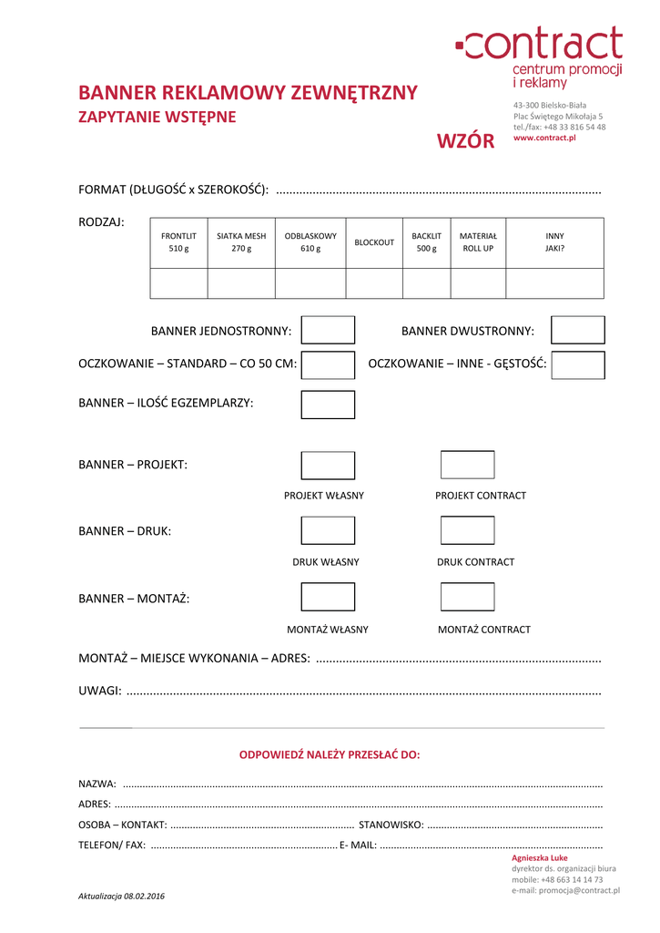 BANNER REKLAMOWY ZEWNĘTRZNY ZAPYTANIE WSTĘPNE WZÓR 43-300 Bielsko-Biała Plac Świętego Mikołaja 5 tel./fax: +48 33 816 54 48 www.contract.pl FORMAT (DŁUGOŚĆ x SZEROKOŚĆ): .................................................................................................. RODZAJ: FRONTLIT 510 g SIATKA MESH 270 g ODBLASKOWY 610 g BLOCKOUT BANNER JEDNOSTRONNY: BACKLIT 500 g MATERIAŁ ROLL UP INNY JAKI? BANNER DWUSTRONNY: OCZKOWANIE – STANDARD – CO 50 CM: OCZKOWANIE – INNE - GĘSTOŚĆ: BANNER – ILOŚĆ EGZEMPLARZY: BANNER – PROJEKT: PROJEKT WŁASNY PROJEKT CONTRACT BANNER – DRUK: DRUK WŁASNY DRUK CONTRACT BANNER – MONTAŻ: MONTAŻ WŁASNY MONTAŻ CONTRACT MONTAŻ – MIEJSCE WYKONANIA – ADRES: ...................................................................................... UWAGI: ............................................................................................................................................... ODPOWIEDŹ NALEŻY PRZESŁAĆ DO: NAZWA: ............................................................................................................................................................................ ADRES: ............................................................................................................................................................................... OSOBA – KONTAKT: .................................................................. STANOWISKO: ............................................................... TELEFON/ FAX: ................................................................... E- MAIL: ................................................................................ Aktualizacja 08.02.2016 Agnieszka Luke dyrektor ds. organizacji biura mobile: +48 663 14 14 73 e-mail: [email protected]