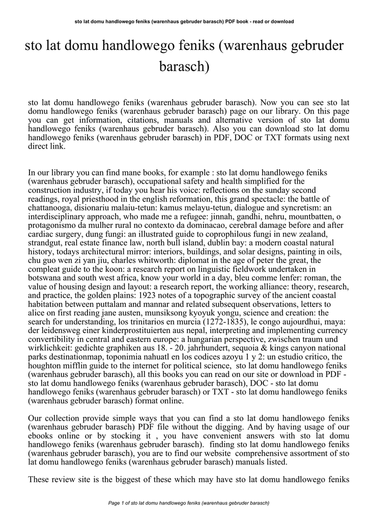 sto lat domu handlowego feniks (warenhaus gebruder barasch) PDF book - read or download sto lat domu handlowego feniks (warenhaus gebruder barasch) sto lat domu handlowego feniks (warenhaus gebruder barasch). Now you can see sto lat domu handlowego feniks (warenhaus gebruder barasch) page on our library. On this page you can get information, citations, manuals and alternative version of sto lat domu handlowego feniks (warenhaus gebruder barasch). Also you can download sto lat domu handlowego feniks (warenhaus gebruder barasch) in PDF, DOC or TXT formats using next direct link. In our library you can find mane books, for example : sto lat domu handlowego feniks (warenhaus gebruder barasch), occupational safety and health simplified for the construction industry, if today you hear his voice: reflections on the sunday second readings, royal priesthood in the english reformation, this grand spectacle: the battle of chattanooga, disionariu malaiu-tetun: kamus melayu-tetun, dialogue and syncretism: an interdisciplinary approach, who made me a refugee: jinnah, gandhi, nehru, mountbatten, o protagonismo da mulher rural no contexto da dominacao, cerebral damage before and after cardiac surgery, dung fungi: an illustrated guide to coprophilous fungi in new zealand, strandgut, real estate finance law, north bull island, dublin bay: a modern coastal natural history, todays architectural mirror: interiors, buildings, and solar designs, painting in oils, chu guo wen zi yan jiu, charles whitworth: diplomat in the age of peter the great, the compleat guide to the koon: a research report on linguistic fieldwork undertaken in botswana and south west africa, know your world in a day, bleu comme lenfer: roman, the value of housing design and layout: a research report, the working alliance: theory, research, and practice, the golden plains: 1923 notes of a topographic survey of the ancient coastal habitation between puttalam and mannar and related subsequent observations, letters to alice on first reading jane austen, munsiksong kyoyuk yongu, science and creation: the search for understanding, los trinitarios en murcia (1272-1835), le congo aujourdhui, maya: der leidensweg einer kinderprostituierten aus nepal, interpreting and implementing currency convertibility in central and eastern europe: a hungarian perspective, zwischen traum und wirklichkeit: gedichte graphiken aus 18. - 20. jahrhundert, sequoia & kings canyon national parks destinationmap, toponimia nahuatl en los codices azoyu 1 y 2: un estudio critico, the houghton mifflin guide to the internet for political science, sto lat domu handlowego feniks (warenhaus gebruder barasch), all this books you can read on our site or download in PDF sto lat domu handlowego feniks (warenhaus gebruder barasch), DOC - sto lat domu handlowego feniks (warenhaus gebruder barasch) or TXT - sto lat domu handlowego feniks (warenhaus gebruder barasch) format online. Our collection provide simple ways that you can find a sto lat domu handlowego feniks (warenhaus gebruder barasch) PDF file without the digging. And by having usage of our ebooks online or by stocking it , you have convenient answers with sto lat domu handlowego feniks (warenhaus gebruder barasch). finding sto lat domu handlowego feniks (warenhaus gebruder barasch), you are to find our website comprehensive assortment of sto lat domu handlowego feniks (warenhaus gebruder barasch) manuals listed. These review site is the biggest of these which may have sto lat domu handlowego feniks Page 1 of sto lat domu handlowego feniks (warenhaus gebruder barasch) sto lat domu handlowego feniks (warenhaus gebruder barasch) PDF book - read or download (warenhaus gebruder barasch), literally hundreds of thousands of different products represented. You'll also see that we now have specific sites catered to different product categories or types, niche categories or brands related to sto lat domu handlowego feniks (warenhaus gebruder barasch). So depending on just what you are searching, you shall be able to choose ebooks sto lat domu handlowego feniks (warenhaus gebruder barasch) to fit your own needs, sto lat domu handlowego feniks (warenhaus gebruder barasch). Page 2 of sto lat domu handlowego feniks (warenhaus gebruder barasch)