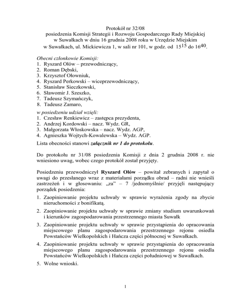 Protokół nr 32/08 posiedzenia Komisji Strategii i Rozwoju Gospodarczego Rady Miejskiej w Suwałkach w dniu 16 grudnia 2008 roku w Urzędzie Miejskim w Suwałkach, ul. Mickiewicza 1, w sali nr 101, w godz. od 1515 do 1640. Obecni członkowie Komisji: 1. Ryszard Ołów – przewodniczący, 2. Roman Dębski, 3. Krzysztof Ołowniuk, 4. Ryszard Perkowski – wiceprzewodniczący, 5. Stanisław Sieczkowski, 6. Sławomir J. Szeszko, 7. Tadeusz Szymańczyk, 8. Tadeusz Zamaro, w posiedzeniu udział wzięli: 1. Czesław Renkiewicz – zastępca prezydenta, 2. Andrzej Kordowski – nacz. Wydz. GR, 3. Małgorzata Włoskowska – nacz. Wydz. AGP, 4. Agnieszka Wojtych-Kowalewska – Wydz. AGP. Lista obecności stanowi załącznik nr 1 do protokołu. Do protokołu nr 31/08 posiedzenia Komisji z dnia 2 grudnia 2008 r. nie wniesiono uwag, wobec czego protokół został przyjęty. Posiedzeniu przewodniczył Ryszard Ołów – powitał zebranych i zapytał o uwagi do przesłanego wraz z materiałami porządku obrad – radni nie wnieśli zastrzeŜeń i w głosowaniu: „za” – 7 /jednomyślnie/ przyjęli następujący porządek posiedzenia: 1. Zaopiniowanie projektu uchwały w sprawie wyraŜenia zgody na zbycie nieruchomości z bonifikatą. 2. Zaopiniowanie projektu uchwały w sprawie zmiany studium uwarunkowań i kierunków zagospodarowania przestrzennego miasta Suwałk 3. Zaopiniowanie projektu uchwały w sprawie przystąpienia do opracowania miejscowego planu zagospodarowania przestrzennego rejonu osiedla Powstańców Wielkopolskich i Hańcza części północnej w Suwałkach. 4. Zaopiniowanie projektu uchwały w sprawie przystąpienia do opracowania miejscowego planu zagospodarowania przestrzennego rejonu osiedla Powstańców Wielkopolskich i Hańcza części południowej w Suwałkach. 5. Wolne wnioski. 1 Ad pkt. 1 – projekt uchwały w sprawie wyraŜenia zgody na zbycie nieruchomości z bonifikatą – stanowi załącznik nr 2 do protokołu. Czesław Renkiewicz poinformował, Ŝe pojawiły się nowe okoliczności dotyczące Ligi Obrony Kraju. Okazuje się, Ŝe w 2002 roku LOK sprzedał nieruchomość za 380 tys. zł. Obecnie podmiot wystąpił o przekazanie budynku z działką na zorganizowanie i prowadzenie działalności statutowej. Wprawdzie budynek jest zdewastowany i wymaga gruntownego remontu, a ustawa daje moŜliwość sprzedaŜy z bonifikatą, ale budzi wątpliwości fakt, Ŝe LOK sprzedał nieruchomość, gdzie była prowadzona działalność. Stąd wniosek i prośba, aby radni obecnie nie opiniowali projektu uchwały, a zastanowili się nad rozwiązaniem, nad tym co dalej robić z działką – czy przekazać nieruchomość na proponowanych warunkach, czy podwyŜszyć kwotę? Poprosił o stanowisko, które by ukierunkowało dalsze postępowanie w tym zakresie. Ryszard Ołów – zaproponował przeniesienie dyskusji na temat przekazania nieruchomości do punktu „Wolne wnioski”. Radni w głosowaniu: „za” 7 /jednomyślnie/ zaakceptowali propozycję. Ad pkt. 2 – projekt uchwały w sprawie zmiany studium uwarunkowań i kierunków zagospodarowania przestrzennego miasta Suwałk – stanowi załącznik nr 3 do protokołu. Agnieszka Wojtych-Kowalewska omówiła zmiany zaproponowane w studium i przedstawiła je na planszach. Omówiła zmiany, które m.in. dotyczą układu komunikacyjnego, lokalizacji obiektów wielkopowierzchniowych, wprowadzenia obszarów górniczych, aktualizacji stref ochronnych. Radni przyjęli wyjaśnienia i w głosowaniu: „za” – 7 radnych /jednomyślnie/ Komisja pozytywnie zaopiniowała projekt uchwały w sprawie zmiany studium uwarunkowań i kierunków zagospodarowania przestrzennego miasta Suwałk – opinia stanowi załącznik nr 4 do protokołu. Ad pkt. 3 – projekt uchwały w sprawie przystąpienia do opracowania miejscowego planu zagospodarowania przestrzennego rejonu osiedla Powstańców Wielkopolskich i Hańcza części północnej w Suwałkach – stanowi załącznik nr 5 do protokołu. Tadeusz Zamaro zwrócił uwagę na problem przewozu Ŝwiru i zapytał czy na terenie objętym planem powstanie bocznica kolejowa, bo tory przecinają ul. Buczka. 2 Czesław Renkiewicz stwierdził, Ŝe problem z wydobyciem i przewozem Ŝwiru będzie narastał. Miejscem, gdzie moŜna zlokalizować bocznicę, jest Papiernia, ale koszt budowy szacowany jest na kwotę ok. 10 mln zł i niestety, nie ma chętnych do zainwestowania. Wójt podjął pewne kroki – wystąpił do Wojewody o środki na utwardzenie drogi prowadzącej w kierunku Bakałarzewa i Raczek. Uzyskał dofinansowanie i utwardził tę drogę. Pozostaje do utwardzenia odcinek drogi prowadzącej w kierunku Filipowa. Wójt zaczął porządkować i tę drogę. Przechodzi ona na odcinku 300 – 400 m przez miasto i wójt proponował, aby samorząd miejski włączył się w budowę drogi, ale nie leŜy to w interesie miasta. W związku z przewozem Ŝwiru przez miasto wielkimi cięŜarówkami powstał pomysł, aby cięŜarówki kierować do waŜenia. Odpowiedni plac, gdzie moŜna byłoby zorganizować punkt waŜenia, znajduje się za firmą PORTA, a koszt przystosowania placu i zamontowania odpowiedniej wagi wynosi 500 tys. zł i takie rozwiązanie jest brane pod uwagę. W głosowaniu: „za” – 7 radnych /jednomyślnie/ Komisja pozytywnie zaopiniowała projekt uchwały w sprawie przystąpienia do opracowania miejscowego planu zagospodarowania przestrzennego rejonu osiedla Powstańców Wielkopolskich i Hańcza części północnej w Suwałkach – opinia stanowi załącznik nr 6 do protokołu. Ad pkt. 4 – projekt uchwały w sprawie przystąpienia do opracowania miejscowego planu zagospodarowania przestrzennego rejonu osiedla Powstańców Wielkopolskich i Hańcza części południowej w Suwałkach – stanowi załącznik nr 7 do protokołu. Radni nie wnieśli uwag do projektu uchwały i w głosowaniu: „za” – 7 radnych /jednomyślnie/ Komisja pozytywnie zaopiniowała projekt uchwały w sprawie przystąpi