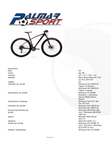 parametry koła rama rozmiar widelec 29 alu X6 15" / 17" / 19" / 21" Rock Shox Reba RLT 29 15 mm 100 mm 20 Shimano SLX M670-B I-Spec 10 speed / Shimano SLX M670-B I-Spec 2 speed Shimano XT M786 Shadow+ / Shimano Deore M618 Direct Mount Shimano SLX 677 38 / 24 175 mm Shimano SLX M675-B / Shimano SLX M675-B Shimano SM-RT64 160 mm / Shimano SM-RT64 180 mm Michelin Wild Racer 29×2,1 Alexrims Volar 2.1 Shimano SLX 678E 12 mm / 142 mm / Shimano SLX 678 15 mm Shimano SLX CS-HG81 napęd manetki tył, przód przerzutka tył, przód mechanizm korbowy hamulec tył, przód tarcza hamulcowa tył, przód opony obręcze piasta tył, przód kaseta / wolnobieg Strona 1 z 2 11-36 10 speed Kore Aerox OE Flat Top 710 mm Kore Aerox 1 OE 31,6 mm 400 mm Kore Aerox 90 mm Romet by Velo Feimin FP-971 12 kg kierownica sztyca mostek kierownicy siodło pedały waga Strona 2 z 2