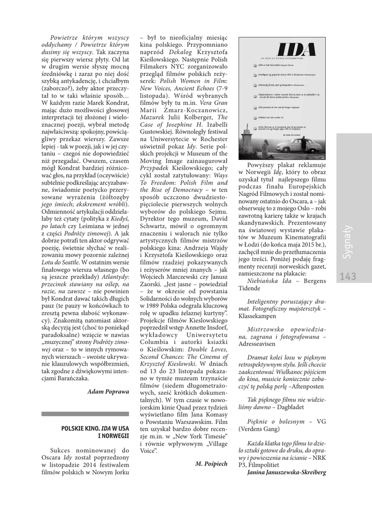 Adam Poprawa POLSKIE KINO. IDA W USA I NORWEGII Sukces nominowanej do Oscara Idy został poprzedzony w listopadzie 2014 festiwalem filmów polskich w Nowym Jorku – był to nieoficjalny miesiąc kina polskiego. Przypomniano naprzód Dekalog Krzysztofa Kieślowskiego. Następnie Polish Filmakers NYC zorganizowało przegląd filmów polskich reżyserek: Polish Women in Film: New Voices, Ancient Echoes (7-9 listopada). Wśród wybranych filmów były tu m.in. Vera Gran Marii Zmarz-Koczanowicz, Mazurek Julii Kolberger, The Case of Josephine H. Izabelli Gustowskiej. Równoległy festiwal na Uniwersytecie w Rochester uświetnił pokaz Idy. Serie polskich projekcji w Museum of the Moving Image zainaugurował Przypadek Kieślowskiego; cały cykl został zatytułowany: Ways To Freedom: Polish Film and the Rise of Democracy – w ten sposób uczczono dwudziestopięciolecie pierwszych wolnych wyborów do polskiego Sejmu. Dyrektor tego muzeum, David Schwartz, mówił o ogromnym znaczeniu i walorach nie tylko artystycznych filmów mistrzów polskiego kina: Andrzeja Wajdy i Krzysztofa Kieślowskiego oraz filmów rzadziej pokazywanych i reżyserów mniej znanych – jak Wojciech Marczewski czy Janusz Zaorski. „Jest jasne – powiedział – że w okresie od powstania Solidarności do wolnych wyborów w 1989 Polska odegrała kluczową rolę w upadku żelaznej kurtyny”. Projekcje filmów Kieslowskiego poprzedził wstęp Annette Insdorf, wykładowc y Uniwersytetu Columbia i autorki ksiażki o Kieślowskim: Double Loves, Second Chances: The Cinema of Krzysztof Kieslowski. W dniach od 13 do 23 listopada pokazano w tymże muzeum trzynaście filmów (siedem długometrażowych, sześć krótkich dokumentalnych). W tym czasie w nowojorskim kinie Quad przez tydzień wyświetlano film Jana Komasy o Powstaniu Warszawskim. Film ten uzyskał bardzo dobre recenzje m.in. w „New York Timesie” i równie wpływowym „Village Voice”. M. Pośpiech Powyższy plakat reklamuje w Norwegii Idę, który to obraz uzyskał tytuł najlepszego filmu podczas finału Europejskich Nagród Filmowych i został nominowany ostatnio do Oscara, a – jak obserwuję to z mojego Oslo – robi zawrotną karierę także w krajach skandynawskich. Prezentowany na światowej wystawie plakatów w Muzeum Kinematografii w Łodzi (do końca maja 2015 br.), zachęcił mnie do przetłumaczenia jego treści. Poniżej podaję fragmenty recenzji norweskich gazet, zamieszczone na plakacie: Niebiańska Ida – Bergens Tidende Inteligentny poruszający dramat. Fotograficzny majstersztyk – Klassekampen Mistrzowsko opowiedziana, zagrana i fotografowana – Adresseavisen Dramat kolei losu w pięknym retrospektywnym stylu. Jeśli chcecie zaakcentować Wielkanoc pójściem do kina, musicie koniecznie zobaczyć tę polską perłę –Aftenposten Tak pięknego filmu nie widzieliśmy dawno – Dagbladet Pięknie o bolesnym – VG (Verdens Gang) Każda klatka tego filmu to dzieło sztuki gotowe do druku, do oprawy i powieszenia na ścianie – NRK P3, Filmpolitiet Janina Januszewska-Skreiberg Sygnały Powietrze którym wszyscy oddychamy / Powietrze którym dusimy się wszyscy. Tak zaczyna się pierwszy wiersz płyty. Od lat w drugim wersie słyszę mocną średniówkę i zaraz po niej dość szybką antykadencję, i chciałbym (zaborczo?), żeby aktor przeczytał to w taki właśnie sposób… W każdym razie Marek Kondrat, mając dużo możliwości głosowej interpretacji tej złożonej i wieloznacznej poezji, wybrał metodę najwłaściwszą: spokojny, powściągliwy przekaz wierszy. Zawsze lepiej - tak w poezji, jak i w jej czytaniu – czegoś nie dopowiedzieć niż przegadać. Owszem, czasem mógł Kondrat bardziej różnicować głos, na przykład (oczywiście) subtelnie podkreślając arcyzabawne, świadomie poetycko przerysowane wyrażenia (żółtozęby jego śmiech; ekskrement wróbli). Odmienność artykulacji oddzielałaby też cytaty (polityka z Kiedyś, po latach czy Leśmiana w jednej z części Podróży zimowej). A jak dobrze potrafi ten aktor odgrywać poezję, świetnie słychać w realizowaniu mowy pozornie zależnej Lotu do Seattle. W ostatnim wersie finałowego wiersza własnego (bo są jeszcze przekłady) Atlantydy: przecinek stawiany na oślep, na razie, na zawsze – nie powinien był Kondrat dawać takich długich pauz (te pauzy w końcówkach to zresztą pewna słabość wykonawcy). Znakomitą natomiast aktorską decyzją jest (choć to poniekąd paradoksalne) wzięcie w nawias „muzycznej” strony Podróży zimowej oraz – to w innych rymowanych wierszach – swoiste ukrywanie klauzulowych współbrzmień, tak zgodne z dźwiękowymi intencjami Barańczaka. 143