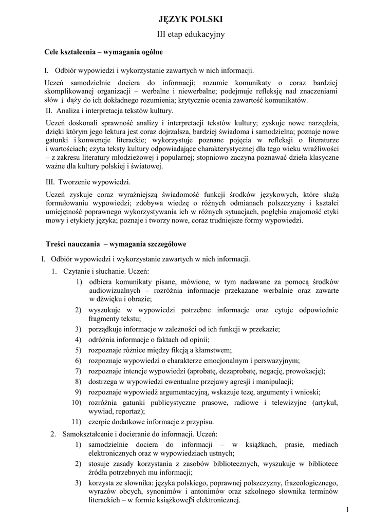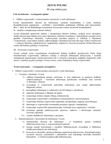 JĘZYK POLSKI III etap edukacyjny Cele kształcenia – wymagania ogólne I. Odbiór wypowiedzi i wykorzystanie zawartych w nich informacji. Uczeń samodzielnie dociera do informacji; rozumie komunikaty o coraz bardziej skomplikowanej organizacji – werbalne i niewerbalne; podejmuje refleksję nad znaczeniami słów i dąŜy do ich dokładnego rozumienia; krytycznie ocenia zawartość komunikatów. II. Analiza i interpretacja tekstów kultury. Uczeń doskonali sprawność analizy i interpretacji tekstów kultury; zyskuje nowe narzędzia, dzięki którym jego lektura jest coraz dojrzalsza, bardziej świadoma i samodzielna; poznaje nowe gatunki i konwencje literackie; wykorzystuje poznane pojęcia w refleksji o literaturze i wartościach; czyta teksty kultury odpowiadające charakterystycznej dla tego wieku wraŜliwości – z zakresu literatury młodzieŜowej i popularnej; stopniowo zaczyna poznawać dzieła klasyczne waŜne dla kultury polskiej i światowej. III. Tworzenie wypowiedzi. Uczeń zyskuje coraz wyraźniejszą świadomość funkcji środków językowych, które słuŜą formułowaniu wypowiedzi; zdobywa wiedzę o róŜnych odmianach polszczyzny i kształci umiejętność poprawnego wykorzystywania ich w róŜnych sytuacjach, pogłębia znajomość etyki mowy i etykiety języka; poznaje i tworzy nowe, coraz trudniejsze formy wypowiedzi. Treści nauczania – wymagania szczegółowe I. Odbiór wypowiedzi i wykorzystanie zawartych w nich informacji. 1. Czytanie i słuchanie. Uczeń: 1) odbiera komunikaty pisane, mówione, w tym nadawane za pomocą środków audiowizualnych – rozróŜnia informacje przekazane werbalnie oraz zawarte w dźwięku i obrazie; 2) wyszukuje w wypowiedzi potrzebne informacje oraz cytuje odpowiednie fragmenty tekstu; 3) porządkuje informacje w zaleŜności od ich funkcji w przekazie; 4) odróŜnia informacje o faktach od opinii; 5) rozpoznaje róŜnice między fikcją a kłamstwem; 6) rozpoznaje wypowiedzi o charakterze emocjonalnym i perswazyjnym; 7) rozpoznaje intencje wypowiedzi (aprobatę, dezaprobatę, negację, prowokację); 8) dostrzega w wypowiedzi ewentualne przejawy agresji i manipulacji; 9) rozpoznaje wypowiedź argumentacyjną, wskazuje tezę, argumenty i wnioski; 10) rozróŜnia gatunki publicystyczne prasowe, radiowe i telewizyjne (artykuł, wywiad, reportaŜ); 11) czerpie dodatkowe informacje z przypisu. 2. Samokształcenie i docieranie do informacji. Uczeń: 1) samodzielnie dociera do informacji – w ksiąŜkach, prasie, mediach elektronicznych oraz w wypowiedziach ustnych; 2) stosuje zasady korzystania z zasobów bibliotecznych, wyszukuje w bibliotece źródła potrzebnych mu informacji; 3) korzysta ze słownika: języka polskiego, poprawnej polszczyzny, frazeologicznego, wyrazów obcych, synonimów i antonimów oraz szkolnego słownika terminów literackich – w formie ksiąŜkowej6i elektronicznej. 1 3. Świadomość językowa. Uczeń: 1) rozumie pojęcie stylu, rozpoznaje styl potoczny, urzędowy, artystyczny i naukowy; 2) rozpoznaje wyrazy wieloznaczne i rozumie ich znaczenia w tekście; 3) dostrzega zróŜnicowanie słownictwa – rozpoznaje słownictwo ogólnonarodowe i słownictwo o ograniczonym zasięgu (wyrazy gwarowe, terminy naukowe, archaizmy i neologizmy, eufemizmy i wulgaryzmy; dostrzega negatywne konsekwencje uŜywania wulgaryzmów); rozpoznaje wyrazy rodzime i zapoŜyczone (obce) – rozumie ich funkcję w tekście; 4) rozpoznaje cechy kultury i języka swojego regionu; 5) rozpoznaje w zdaniach i w równowaŜnikach zdań róŜne rodzaje podmiotów, orzeczeń, dopełnień, okoliczników oraz przydawkę – rozumie ich funkcje; 6) rozróŜnia rodzaje zdań złoŜonych podrzędnie i współrzędnie, imiesłowowe równowaŜniki zdań, zdania bezpodmiotowe oraz rozumie ich funkcje w wypowiedzi; 7) odróŜnia temat fleksyjny od końcówki; 8) odróŜnia czasowniki dokonane i niedokonane; rozpoznaje tryby i strony (czynną i bierną) czasownika oraz imiesłowy – wyjaśnia ich funkcje w tekście; 9) rozpoznaje temat słowotwórczy i formant w wyrazach pochodnych i wskazuje funkcje formantów w nadawaniu znaczenia wyrazom pochodnym. II. Analiza i interpretacja tekstów kultury. Uczeń zna teksty literackie i inne teksty kultury wskazane przez nauczyciela. 1. Wstępne rozpoznanie. Uczeń: 1) opisuje odczucia, które budzi w nim dzieło; 2) rozpoznaje problematykę utworu. 2. Analiza. Uczeń: 1) przedstawia najistotniejsze treści wypowiedzi w takim porządku, w jakim występują one w tekście; 2) charakteryzuje postać mówiącą w utworze; 3) rozróŜnia narrację pierwszoosobową i trzecioosobową oraz potrafi określić ich funkcje w utworze; 4) wskazuje funkcje uŜytych w utworze środków stylistycznych z zakresu słownictwa (neologizmów, archaizmów, zdrobnień, zgrubień, metafor), składni (powtórzeń, pytań retorycznych, róŜnego typu zdań i równowaŜników), fonetyki (rymu, rytmu, wyrazów dźwiękonaśladowczych); 5) omawia funkcje elementów konstrukcyjnych utworu (tytułu, podtytułu, motta, apostrofy, puenty, punktu kulminacyjnego); 6) przypisuje czytany utwór do właściwego rodzaju literackiego (epika, liryka, dramat); 7) rozpoznaje czytany utwór jako: przypowieść, pamiętnik, dziennik, komedię, dramat (gatunek), tragedię, balladę, nowelę, hymn, powieść historyczną; 8) rozpoznaje odmiany gatunkowe literatury popularnej: powieść lub opowiadanie obyczajowe, przygodowe, detektywistyczne, fantastycznonaukowe, fantasy; 9) wskazuje elementy dramatu, takie jak: akt, scena, tekst główny, tekst poboczny, monolog, dialog; 10) znajduje w tekstach współczesnej kultury popularnej (np. w filmach, komiksach, piosenkach) nawiązania do tradycyjnych wątków literackich i kulturowych; wskazuje przykłady mieszania gatunków; 11) uwzględnia w analizie specyfikę tekstów kultury przynaleŜnych do następujących rodzajów sztuki: literatura, teatr, film, muzyka, sztuki plastyczne, sztuki audiowizualne. 2