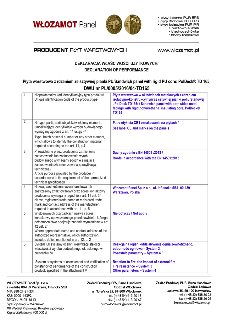 DEKLARACJA WŁAŚCIWOŚCI UŻYTKOWYCH/ DECLARATION OF PERFORMANCE Płyta warstwowa z rdzeniem ze sztywnej pianki PU/Sandwich panel with rigid PU core: PolDeck® TD 165, DWU nr PL/0005/2016/04-TD165 1. Niepowtarzalny kod identyfikacyjny typu produktu/ Unique identification code of the product-type Płyta warstwowa w okładzinach metalowych z rdzeniem izolacyjno-konstrukcyjnym ze sztywnej pianki poliuretanowej , PolDeck TD165: / Sandwich panel with both sides metal facings with rigid polyurethane insulating core, PolDeck® TD165 2. Nr typu, partii, serii lub jakikolwiek inny element . umożliwiający identyfikację wyrobu budowlanego wymagany zgodnie z art. 11 ustęp 4/ Type, batch or serial number or any other element, which allows to identify the construction material, required according to the art. 11, p.4 Patrz etykieta CE i oznakowania na płytach / See label CE and marks on the panels 3. Przewidziane przez producenta zamierzone zastosowanie lub zastosowania wyrobu budowlanego wymagany zgodnie z mającą zastosowanie zharmonizowaną specyfikacją techniczną / Article purpose provided by the producer in accordance with the requirement of the harmonized technical specification Nazwa, zastrzeżona nazwa handlowa lub zastrzeżony znak towarowy oraz adres kontaktowy producenta wymagany zgodnie z art. 11 ust. 5/ Name, registered trade name or registered trade mark and contact address of the manufacturer, required in accordance with art. 11, p. 5 W stosownych przypadkach nazwa i adres kontaktowy upoważnionego przedstawiciela, którego pełnomocnictwo obejmuje zadania wymienione w art. 12 ust. 2/ Where appropriate name and contact address of the authorized representative, which authorization includes duties mentioned in art. 12, p. 2 System lub systemy oceny i weryfikacji stałości właściwości wyrobu budowlanego określonego w załączniku V/ Dachy zgodnie z EN 14509 :2013 / Roofs in accordance with the EN 14509:2013 System or systems of assessment and verification of constancy of performance of the construction product, specified in the attachment V Reaction to fire, the impact of external fire, Fire resistance – System 3 Other parameters – System 4 4. 5. 6. Włozamot Panel Sp. z o.o., ul. Inflancka 5/81, 00-189 Warszawa, Polska Nie dotyczy / Not apply Reakcja na ogień, oddziaływanie ognia zewnętrznego, odporność ogniowa – System 3 Pozostałe parametry – System 4 / 7. W przypadku deklaracji właściwości użytkowych dotyczącej wyrobu budowlanego objętego normą zharmonizowaną/ In case of the declaration of performance concerning a construction product covered by a harmonized standard EN 14509:2013 Jednostka notyfikowana ITB Warszawa nr notyfikacji 1488 Jednostka notyfikowana FIRES s.r.o. nr notyfikacji 1396/ EN 14509:2013 The notified body ITB Warszawa nr notification 1488 The notified body FIRES s.r.o. nr notification 1396 8. W przypadku deklaracji właściwości użytkowych dotyczącej wyrobu budowlanego dla którego została wydana Europejską Ocenę Techniczną / In case of the declaration of performance concerning a construction product for which a European Technical Assessment has been issued Deklarowane właściwości użytkowe/ Declared properties Nie dotyczy/ Not apply 9. Techniczne właściwości wyrobu w odniesieniu do jego konfiguracji oraz do wymagań rozporządzenia CPR 305/2011 i normy zharmonizowanej EN 14509:2013 są dostępne w załączniku do dokumentów dostawy / The technical properties of the product with respect to its configuration and the requirements of ordinance CPR 305/2011 and the harmonized standard EN 14509:2013, are provided as an attachment to the delivery documents W przypadku gdy na podstawie art. 37 lub 38 została zastosowana specjalna dokumentacja techniczna, wymagania, z którymi wyrób jest zgodny: Nie dotyczy / In case when the special technical documentation was applied on the basis of art. 37 or 38, requirements with which the product conforms: Not apply 10. Właściwości użytkowe wyrobu określone w pkt. 1 i 2 są zgodne z właściwościami użytkowymi deklarowanymi w pkt. 9 / The performance of the product identified in points 1 and 2 is in conformity with the declared performance in point 9. Niniejsza deklaracja właściwości użytkowych jest wydana na wyłączną odpowiedzialność producenta określonego w pkt. 4./ This declaration of performance is issued under the sole responsibility of the manufacturer identified in point 4. W imieniu producenta podpisał: Janusz Szczepański, PREZES ZARZĄDU (Imię i nazwisko; stanowisko) WŁOCŁAWEK, 01-04-2016 (Miejsce i data wydania) ………………………………… (podpis)