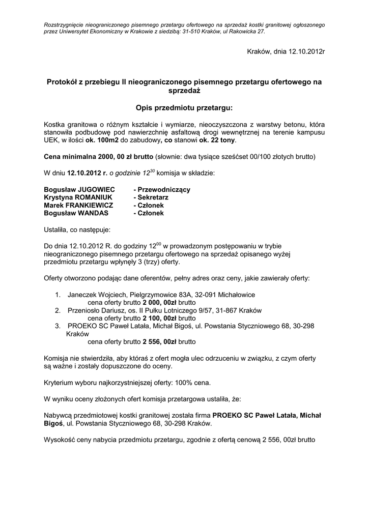 Rozstrzygnięcie nieograniczonego pisemnego przetargu ofertowego na sprzedaż kostki granitowej ogłoszonego przez Uniwersytet Ekonomiczny w Krakowie z siedzibą: 31-510 Kraków, ul Rakowicka 27. Kraków, dnia 12.10.2012r Protokół z przebiegu II nieograniczonego pisemnego przetargu ofertowego na sprzedaż Opis przedmiotu przetargu: Kostka granitowa o różnym kształcie i wymiarze, nieoczyszczona z warstwy betonu, która stanowiła podbudowę pod nawierzchnię asfaltową drogi wewnętrznej na terenie kampusu UEK, w ilości ok. 100m2 do zabudowy, co stanowi ok. 22 tony. Cena minimalna 2000, 00 zł brutto (słownie: dwa tysiące sześćset 00/100 złotych brutto) W dniu 12.10.2012 r. o godzinie 1230 komisja w składzie: Bogusław JUGOWIEC Krystyna ROMANIUK Marek FRANKIEWICZ Bogusław WANDAS - Przewodniczący - Sekretarz - Członek - Członek Ustaliła, co następuje: Do dnia 12.10.2012 R. do godziny 1200 w prowadzonym postępowaniu w trybie nieograniczonego pisemnego przetargu ofertowego na sprzedaż opisanego wyżej przedmiotu przetargu wpłynęły 3 (trzy) oferty. Oferty otworzono podając dane oferentów, pełny adres oraz ceny, jakie zawierały oferty: Janeczek Wojciech, Pielgrzymowice 83A, 32-091 Michałowice cena oferty brutto 2 000, 00zł brutto 2. Przeniosło Dariusz, os. II Pułku Lotniczego 9/57, 31-867 Kraków cena oferty brutto 2 100, 00zł brutto 3. PROEKO SC Paweł Latała, Michał Bigoś, ul. Powstania Styczniowego 68, 30-298 Kraków cena oferty brutto 2 556, 00zł brutto 1. Komisja nie stwierdziła, aby któraś z ofert mogła ulec odrzuceniu w związku, z czym oferty są ważne i zostały dopuszczone do oceny. Kryterium wyboru najkorzystniejszej oferty: 100% cena. W wyniku oceny złożonych ofert komisja przetargowa ustaliła, że: Nabywcą przedmiotowej kostki granitowej została firma PROEKO SC Paweł Latała, Michał Bigoś, ul. Powstania Styczniowego 68, 30-298 Kraków. Wysokość ceny nabycia przedmiotu przetargu, zgodnie z ofertą cenową 2 556, 00zł brutto Rozstrzygnięcie nieograniczonego pisemnego przetargu ofertowego na sprzedaż kostki granitowej ogłoszonego przez Uniwersytet Ekonomiczny w Krakowie z siedzibą: 31-510 Kraków, ul Rakowicka 27. Nabywca uiści na poczet ceny nabycia: Kostki granitowej o różnym kształcie i wymiarze, nieoczyszczonej z warstwy betonu, która stanowiła podbudowę pod nawierzchnię asfaltową drogi wewnętrznej na terenie kampusu UEK, w ilości ok. 100m2 do zabudowy, co stanowi ok. 22 tony., kwotę 2 556, 00zł (słownie zł: dwa tysiące pięćset pięćdziesiąt sześć) brutto. Nabywca jest obowiązany zapłacić cenę nabycia w terminie nie dłuższym jak 7 dni od daty podpisania umowy kupna / sprzedaży. Wnioski i oświadczenia osób obecnych przy przetargu: BRAK Na tym protokół zakończono i podpisano. Bogusław JUGOWIEC Przewodniczący ……………………………….. Krystyna ROMANIUK Sekretarz ……………………………….. Marek FRANKIEWICZ Członek ……………………………….. Bogusław WANDAS Członek ……………………………….. ZATWIERDZIŁ Kanclerz UEK mgr Mirosław CHECHELSKI
