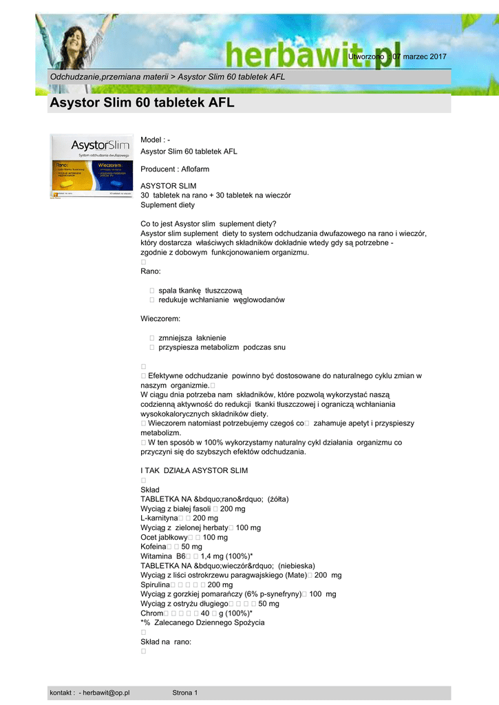 Utworzono : 07 marzec 2017 Odchudzanie,przemiana materii > Asystor Slim 60 tabletek AFL Asystor Slim 60 tabletek AFL Model : Asystor Slim 60 tabletek AFL Producent : Aflofarm ASYSTOR SLIM 30 tabletek na rano + 30 tabletek na wieczór Suplement diety Co to jest Asystor slim suplement diety? Asystor slim suplement diety to system odchudzania dwufazowego na rano i wieczór, który dostarcza właściwych składników dokładnie wtedy gdy są potrzebne zgodnie z dobowym funkcjonowaniem organizmu. � Rano: � spala tkankę tłuszczową � redukuje wchłanianie węglowodanów Wieczorem: � zmniejsza łaknienie � przyspiesza metabolizm podczas snu � �Efektywne odchudzanie powinno być dostosowane do naturalnego cyklu zmian w naszym organizmie.� W ciągu dnia potrzeba nam składników, które pozwolą wykorzystać naszą codzienną aktywność do redukcji tkanki tłuszczowej i ograniczą wchłaniania wysokokalorycznych składników diety. �Wieczorem natomiast potrzebujemy czegoś co� zahamuje apetyt i przyspieszy metabolizm. �W ten sposób w 100% wykorzystamy naturalny cykl działania organizmu co przyczyni się do szybszych efektów odchudzania. I TAK DZIAŁA ASYSTOR SLIM � Skład TABLETKA NA „rano” (żółta) Wyciąg z białej fasoli �200 mg L-karnityna��200 mg Wyciąg z zielonej herbaty�100 mg Ocet jabłkowy��100 mg Kofeina��50 mg Witamina B6��1,4 mg (100%)* TABLETKA NA „wieczór” (niebieska) Wyciąg z liści ostrokrzewu paragwajskiego (Mate)�200 mg Spirulina�����200 mg Wyciąg z gorzkiej pomarańczy (6% p-synefryny)�100 mg Wyciąg z ostryżu długiego����50 mg Chrom�����40 �g (100%)* *% Zalecanego Dziennego Spożycia � Skład na rano: � kontakt : - [email protected] Strona 1 Utworzono : 07 marzec 2017 Odchudzanie,przemiana materii > Asystor Slim 60 tabletek AFL Asystor Slim 60 tabletek AFL Fasolamina znajdująca się w wyciągu z białej fasoli, hamuje trawienie skrobi znajdującej się w produktach spożywczych (ziemniaki, pieczywo, makaron, pierogi).� L-karnityna odgrywa ważną rolę w przemianie materii, uczestniczy w zamianie tłuszczu w energię. Wyciąg z zielonej herbaty pobudza spalanie tłuszczu oraz zwiększa wydatkowanie energii. Ocet jabłkowy reguluje trawienie, pobudza procesy metaboliczne oraz zmniejsza wchłanianie cukrów.� Kofeina wspomaga proces termogenezy, przez co przyspiesza procesy metaboliczne. Wzmaga procesy utleniania tłuszczu, przez co zwiększa ilość spalanych kalorii.� Witamina B6 jest niezbędna w przemianach aminokwasów, bierze udział w metabolizmie węglowodanów i lipidów. � Skład na wieczór: � Mate pochodząca z liści ostrokrzewu paragwajskiego (Ilex paraguariensis) ma dobroczynny wpływ na przemianę materii. Przyczynia się do rozkładu lipidów i pomaga w utrzymaniu prawidłowej masy ciała. Spirulina dostarcza łatwo przyswajalnych składników mineralnych i witamin oraz chlorofilu i fitocyjaniny - związków wspomagających procesy trawienne i metaboliczne. Wyciąg z gorzkiej pomarańczy zmniejsza apetyt, przyspiesza przemianę materii. Dodatkowo zawarta w wyciągu synefryna nasila proces lipolizy (rozpadu) tłuszczów. Wyciąg z ostryżu długiego ułatwia procesy trawienne i przyczynia się do prawidłowego funkcjonowania jelit oraz fizjologicznego wydzielania żółci. Posiada właściwości antyoksydacyjne. Chrom aktywuje wiele enzymów biorących udział w regulacji przemian cukrów i tłuszczów w organizmie. Chrom przyczynia się do redukcji tkanki tłuszczowej. Po podaniu chromu zmniejsza się łaknienie, co jest spowodowane regulacją poziomu glukozy. � Sposób użycia: 1 tabletka rano „żółta” 1 tabletka wieczorem „niebieska” ( koło godziny 18) � Opakowanie 30 tabletek na rano 30 tabletek na wieczór Cena : 37,00 zł Brutto ( 34,26 zł Netto) Dostępność: Produkt dostępny w naszym sklepie od 01 czerwiec 2011 kontakt : - [email protected] Strona 2