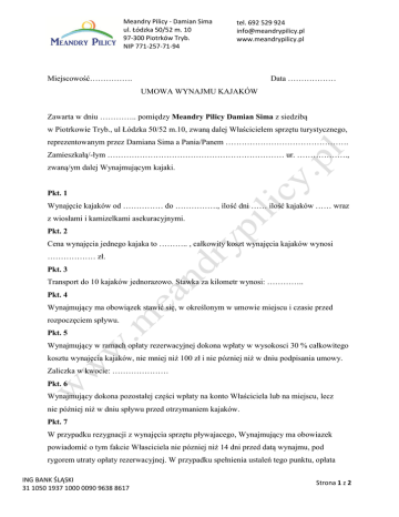 Meandry Pilicy - Damian Sima ul. Łódzka 50/52 m. 10 97-300 Piotrków Tryb. NIP 771-257-71-94 tel. 692 529 924 [email protected] www.meandrypilicy.pl Data ……………… Miejscowość……………. UMOWA WYNAJMU KAJAKÓW Zawarta w dniu ………….. pomiędzy Meandry Pilicy Damian Sima z siedzibą w Piotrkowie Tryb., ul Łódzka 50/52 m.10, zwaną dalej Właścicielem sprzętu turystycznego, reprezentowanym przez Damiana Sima a Pania/Panem ………………………………………. Zamieszkałą/-łym ………………………………………………………… ur. ………………., zwaną/ym dalej Wynajmującym kajaki. Pkt. 1 Wynajęcie kajaków od …………… do ……………., ilość dni …… ilość kajaków …… wraz z wiosłami i kamizelkami asekuracyjnymi. Pkt. 2 Cena wynajęcia jednego kajaka to ……….. , całkowity koszt wynajęcia kajaków wynosi ……………… zł. Pkt. 3 Transport do 10 kajaków jednorazowo. Stawka za kilometr wynosi: ………….. Pkt. 4 Wynajmujący ma obowiązek stawić się, w określonym w umowie miejscu i czasie przed rozpoczęciem spływu. Pkt. 5 Wynajmujący w ramach opłaty rezerwacyjnej dokona wpłaty w wysokosci 30 % całkowitego kosztu wynajęcia kajaków, nie mniej niż 100 zł i nie pózniej niż w dniu podpisania umowy. Zaliczka w kwocie: ………………… Pkt. 6 Wynajmujący dokona pozostałej części wpłaty na konto Właściciela lub na miejscu, lecz nie póżniej niż w dniu spływu przed otrzymaniem kajaków. Pkt. 7 W przypadku rezygnacji z wynajęcia sprzętu pływajacego, Wynajmujący ma obowiazek powiadomić o tym fakcie Własciciela nie pózniej niż 14 dni przed datą wynajmu, pod rygorem utraty opłaty rezerwacyjnej. W przypadku spełnienia ustaleń tego punktu, opłata ING BANK ŚLĄSKI 31 1050 1937 1000 0090 9638 8617 Strona 1 z 2 Meandry Pilicy - Damian Sima ul. Łódzka 50/52 m. 10 97-300 Piotrków Tryb. NIP 771-257-71-94 tel. 692 529 924 [email protected] www.meandrypilicy.pl rezerwacyjna zostanie zwrócona pod wskazany adres,pomniejszona o koszt przelewu. Pkt. 8 Umowa niniejsza jest ważna tylko z dowodem uiszczenia opłaty rezerwacyjnej lub całkowitej. Umowa może zostać wypowiedziana przez każdą ze stron z zachowaniem 14 dniowego terminu wypowiedzenia. Pkt. 9 Właściciel nie ponosi żadnej odpowiedzialności za bezpieczeństwo Wynajmującego. Wynajmujący ponosi pełną odpowiedzialność za wynajęty sprzęt i sposób jego użycia oraz zobowiązuje się pokryć straty zwiazane z jego zagubieniem badź zniszczeniem. Pkt. 10 W sprawach nieuregulowanych niniejszą umową zastosowanie mają przepisy Kodeksu Cywilnego. Wszelkie kwestie sporne mogące wyniknąć z niniejszej umowy, będą rozstrzygane polubownie, a ostatecznie zostaną poddane do rozstrzygnięcia przez odpowiedni Sąd Rejonowy. Pkt. 11 Umowę sporządzono w dwóch jednobrzmiących egzemplarzach, po jednym dla każdej ze stron. Pkt. 12 Miejsce spotkania: ………………………………………………, data …………, godzina ……… Podpis i pieczątka firmy ING BANK ŚLĄSKI 31 1050 1937 1000 0090 9638 8617 podpis wynajmującego Strona 2 z 2