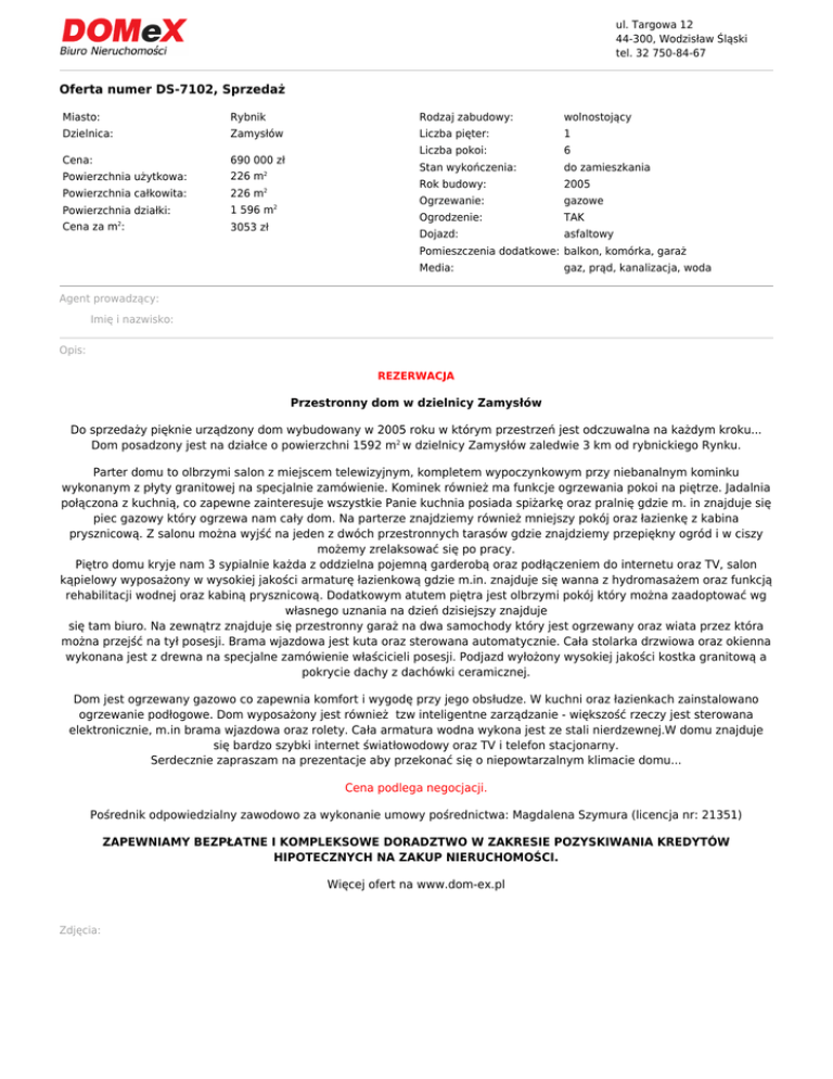 ul. Targowa 12 44-300, Wodzisław Śląski tel. 32 750-84-67 Oferta numer DS-7102, Sprzedaż Miasto: Rybnik Rodzaj zabudowy: wolnostojący Dzielnica: Zamysłów Liczba pięter: 1 Cena: 690 000 zł Liczba pokoi: 6 Powierzchnia użytkowa: 226 m2 Stan wykończenia: do zamieszkania Powierzchnia całkowita: 226 m2 Rok budowy: 2005 Powierzchnia działki: 1 596 m2 Ogrzewanie: gazowe Cena za m2: 3053 zł Ogrodzenie: TAK Dojazd: asfaltowy Pomieszczenia dodatkowe: balkon, komórka, garaż Media: gaz, prąd, kanalizacja, woda Agent prowadzący: Imię i nazwisko: Opis: REZERWACJA Przestronny dom w dzielnicy Zamysłów Do sprzedaży pięknie urządzony dom wybudowany w 2005 roku w którym przestrzeń jest odczuwalna na każdym kroku... Dom posadzony jest na działce o powierzchni 1592 m2 w dzielnicy Zamysłów zaledwie 3 km od rybnickiego Rynku. Parter domu to olbrzymi salon z miejscem telewizyjnym, kompletem wypoczynkowym przy niebanalnym kominku wykonanym z płyty granitowej na specjalnie zamówienie. Kominek również ma funkcje ogrzewania pokoi na piętrze. Jadalnia połączona z kuchnią, co zapewne zainteresuje wszystkie Panie kuchnia posiada spiżarkę oraz pralnię gdzie m. in znajduje się piec gazowy który ogrzewa nam cały dom. Na parterze znajdziemy również mniejszy pokój oraz łazienkę z kabina prysznicową. Z salonu można wyjść na jeden z dwóch przestronnych tarasów gdzie znajdziemy przepiękny ogród i w ciszy możemy zrelaksować się po pracy. Piętro domu kryje nam 3 sypialnie każda z oddzielna pojemną garderobą oraz podłączeniem do internetu oraz TV, salon kąpielowy wyposażony w wysokiej jakości armaturę łazienkową gdzie m.in. znajduje się wanna z hydromasażem oraz funkcją rehabilitacji wodnej oraz kabiną prysznicową. Dodatkowym atutem piętra jest olbrzymi pokój który można zaadoptować wg własnego uznania na dzień dzisiejszy znajduje się tam biuro. Na zewnątrz znajduje się przestronny garaż na dwa samochody który jest ogrzewany oraz wiata przez która można przejść na tył posesji. Brama wjazdowa jest kuta oraz sterowana automatycznie. Cała stolarka drzwiowa oraz okienna wykonana jest z drewna na specjalne zamówienie właścicieli posesji. Podjazd wyłożony wysokiej jakości kostka granitową a pokrycie dachy z dachówki ceramicznej. Dom jest ogrzewany gazowo co zapewnia komfort i wygodę przy jego obsłudze. W kuchni oraz łazienkach zainstalowano ogrzewanie podłogowe. Dom wyposażony jest również tzw inteligentne zarządzanie - większość rzeczy jest sterowana elektronicznie, m.in brama wjazdowa oraz rolety. Cała armatura wodna wykona jest ze stali nierdzewnej.W domu znajduje się bardzo szybki internet światłowodowy oraz TV i telefon stacjonarny. Serdecznie zapraszam na prezentacje aby przekonać się o niepowtarzalnym klimacie domu... Cena podlega negocjacji. Pośrednik odpowiedzialny zawodowo za wykonanie umowy pośrednictwa: Magdalena Szymura (licencja nr: 21351) ZAPEWNIAMY BEZPŁATNE I KOMPLEKSOWE DORADZTWO W ZAKRESIE POZYSKIWANIA KREDYTÓW HIPOTECZNYCH NA ZAKUP NIERUCHOMOŚCI. Więcej ofert na www.dom-ex.pl Zdjęcia: Zamieszczone na naszej stronie oferty nieruchomości mają charakter informacyjny i nie stanowią oferty w rozumieniu prawa handlowego.