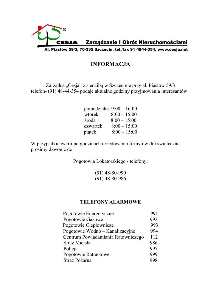 INFORMACJA Zarządca „Cesja” z siedzibą w Szczecinie przy al. Piastów 59/3 telefon- (91) 48-44-354 podaje aktualne godziny przyjmowania interesantów: poniedziałek 9:00 – 16:00 wtorek 8:00 – 15:00 środa 8:00 – 15:00 czwartek 8:00 – 15:00 piątek 8:00 – 15:00 W przypadku awarii po godzinach urzędowania firmy i w dni świąteczne prosimy dzwonić do: Pogotowia Lokatorskiego - telefony: (91) 48-80-990 (91) 48-80-986 TELEFONY ALARMOWE Pogotowie Energetyczne Pogotowie Gazowe Pogotowie Ciepłownicze Pogotowie Wodno – Kanalizacyjne Centrum Powiadamiania Ratowniczego Straż Miejska Policja Pogotowie Ratunkowe Straż Pożarna 991 992 993 994 112 986 997 999 998