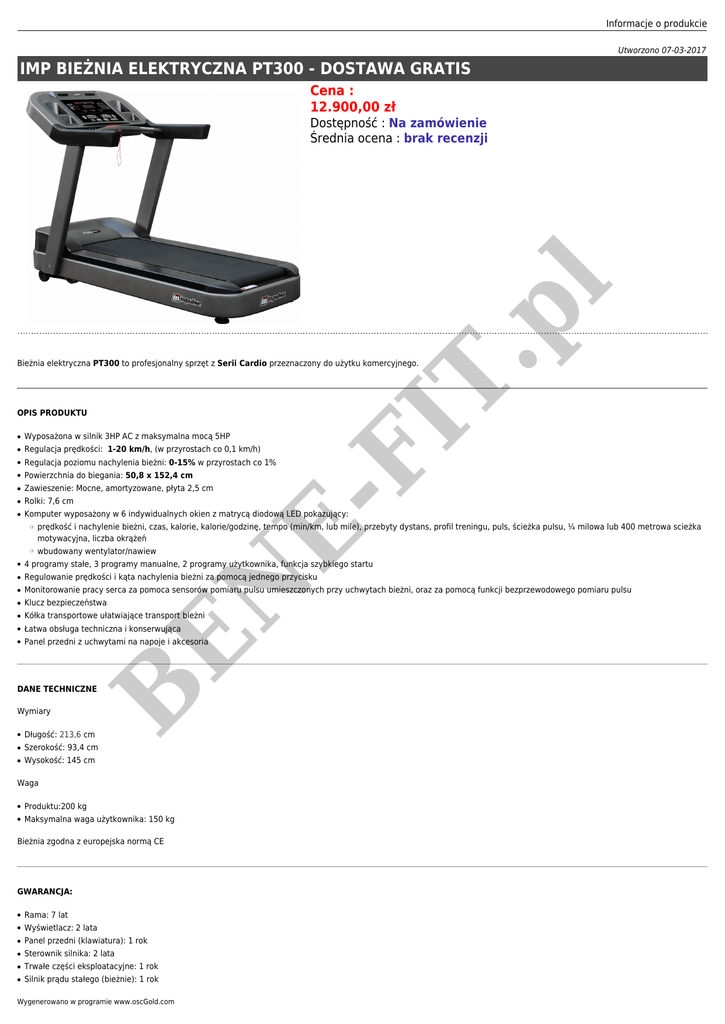 Informacje o produkcie Utworzono 07-03-2017 IMP BIEŻNIA ELEKTRYCZNA PT300 - DOSTAWA GRATIS Cena : 12.900,00 zł OPIS PRODUKTU FI T Bieżnia elektryczna PT300 to profesjonalny sprzęt z Serii Cardio przeznaczony do użytku komercyjnego. Wyposażona w silnik 3HP AC z maksymalna mocą 5HP ● Regulacja prędkości: 1-20 km/h, (w przyrostach co 0,1 km/h) ● Regulacja poziomu nachylenia bieżni: 0-15% w przyrostach co 1% ● Powierzchnia do biegania: 50,8 x 152,4 cm ● Zawieszenie: Mocne, amortyzowane, płyta 2,5 cm ● Rolki: 7,6 cm ● Komputer wyposażony w 6 indywidualnych okien z matrycą diodową LED pokazujący: ❍ B EN E- ● ❍ .p l Dostępność : Na zamówienie Średnia ocena : brak recenzji prędkość i nachylenie bieżni, czas, kalorie, kalorie/godzinę, tempo (min/km, lub mile), przebyty dystans, profil treningu, puls, ścieżka pulsu, ¼ milowa lub 400 metrowa scieżka motywacyjna, liczba okrążeń wbudowany wentylator/nawiew ● 4 programy stałe, 3 programy manualne, 2 programy użytkownika, funkcja szybkiego startu ● Regulowanie prędkości i kąta nachylenia bieżni za pomocą jednego przycisku ● Monitorowanie pracy serca za pomoca sensorów pomiaru pulsu umieszczonych przy uchwytach bieżni, oraz za pomocą funkcji bezprzewodowego pomiaru pulsu ● Klucz bezpieczeństwa ● Kółka transportowe ułatwiające transport bieżni ● Łatwa obsługa techniczna i konserwująca ● Panel przedni z uchwytami na napoje i akcesoria DANE TECHNICZNE Wymiary ● Długość: 213,6 cm ● Szerokość: 93,4 cm ● Wysokość: 145 cm Waga ● Produktu:200 kg ● Maksymalna waga użytkownika: 150 kg Bieżnia zgodna z europejska normą CE GWARANCJA: ● Rama: 7 lat ● Wyświetlacz: 2 lata ● Panel przedni (klawiatura): 1 rok ● Sterownik silnika: 2 lata ● Trwałe części eksploatacyjne: 1 rok ● Silnik prądu stałego (bieżnie): 1 rok Wygenerowano w programie www.oscGold.com Silnik prądu zmiennego (bieżnie): 3 lata ● Generator/elektromagnetyczny system hamowania: 2 lata B EN E- FI T .p l ●