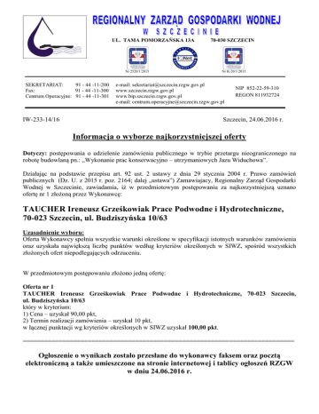 UL. TAMA POMORZAŃSKA 13A Nr 2520/1/2015 SEKRETARIAT: 91 - 44 -11-200 Fax: 91 - 44 -11-300 Centrum Operacyjne: 91 - 44 -11-301 70-030 SZCZECIN Nr K-20/1/2015 e-mail: [email protected] www.szczecin.rzgw.gov.pl www.bip.szczecin.rzgw.gov.pl e-mail: [email protected] IW-233-14/16 NIP 852-22-59-310 REGON 811932724 Szczecin, 24.06.2016 r. Informacja o wyborze najkorzystniejszej oferty Dotyczy: postępowania o udzielenie zamówienia publicznego w trybie przetargu nieograniczonego na robotę budowlaną pn.: „Wykonanie prac konserwacyjno – utrzymaniowych Jazu Widuchowa”. Działając na podstawie przepisu art. 92 ust. 2 ustawy z dnia 29 stycznia 2004 r. Prawo zamówień publicznych (Dz. U. z 2015 r. poz. 2164; dalej „ustawa”) Zamawiajacy, Regionalny Zarząd Gospodarki Wodnej w Szczecinie, zawiadamia, iż w przedmiotowym postępowaniu za najkorzystniejszą uznano ofertę nr 1 złożoną przez Wykonawcę: TAUCHER Ireneusz Grześkowiak Prace Podwodne i Hydrotechniczne, 70-023 Szczecin, ul. Budziszyńska 10/63 Uzasadnienie wyboru: Oferta Wykonawcy spełnia wszystkie warunki określone w specyfikacji istotnych warunków zamówienia oraz uzyskała największą liczbę punktów według kryteriów określonych w SIWZ, spośród wszystkich złożonych ofert niepodlegających odrzuceniu. W przedmiotowym postępowaniu złożono jedną ofertę: Oferta nr 1 TAUCHER Ireneusz Grześkowiak Prace Podwodne i Hydrotechniczne, 70-023 Szczecin, ul. Budziszyńska 10/63 który w kryterium: 1) Cena – uzyskał 90,00 pkt, 2) Termin realizacji zamówienia – uzyskał 10 pkt, w łącznej punktacji wg kryteriów określonych w SIWZ uzyskał 100,00 pkt. =========================================================================== Ogłoszenie o wynikach zostało przesłane do wykonawcy faksem oraz pocztą elektroniczną a także umieszczone na stronie internetowej i tablicy ogłoszeń RZGW w dniu 24.06.2016 r.