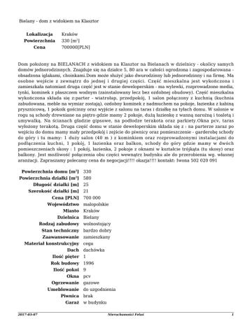 Bielany - dom z widokiem na Klasztor Lokalizacja Kraków Powierzchnia 330 [m2] Cena 700000[PLN] Dom położony na BIELANACH z widokiem na Klasztor na Bielanach w dzielnicy - okolicy samych domów jednorodzinnych. Znajduje się na działce 5, 80 ara w całości ogrodzona i zagospodarowana obsadzona iglakami, choinkami.Dom może służyć jako dwurodzinny lub jednorodzinny i na firmę. Ma osobne wejście z zewnątrz do jednej i drugiej części. Część mieszkalna jest wykończona i zamieszkała natomiast druga część jest w stanie deweloperskim - ma wylewki, rozprowadzone media, tynki, kominek z płaszczem wodnym (zainstalowany lecz bez ozdobnej obudowy). Część mieszkalna wykończona składa się z:parter - wiatrołap, przedpokój, 1 salon połączony z kuchnią (kuchnia zabudowana, meble na wymiar zostają), ozdobny kominek z nadmuchem na pokoje, łazienka z kabiną prysznicową, 1 pokoik gościnny oraz wyjście z salonu na taras i działkę na tyłach domu. W salonie w rogu są schody drewniane na piętro gdzie mamy 2 pokoje, dużą łazienkę z wanną narożną i toaletą i umywalką. Na ścianach gładzie gipsowe, na podłodze terakota oraz parkiety.Okna pcv, taras wyłożony terakotą. Druga część domu w stanie deweloperskim składa się z : na parterze zaraz po wejściu do domu mamy mały przedpokój i zejście do piwnicy oraz pomieszczenie - garderobę schody do góry i tu mamy: 1 duży salon (40 m ) z kominkiem oraz rozprowadzonymi instalacjami do podłączenia kuchni, 1 pokój, 1 łazienka oraz balkon, schody do góry gdzie mamy w dwóch pomieszczeniach skosy : 1 pokój, łazienka, 2 pokoje z oknami w kształcie trójkąta (tu skosy) oraz balkony. Jest możliwość połączenia obu części wewnątrz budynku ale do przerobienia wg. własnej aranżacji. Zapraszamy polecamy cena do negocjacji!!!! okazja!!!! kontakt: Iwona 502 020 091 Powierzchnia domu [m2] 330 Powierzchnia działki [m2] 580 Długość działki [m] 25 Szerokość działki [m] 21 Cena [PLN] 700 000 Województwo malopolskie Miasto Kraków Dzielnica Bielany Rodzaj zabudowy wolnostojący Stan techniczny bardzo dobry Zaawansowanie zamieszkany Materiał konstrukcyjny cega Dach dachówka Ilość pięter 1 Rok budowy 1996 Ilość pokoi 9 Okna pcv Ogrzewanie gazowe Umeblowanie do uzgodnienia Piwnica brak Garaż w budynku 2017-03-07 Nieruchomości Feluś 1 Zieleń tak Zobacz wszystkie oferty z działu: Domy Kraków 2017-03-07 Nieruchomości Feluś 2