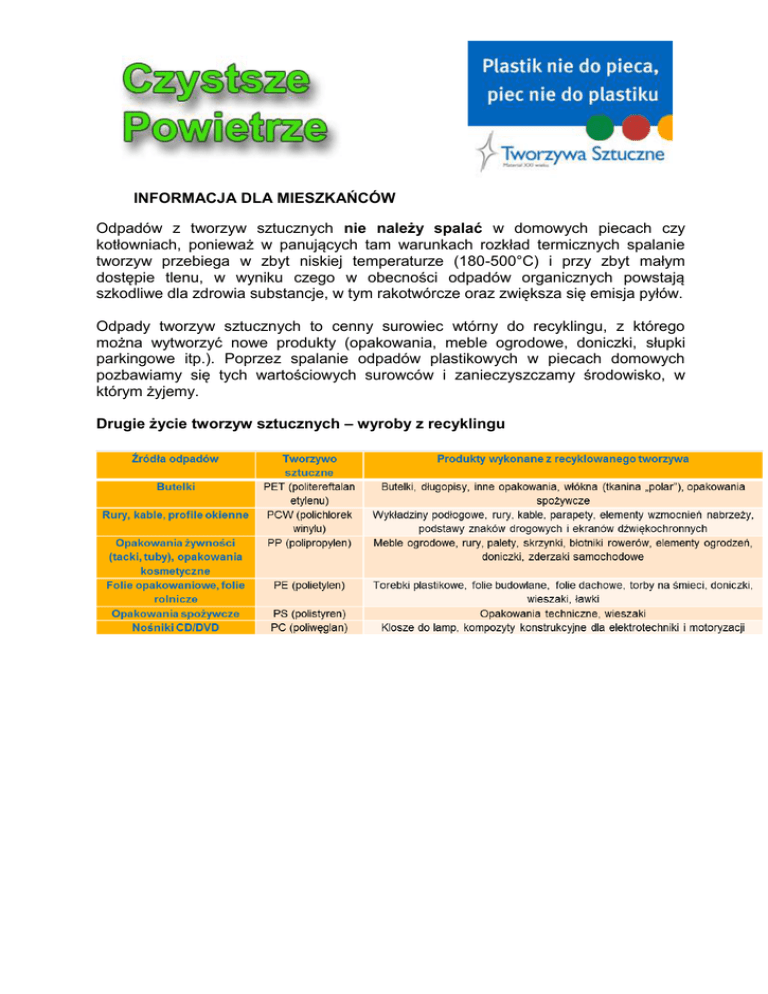 INFORMACJA DLA MIESZKAŃCÓW Odpadów z tworzyw sztucznych nie należy spalać w domowych piecach czy kotłowniach, ponieważ w panujących tam warunkach rozkład termicznych spalanie tworzyw przebiega w zbyt niskiej temperaturze (180-500°C) i przy zbyt małym dostępie tlenu, w wyniku czego w obecności odpadów organicznych powstają szkodliwe dla zdrowia substancje, w tym rakotwórcze oraz zwiększa się emisja pyłów. Odpady tworzyw sztucznych to cenny surowiec wtórny do recyklingu, z którego można wytworzyć nowe produkty (opakowania, meble ogrodowe, doniczki, słupki parkingowe itp.). Poprzez spalanie odpadów plastikowych w piecach domowych pozbawiamy się tych wartościowych surowców i zanieczyszczamy środowisko, w którym żyjemy. Drugie życie tworzyw sztucznych – wyroby z recyklingu Czy wiesz, że: Opublikowany w maju 2016 roku raport WHO wskazuje, że 33 z 50 miast Unii Europejskiej o najbardziej zanieczyszczonym powietrzu położone jest na terenie naszego kraju. Niechlubne pierwsze miejsce zajął Żywiec, tuż za nim uplasowała się Pszczyna a w pierwszej dziesiątce znalazły się jeszcze Rybnik (4 miejsce), Wodzisław Śląski (5), Opoczno (6), Sucha Beskidzka (7) i Godów (8). Mieszkańcy polskich miast i gmin mogą na bieżąco zapoznać się ze stanem powietrza monitorowanym w najbliższej stacji pomiarowej. Informacje te są zamieszczone na stronie Głównego Inspektoratu Ochrony Środowiska: http://powietrze.gios.gov.pl/pjp/home Z raportu GUS „Ochrona Środowiska w Polsce 2015” wynika m.in., że ze spalania w gospodarstwach domowych wytwarzane jest prawie czterokrotnie więcej pyłów niż łącznie emituje sektor produkcji i transformacji energii. Do takiego stanu rzeczy przyczynia się nie tylko palenie paliwem niskiej jakości, ale także spalanie odpadów w piecach, kominkach czy na wolnym powietrzu - zjawisko to jest w Polsce niestety nadal powszechne. Według Światowej Organizacji Zdrowia (WHO) długotrwałe narażenie na działanie pyłu zawieszonego PM 2,5 (jest to pył o średnicy nie większej niż 2,5 mikrometrów, tj. 20-35 razy mniejszej niż wynosi średnica ludzkiego włosa) skutkuje skróceniem średniej długości życia, a krótkotrwała ekspozycja na wysokie stężenia tego pyłu powoduje wzrost liczby zgonów z powodu chorób układu oddechowego i krążenia oraz wzrost ryzyka nagłych przypadków wymagających hospitalizacji (nasilenie astmy, ostra reakcja układu oddechowego, osłabienie czynności płuc). Pomocne linki: www.plasticeurope.pl http://misja-emisja.pl/ http://www.niskaemisja.pl/ http://waznamisjazdrowaemisja.pl/niska-emisja-wysoki-poziom-zagrozenia/