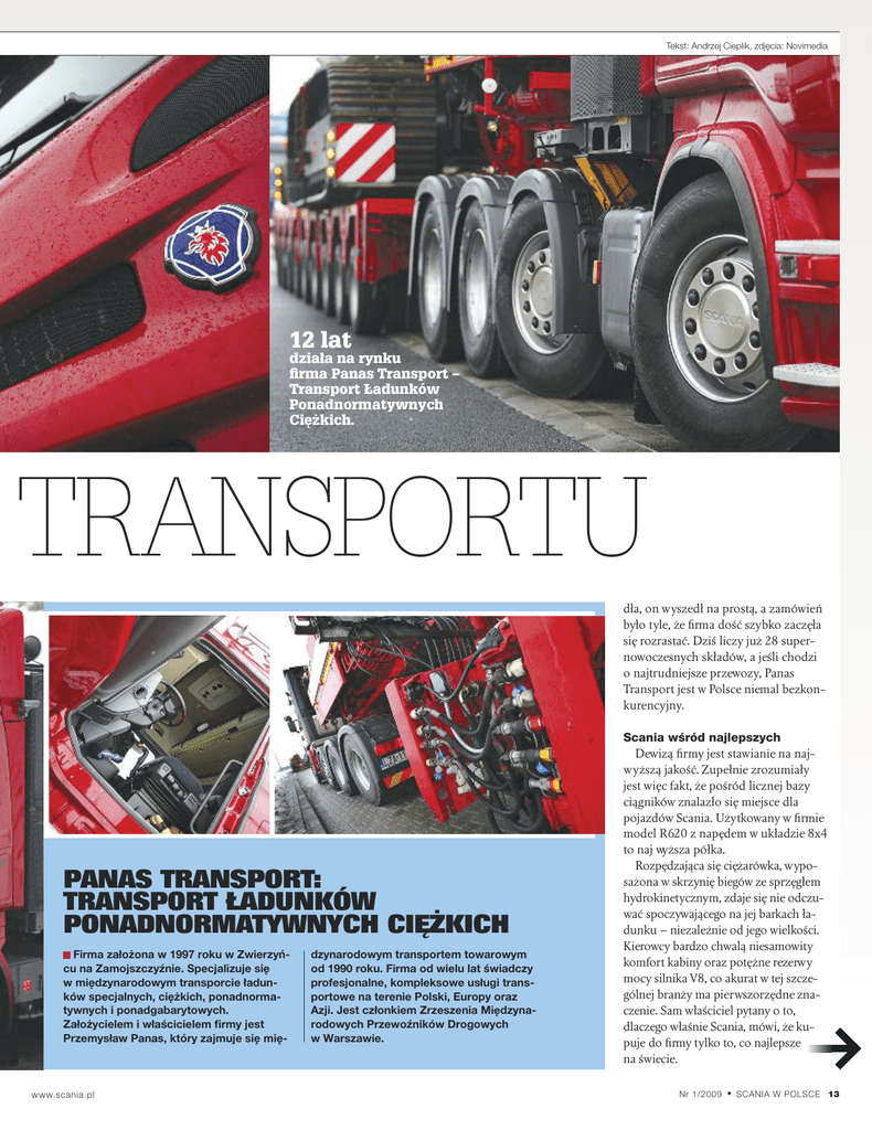 Tekst:AndrzejCieplik,zdjęcia:Novimedia 12 lat działa na rynku firma Panas Transport – Transport Ładunków Ponadnormatywnych Ciężkich. transPortu dła, on wyszedł na prostą, a zamówień było tyle, że firma dość szybko zaczęła się rozrastać. Dziś liczy już 28 supernowoczesnych składów, a jeśli chodzi o najtrudniejsze przewozy, Panas Transport jest w Polsce niemal bezkonkurencyjny. Panas TransPorT: TransPorT ładunkóW PonadnorMaTYWnYch cięŻkich Firmazałożonaw 1997rokuw Zwierzyńcuna Zamojszczyźnie.Specjalizujesię w międzynarodowymtransporcieładunkówspecjalnych,ciężkich,ponadnormatywnychi ponadgabarytowych. Założycielemi właścicielemfirmyjest PrzemysławPanas,któryzajmujesięmię- www.scania.pl dzynarodowymtransportemtowarowym od 1990roku.Firmaod wielulatświadczy profesjonalne,kompleksoweusługitransportowena tereniePolski,Europyoraz Azji.JestczłonkiemZrzeszeniaMiędzynarodowychPrzewoźnikówDrogowych w Warszawie. scania wśród najlepszych Dewizą firmy jest stawianie na najwyższą jakość. Zupełnie zrozumiały jest więc fakt, że pośród licznej bazy ciągników znalazło się miejsce dla pojazdów Scania. Użytkowany w firmie model R620 z napędem w układzie 8x4 to naj wyższa półka. Rozpędzająca się ciężarówka, wyposażona w skrzynię biegów ze sprzęgłem hydrokinetycznym, zdaje się nie odczuwać spoczywającego na jej barkach ładunku – niezależnie od jego wielkości. Kierowcy bardzo chwalą niesamowity komfort kabiny oraz potężne rezerwy mocy silnika V8, co akurat w tej szczególnej branży ma pierwszorzędne znaczenie. Sam właściciel pytany o to, dlaczego właśnie Scania, mówi, że kupuje do firmy tylko to, co najlepsze na świecie. Nr1/2009 • SCANIAWPOLSCE 13