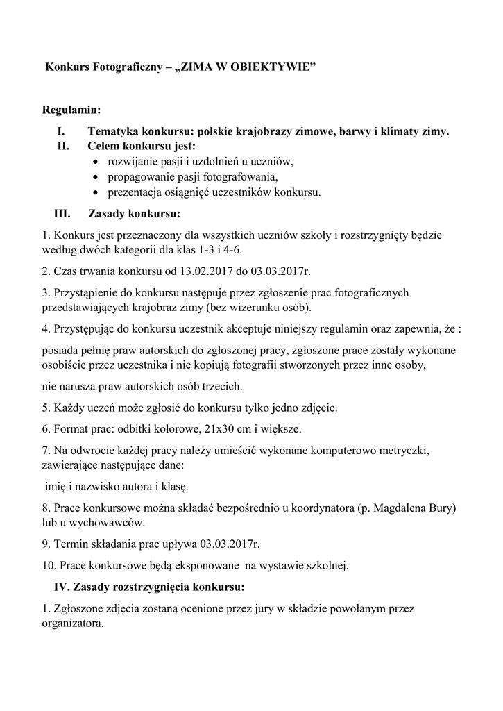 Konkurs Fotograficzny – „ZIMA W OBIEKTYWIE” Regulamin: I. II. Tematyka konkursu: polskie krajobrazy zimowe, barwy i klimaty zimy. Celem konkursu jest: rozwijanie pasji i uzdolnień u uczniów, propagowanie pasji fotografowania, prezentacja osiągnięć uczestników konkursu. III. Zasady konkursu: 1. Konkurs jest przeznaczony dla wszystkich uczniów szkoły i rozstrzygnięty będzie według dwóch kategorii dla klas 1-3 i 4-6. 2. Czas trwania konkursu od 13.02.2017 do 03.03.2017r. 3. Przystąpienie do konkursu następuje przez zgłoszenie prac fotograficznych przedstawiających krajobraz zimy (bez wizerunku osób). 4. Przystępując do konkursu uczestnik akceptuje niniejszy regulamin oraz zapewnia, że : posiada pełnię praw autorskich do zgłoszonej pracy, zgłoszone prace zostały wykonane osobiście przez uczestnika i nie kopiują fotografii stworzonych przez inne osoby, nie narusza praw autorskich osób trzecich. 5. Każdy uczeń może zgłosić do konkursu tylko jedno zdjęcie. 6. Format prac: odbitki kolorowe, 21x30 cm i większe. 7. Na odwrocie każdej pracy należy umieścić wykonane komputerowo metryczki, zawierające następujące dane: imię i nazwisko autora i klasę. 8. Prace konkursowe można składać bezpośrednio u koordynatora (p. Magdalena Bury) lub u wychowawców. 9. Termin składania prac upływa 03.03.2017r. 10. Prace konkursowe będą eksponowane na wystawie szkolnej. IV. Zasady rozstrzygnięcia konkursu: 1. Zgłoszone zdjęcia zostaną ocenione przez jury w składzie powołanym przez organizatora. 2. Ogłoszenie wyników nastąpi do 10.03.2017 r.(na stronie internetowej szkoły i tablicy na paterze). 3. Trzy najlepsze prace zostaną nagrodzone. Jury zostawia sobie prawo do przyznania wyróżnień. 4. Wszyscy uczniowie będą mogli oddać głos na najlepsze zdjęcie, a zwycięzca otrzyma nagrodę publiczności. 5. Organizator nie zwraca zgłoszonych prac. V. Postanowienia końcowe: 1. Udział w konkursie jest równoznaczny z wyrażaniem zgody na wykorzystanie danych osobowych uczestnika. 2. Organizator nie ponosi odpowiedzialności za naruszenie praw autorskich osób trzecich przez uczestników konkursu. 3. Niniejszy Regulamin dostępny jest na stronie internetowej szkoły. Serdecznie zapraszamy do udziału w konkursie