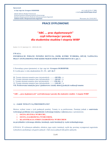 Opracował: st. kpt. mgr inż. Grzegorz OGRODNIK tel. (+48-22) 56 17 552 e-mail: [email protected] Szkoła Główna Służby Pożarniczej Wydział Inżynierii Bezpieczeństwa Pożarowego Katedra Bezpieczeństwa Budowli i Rozpoznawania Zagrożeń Zakład Analiz i Rozpoznawania Zagrożeń Warszawa, dn. 23.02.2015 PRACE DYPLOMOWE "ABC ... prac dyplomowych" czyli informacje i porady dla studentów studiów I stopnia WIBP Autor: G. O. (wersja 2.1 - 2015.02.23) UWAGA: INFORMACJE PODANE PONIŻEJ DOTYCZĄ OSÓB, KTÓRE WYBIORĄ OPCJĘ NAPISANIA PRACY DYPLOMOWEJ POD KIERUNKIEM OSÓB WYMIENIONYCH w pkt. I. __________________________________________________________________________________________ I. Prowadzący prace (promotor): st. kpt. mgr inż. Grzegorz OGRODNIK II. Liczba prac w roku akademickim 20../20..: od 1 do 5 __________________________________________________________________________________________ III. Termin złożenia tematów prac inżynierskich: ……. (SP-PK…) IV. Termin złożenia tematów prac inżynierskich: ……. (SP-PC…) V. Termin złożenia tematów prac inżynierskich: ……. (NP-PS…) VI. Termin złożenia tematów prac inżynierskich: ……. (NP-PC…) VII. Preferowana tematyka prac i podstawowe zasady dobrej praktyki realizacji tematu: __________________________________________________________________________________________ "ABC ... prac dyplomowych" czyli informacje i porady dla studentów studiów I stopnia WIBP __________________________________________________________________________________________ A) JAKIE TEMATY SĄ PREFEROWANE? Możesz wybrać temat z tych podanych poniżej. Tematy te są preferowane. Pamiętaj jednak o omówieniu wybranego problemu oraz uzgodnieniu wybranego tematu, i zakresu pracy z promotorem. 1. OCENA RYZYKA WYBUCHU, 2. OCENA ZAGROŻENIA WYBUCHEM, 3. KLASYFIKACJA STREF ZAGROŻENIA WYBUCHEM na przykładzie wybranego obiektu, instalacji, części instalacji tj. węzła technologicznego. (UWAGA: W wybranym zakładzie, obiekcie, jego części, instalacji, węźle itp. powinny występować zagrożenia wybuchowe pochodzące od gazów palnych i/lub cieczy palnych lub pyłów palnych). 1z4 Opracował: st. kpt. mgr inż. Grzegorz OGRODNIK tel. (+48-22) 56 17 552 e-mail: [email protected] Szkoła Główna Służby Pożarniczej Wydział Inżynierii Bezpieczeństwa Pożarowego Katedra Bezpieczeństwa Budowli i Rozpoznawania Zagrożeń Zakład Analiz i Rozpoznawania Zagrożeń Warszawa, dn. 23.02.2015 B) CZY MOGĘ WYBRAĆ INNY TEMAT? Możesz określić i wybrać inną tematykę pracy niż ta określona w pkt. 1). Pamiętaj jednak o omówieniu problemu oraz uzgodnieniu tematu, i zakresu pracy z promotorem. C) CO WARTO ZROBIĆ PRZED WYBOREM TEMATU? Przed wyborem tematu upewnij się, że będziesz miał dostęp do analizowanego obiektu. Wybierz tylko ten zakład (obiekt), który umożliwi (ułatwi) Ci: 1. Przeprowadzenie wizji lokalnych 2. Weryfikację rozwiązań 3. Wyjaśnienie sytuacji związanej z analizowanymi zagrożeniami 4. Wykonanie dokumentacji fotograficznej dotyczącej tematu Pamiętaj, iż wykonanie ww. czynności będzie możliwe jeżeli wcześniej to uzgodnisz z użytkownikiem obiektu. Nie zawsze jest to oczywiste (zapewnione). Nie dzwoń i nie przedstawiaj szczegółów problemu w rozmowie telefonicznej. Skazujesz się na niepowodzenie. Umów się na spotkanie. Na spotkaniu wyraźnie przedstaw problem i pełny zakres czynności, przy których realizacji oczekiwałbyś pomocy (współpracy) ze strony użytkownika obiektu. Jeżeli tego nie zrobisz spodziewaj się problemów, które uniemożliwią Ci wykonanie pracy. W praktyce wiąże się to z dużą trudnością właściwego opracowania tematu. D) O CO DODATKOWO ZADBAĆ PRZED WYBOREM TEMATU? Przed wyborem tematu upewnij się, że będziesz miał wgląd do dokumentacji analizowanego obiektu. Nie zawsze jest to oczywiste. Uzgodnij to na spotkaniu, o którym mowa w pkt. C). Wybierz tylko ten zakład (obiekt), który: umożliwi Ci wgląd w dokumentację budowlaną (jeżeli będzie to niezbędne), umożliwi Ci wgląd w dokumentację instalacyjną (jw.), umożliwi Ci wgląd w dokumentację technologiczną (jw.), udostępni Ci ogólny opis procesu technologicznego (jw.), udostępni Ci schemat technologiczny itp. Warto, żebyś ustalił, czy dokumentacja w rzeczywistości jest dostępna, czy znajduje się „fizycznie” w obiekcie (zakładzie). Opcję „może jest” lub „powinna być” potwierdź przed wyborem i zaakceptowaniem tematu. Dokumentacja w postaci "Instrukcji bezpieczeństwa pożarowego" nie wystarczy, a w większości przypadków jest w ogóle nieprzydatna. Pamiętaj, iż wgląd w ww. dokumentację może być niemożliwy lub znacznie ograniczony, jeżeli wcześniej tego nie uzgodnisz z użytkownikiem obiektu. Nie dzwoń i nie przedstawiaj szczegółów problemu w rozmowie telefonicznej. Skazujesz się na niepowodzenie. Umów się na spotkanie. Na spotkaniu wyraźnie przedstaw 2z4 Opracował: st. kpt. mgr inż. Grzegorz OGRODNIK tel. (+48-22) 56 17 552 e-mail: [email protected] Szkoła Główna Służby Pożarniczej Wydział Inżynierii Bezpieczeństwa Pożarowego Katedra Bezpieczeństwa Budowli i Rozpoznawania Zagrożeń Zakład Analiz i Rozpoznawania Zagrożeń Warszawa, dn. 23.02.2015 problem. Jeżeli tego nie zrobisz spodziewaj się problemów, które uniemożliwią Ci wykonanie pracy. W praktyce wiąże się to z dużą trudnością właściwego opracowania tematu. E) CO JESZCZE WARTO USTALIĆ? Pamiętaj jeszcze o co najmniej dwóch sprawach: 1. Ustal, czy były wykonywane jakiekolwiek oceny zagrożeń wybuchowych i czy będą dostępne. 2. Uzgodnij (poproś o) opiekuna tj. osobę, która ułatwi i zapewni Ci możliwość współpracy z kompetentnymi osobami w celu pozyskiwania informacji, wyjaśnień itp. F) ILE POTRZEBUJĘ CZASU? JAK TO WYGLĄDA Z PUNKTU WIDZENIA REALIZACJI TEMATU? Na to pytanie nie ma jednoznacznej odpowiedzi. Zależy to od wielu czynników, m.in. o