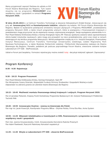 Mamy przyjemność zaprosić Państwa do udziału w XVI Forum Klastra Bioenergia dla Regionu. Tym razem skupimy się na programie PROSUMENT oraz współpracy nauki i gospodarki w ramach Programu Horyzont 2020. W dniu 20.05.2015 r. w Centrum Transferu Technologii w obszarze Odnawialnych Źródeł Energii, mieszczącym się przy ul. Innowacyjnej 9/11 w Konstantynowie Łódzkim, odbędzie się kolejne, XVI Forum Klastra Bioenergia dla Regionu. Będzie to wydarzenie poświęcone omówieniu korzyści płynących z Programu PROSUMENT, przedstawieniu programu Horyzont 2020, a także innych programów unijnych, które w powiązaniu z finansowaniem krajowym z powodzeniem mogą przyczyniać się do wspierania rozwoju rozproszonej energetyki. Swoje wystąpienie potwierdziła m.in. Pani Poseł Elżbieta Królikowska-Kińska z Komisji Energetyki Sejmu RP. Podczas spotkania zostanie także zaprezentowana oferta badań instytutów naukowych, jakie mogą one prowadzić na rzecz przedsiębiorstw, gmin oraz miast w ramach otwierających się wkrótce programów dotacyjnych. Wśród prelegentów znajdą się m.in. Instytut Energetyki, Przemysłowy Instytut Motoryzacji, Centrum Transferu Technologii Uniwersytetu Łódzkiego, Łódzki Regionalny Park Naukowo-Technologiczny, a także Wydziały Politechniki Łódzkiej i Politechniki Warszawskiej należące do Klastra Bioenergia dla Regionu. Ponadto, podobnie jak podczas poprzedniego Forum Klastra, otworzone zostanie kolejne Laboratorium CTT OZE – BioProcessLab. Udział w Forum jest bezpłatny. Formularz rejestracyjny można znaleźć tutaj - decyduje kolejność zgłoszeń. Zapraszamy! Program Konferencji 8:30 - 9:30 Rejestracja 9:30 - 10:15 Program Prosument Pani Poseł Elżbieta Królikowska-Kińska, Komisja Energetyki, Sejm RP Pan Wiceprezes Cezary Dzierżek, Wojewódzki Fundusz Ochrony Środowiska i Gospodarki Wodnej w Łodzi Odpowiedzi na zebrane pytania od członków klastra Bioenergia dla Regionu 10:15 - 10:45 Możliwość montażu finansowego dotacji krajowych i unijnych. Program Horyzont 2020. Pan dr Jarosław Piekarski, Krajowy Punkt Kontaktowy Programów Badawczych UE, Instytut Podstawowych Problemów Techniki PAN 10:45 - 10:55 Innowacyjne Oxytree - szansą na bioenergię dla Polski Pan mgr inż. Jacek Krawczyk, Koordynator Programu BBlue - Oxytree Polska, Firma Eko-Max, Avina System 10:55 - 11:25 Własność intelektualna w inwestycjach w OZE, finansowanych z programów na rozwój współpracy nauki i gospodarki Pani mec. Joanna Grzywaczewska, Ceret, Grzywaczewska Kancelaria Radców Prawnych Pan Adam Pawłowski, Rzecznik Patentowy Kancelarii eupatent.pl 11:25 - 11:45 Wizyta w Laboratoriach CTT OZE - otwarcie BioProcessLab 11:25 - 11:35 Prezentacja BioProcessLab, dr inż. Karina Michalska (grupa 1 - max. 20 osób) 11:25 - 11:35 Prezentacja BioMassLab, dr inż. Szymon Szufa (grupa 2 - max. 20 osób) 11:35 - 11:45 Prezentacja BioProcessLab, dr inż. Karina Michalska (grupa 2 - max. 20 osób) 11:35 - 11:45 Prezentacja BioMassLab, dr inż. Szymon Szufa (grupa 1 - max. 20 osób) 11:45 - 12:00 Przerwa kawowa 12:00 - 12:20 Prezentacja rezultatów projektu FABbiogas Pan dr inż. Radosław Ślęzak, Wydział Inżynierii Procesowej i Ochrony Środowiska Politechniki Łódzkiej 12:20 - 14:30 Prezentacja oferty badawczej instytutów naukowych dla członków klastra Bioenergia dla Regionu Wydział Inżynierii Procesowej i Ochrony Środowiska Politechniki Łódzkiej - prof. dr hab. inż. Czesław Kuncewicz, dr Michał Głogowski Instytut Energetyki, Oddział Techniki Cieplnej w Łodzi - dr inż. Jacek Karczewski, mgr inż. Sławomir Pilarski Instytut Energetyki, Instytut Badawczy w Warszawie - dr inż. Andrzej Sławiński Wydział Organizacji i Zarządzania Politechniki Łódzkiej - dr inż. Joanna Kopania, dr Robert Blaźlak Przemysłowy Instytut Motoryzacji, PIMOT - dr inż. Anna Zamojska-Jaroszewicz Wydział Inżynierii Lądowej Politechniki Warszawskiej - dr inż. Wojciech Terlikowski Wydział Mechaniczny Energetyki i Lotnictwa Politechniki Warszawskiej, Instytut Techniki Cieplnej - prof. Jarosław Milewski Wydział Budownictwa, Architektury i Inżynierii Środowiska Politechniki Łódzkiej - dr inż. Konrad Witczak Wydział Chemiczny Politechniki Łódzkiej - prof. dr hab. inż. Wojciech Wolf Centrum Transferu Technologii Uniwersytetu Łódzkiego - mgr Anastazja Zdrajkowska Łódzki Regionalny Park Naukowo-Technologiczny - Joanna Jagas Instytut Ogrodnictwa, Zakład Hodowli Roślin Sadowniczych - prof. dr hab. Małgorzata Korbin Europejskie Regionalne Centrum Ekohydrologii PAN - dr Magdalena Urbaniak Instytut Technologiczno-Przyrodniczy, Oddział w Warszawie ASM - Centrum Badań i Analiz Rynku - Przemysław Dana 14:30 - 15:30 Warsztaty projektu FABbiogas oraz spotkania bilateralne Dojazd Strona CBI Pro-Akademia używa ciasteczek (cookies), dzięki którym nasz serwis może działać lepiej. Zobacz