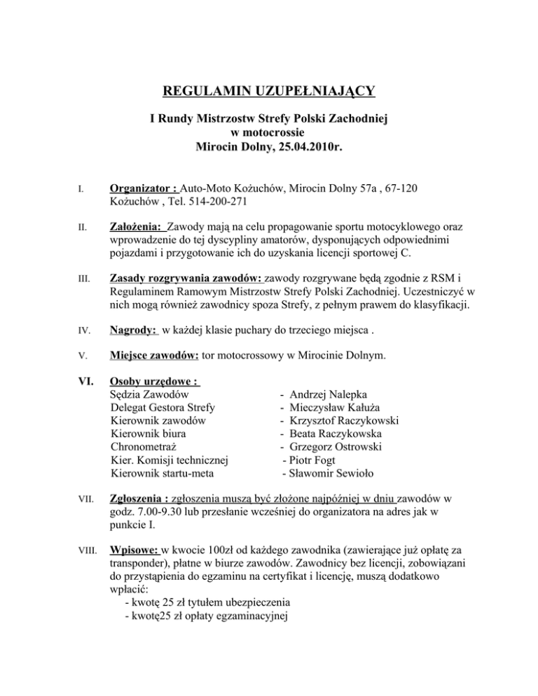 REGULAMIN UZUPEŁNIAJĄCY I Rundy Mistrzostw Strefy Polski Zachodniej w motocrossie Mirocin Dolny, 25.04.2010r. I. Organizator : Auto-Moto Kożuchów, Mirocin Dolny 57a , 67-120 Kożuchów , Tel. 514-200-271 II. Założenia: Zawody mają na celu propagowanie sportu motocyklowego oraz wprowadzenie do tej dyscypliny amatorów, dysponujących odpowiednimi pojazdami i przygotowanie ich do uzyskania licencji sportowej C. III. Zasady rozgrywania zawodów: zawody rozgrywane będą zgodnie z RSM i Regulaminem Ramowym Mistrzostw Strefy Polski Zachodniej. Uczestniczyć w nich mogą również zawodnicy spoza Strefy, z pełnym prawem do klasyfikacji. IV. Nagrody: w każdej klasie puchary do trzeciego miejsca . V. Miejsce zawodów: tor motocrossowy w Mirocinie Dolnym. VI. Osoby urzędowe : Sędzia Zawodów Delegat Gestora Strefy Kierownik zawodów Kierownik biura Chronometraż Kier. Komisji technicznej Kierownik startu-meta - Andrzej Nalepka - Mieczysław Kałuża - Krzysztof Raczykowski - Beata Raczykowska - Grzegorz Ostrowski - Piotr Fogt - Sławomir Sewioło VII. Zgłoszenia : zgłoszenia muszą być złożone najpóźniej w dniu zawodów w godz. 7.00-9.30 lub przesłanie wcześniej do organizatora na adres jak w punkcie I. VIII. Wpisowe: w kwocie 100zł od każdego zawodnika (zawierające już opłatę za transponder), płatne w biurze zawodów. Zawodnicy bez licencji, zobowiązani do przystąpienia do egzaminu na certyfikat i licencję, muszą dodatkowo wpłacić: - kwotę 25 zł tytułem ubezpieczenia - kwotę25 zł opłaty egzaminacyjnej Biuro zawodów: biuro zawodów czynne w niedzielę od godz. 7.00 do zakończenia zawodów W biurze należy przedstawić następujące dokumenty: - wypełnione i podpisane zgłoszenie - dowód tożsamości lub odpowiednią ważną licencję i certyfikat (w przypadku jej posiadania) - zdolność od lekarza medycyny sportowej lub książeczkę zdrowia sportowca Zawodnicy niepełnoletnich, nieposiadających licencji, muszą przedłożyć pisemną zgodę rodziców lub opiekunów prawnych na udział w zawodach. IX. X. Odbiór trasy: odbiór trasy przez sędziego zawodów w niedzielę o godz.8.00. XI. Odprawa zawodników: godz.12.00 - w parku maszyn. XII. Odbiór techniczny: zgodnie z harmonogramem zawodów. Kolory tła i cyfr wg regulaminu Strefy. XIII. Park maszyn: zlokalizowany w bezpośrednim sąsiedztwie toru motocrossowego Mycie motocykli w parku maszyn jest zabronione - organizator wyznaczy teren do tego celu. W parku maszyn obowiązują maty środowiskowe i dywaniki pod motocykle w miejscu serwisowania. XIV. Trasa: o nawierzchni piaszczystej, gliniastej . Długość - 1500 m. Minimalna szerokość - 6 m. XV. Wyposażenie zawodnika: zawodnicy muszą być wyposażeni zgodnie z RSM pkt.04.65 i 04.67 . XVI. Klasy biorące udział w zawodach: • klasa młodzik - licencja C lub bez licencji, wiek od 10 do 15 lat , motocykle o pojemności do 85cc 2T oraz do 150cc 4T, - licencja A i B, wiek i motocykle j.w. oraz dodatkowo motocykle o pojemności do 65cc 2T i wiek od 8 do 12 lat; czas wyścigu 10 min. + 2 okrążenia • klasa junior - wiek od 15 do 19 lat, licencja C lub bez licencji, motocykle o poj. do 144cc 2 T i do 250cc 4T, czas wyścigu 12 min. + 2 okrążenia • klasa otwarta I - wiek od 17 do 30 lat, licencja C lub bez licencji, motocykle o poj. pow. 90cc 2T i pow. 250cc 4T, czas wyścigu 15 min. + 2 okrążenia • klasa otwarta II - wiek pow. 30 lat, pozostałe kryteria jak dla kl. otwartej I • klasa quad open 2K – quady z napędem na jedną oś, wiek od 14 lat i poj. do 450cc oraz wiek od 17 lat i poj. do 750cc , czas wyścigu 12 min.+ 2 okr. • klasa otwarta licencja - licencja A i B, wiek od 14 lat, motocykle o poj. od 100cc 2T i 175cc 4T, czas wyścigu 15 min. + 2 okr. • klasa weteran - wiek od 40 lat (od rocznika 1970), motocykle o poj. od 125cc, czas wyścigu 12 min.+2 okr., Klasę stanowi minimum 6 zawodników. W przypadku mniejszej ilości zawodników w danej klasie, nastąpi połączenie klas (nie dotyczy klas młodzik i quad). XVII. Udział zawodników zagranicznych: dopuszcza się udział zawodników zagranicznych spełniających wymagania niniejszego regulaminu. XVIII. Wyniki: nieoficjalne 10 min. po każdym biegu, oficjalne 30 min po wywieszeniu nieoficjalnych wyników. XIX. Protesty: Zgłoszenia protestów zgodnie z RSM. Wymagana kaucja w wysokości 500 zł. XXI. Ubezpieczenia: zawody będą ubezpieczone od odpowiedzialności cywilnej OC, a osoby funkcyjne od NNW. Organizator nie odpowiada za ewentualne straty i szkody w stosunku do zawodników i ich sprzętu jak i szkody oraz straty spowodowane bezpośrednio w stosunku osób trzecich i mienia. XXII. Postanowienia końcowe: we wszystkich sprawach nie unormowanych niniejszym regulaminem zastosowanie mają odnośnie przepisy RSM oraz komunikaty GKSM. Organizator zastrzega sobie prawo interpretacji niniejszego regulaminu. Kierownik Zawodów Krzysztof Raczykowski Zatwierdzone przez Gestora Strefy Polski Zachodniej Poznań, 12.04.2010r. HARMONOGRAM CZASOWY ZAWODÓW I runda Mistrzostw Strefy Polski Zachodniej w motocrossie Mirocin Dolny, 25.04.2010r. 1.Biuro zawodów czynne: 2. Odbiór trasy przez sędziego zawodów 3. Odbiory techniczne 4. Treningi: a) trening dowolny (w tym próby startu): 7.00 – do zakończenia zawodów 8.00 7.00 – 10.00 Klasa młodzik Klasa junior Klasa otwarta amator I Klasa otwarta amator II Klasa quad open Klasa otwarta licencja + weteran b) egzamin na licencję „C” - 8.30 – 8.45 8.45 - 9.00 9.00 - 9.15 9.15 - 9.30 9.30 – 9.45 9.45 - 10.00 godz. 10.00 c) trening obowiązkowy z pomiarem czasu: Klasa młodzik Klasa junior Klasa otwarta amator I Klasa otwarta amator II Klasa quad open Klasa otwarta licencja+weteran - 10.45 - 10.55 10.55 - 11.05 11.05 – 11.15 11.15 – 11.25 11.25 - 11.35 11.35 - 11.45 5. Odprawa zawodników i otwarcie zawodów: godz.12.00 - w parku maszyn. 6. Start Pierwszy bieg: Klasa młodzik - przedpark 12.20 - start 12.30 (10 min + 2 o