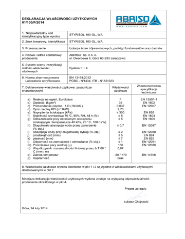 DEKLARACJA WŁAŚCIWOŚCI UśYTKOWYCH 01/100/F/2014 1. Niepowtarzalny kod identyfikacyjny typu wyrobu STYRISOL 100 GL, WA 2. Znak towarowy, identyfikacja STYRISOL 100 GL, WA 3. Przeznaczenie Izolacja ścian trójwarstwowych, podłóg i fundamentów oraz dachów 4. Nazwa i adres kontaktowy producenta ABRISO Sp. z o. o. ul. Dworcowa 6, Góra 63-233 Jaraczewo 5. System oceny i weryfikacji stałości właściwości uŜytkowych System 3 + 4 6. Norma zharmonizowana Laboratoria notyfikowane EN 13164:2012 PCBC - N°1434, ITB - N° AB 023 7. Deklarowane właściwości uŜytkowe: zasadnicze charakterystyki a) b) c) d) e) f) g) h) i) j) k) l) m) n) o) p) Reakcja na ogień, Euroklasa Gęstość (kg/m³) Przewodność cieplna λ D ( W/mK ) Opór cieplny RD (m².K/W) NapręŜenia ściskające (kPa) Stabilność wymiarowa 70 °C, 90% RH, 48 h (%) Odkształcenie przy określonym obciąŜeniu ściskającym i temperaturze 40 kPa, 70 ° C, 168 h (%) Długotrwała absorpcja wody przez zanurzenie (% obj.) Absorpcja wody przy długotrwałej dyfuzji (% obj.) prostokątność (mm) płaskość (mm) Odporność na zamraŜanie i odmraŜanie (% obj.) Przenikanie pary wodnej (µ) Współczynnik rozszerzalności liniowej przez ∆ T 60 ° C (mm / m) Zakres temperatur Kapilarność Właściwości uŜytkowe Zharmonizowana specyfikacja techniczna F 33 0,037 2,70 ≥ 300 ≤5 ≤5 EN 13501-1 EN 1602 EN 12667 ≤ 0,7 EN 12087 ≤2 ≤5 ≤7 ≤1 150 0,07 EN 12088 EN 824 EN 825 EN 12091 EN 12086 -50 / +70 brak EN 14706 EN 826 EN 1604 EN 1605 8. Właściwości uŜytkowe wyrobu określone w pkt 1 i 2 są zgodne z właściwościami uŜytkowymi deklarowanymi w pkt 7. Niniejsza deklaracja właściwości uŜytkowych wydana zostaje na wyłączną odpowiedzialność producenta określonego w pkt 4. Prezes zarządu Łukasz Chojnacki Góra, 24 luty 2014