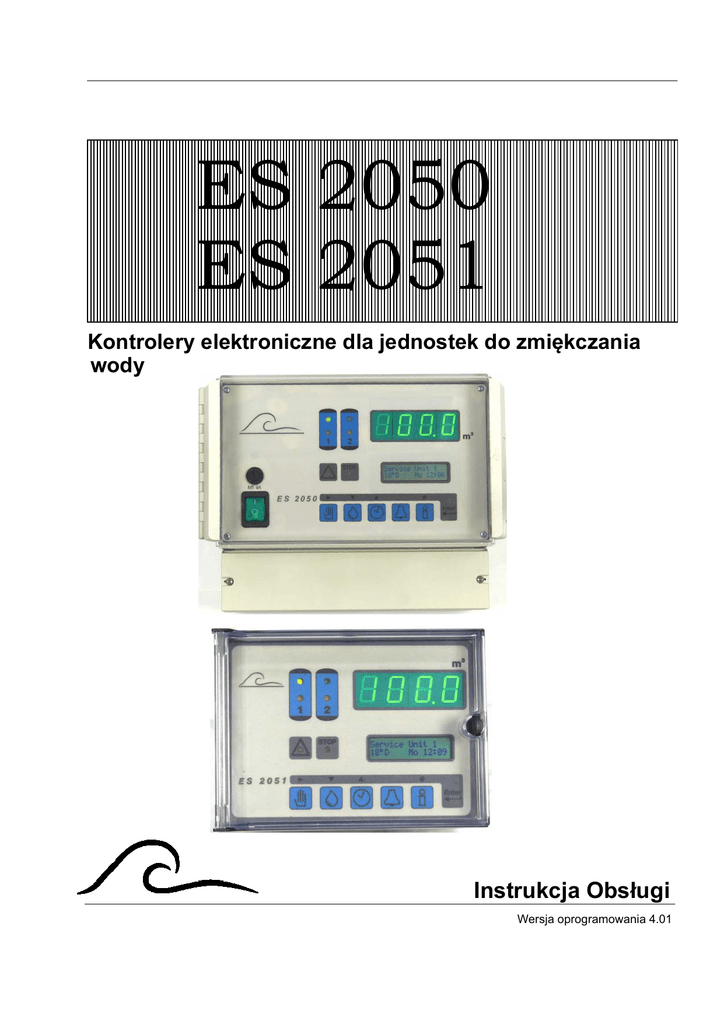 ES 2050 ES 2051 Kontrolery elektroniczne dla jednostek do zmiękczania wody Instrukcja Obsługi Wersja oprogramowania 4.01 SPIS TREŚCI Opis systemu .......................................................................................................................................... 1 Mocowany do ściany ES 2050, mocowany na panelu ES 2051 ........................................................... 2 Komunikaty dot. stanu i regeneracji ....................................................................................................... LED-ekran ......................................................................................................................................... LED – lampki kontrolne ..................................................................................................................... LCD - wyświetlacz ............................................................................................................................. Stan serwisowania ....................................................................................................................... Stan regeneracji ........................................................................................................................... 3 3 3 3 3 4 Zmienianie i wskazania wartości programu ........................................................................................... Twardość dostarczanej wody ............................................................................................................ Aktualny czas .................................................................................................................................... EKRANY Informacyjne ...................................................................................................................... Okres płukania ............................................................................................................................. Czas regeneracji .......................................................................................................................... Dodatkowy program ..................................................................................................................... Pojemność jednostki .................................................................................................................... Wytwarzana oczyszczona woda .................................................................................................. Wejścia ......................................................................................................................................... Wyjścia ......................................................................................................................................... Serwis – numer telefonu............................................................................................................... Konserwacja ................................................................................................................................. Wersja oprogramowania .............................................................................................................. 5 5 6 6 6 6 7 7 7 8 8 8 8 8 Alarmy / ostrzeżenia ............................................................................................................................... 9 Przekroczona zaprogramowana wydajność ..................................................................................... 9 Awaria zasilania prądem ................................................................................................................. 10 Napełnianie zbiornika chemicznego ................................................................................................ 10 Oczekiwanie na regenerację ........................................................................................................... 11 Wstępny kontakt (ostrzeżenie przed inicjacją regeneracji) ............................................................. 11 Minimalny limit czasu między regeneracjami .................................................................................. 12 Przekroczona minimalna/maksymalna zaprogramowana wartość ................................................. 12 Komunikat: Konserwacja ................................................................................................................. 12 Manualna inicjacja regeneracji ............................................................................................................. 13 Zdalne sterowanie ................................................................................................................................ Sygnał wejściowy "wodomierz" ....................................................................................................... Sygnał wejściowy "niski poziom chemikaliów" ................................................................................ Sygnał wejściowy "oczekiwanie" ..................................................................................................... Sygnał wejściowy "start" .................................................................................................................. Sygnał wejściowy "zmiana pracy bez regeneracji" ......................................................................... 14 14 14 14 15 15 Funkcje specjalne ................................................................................................................................. 16 Zmiana pracy bez regeneracji ......................................................................................................... 16 Regeneracja jednostki standby ....................................................................................................... 16 Zatrzymanie regeneracji ................................................................................................................... 16 Fun