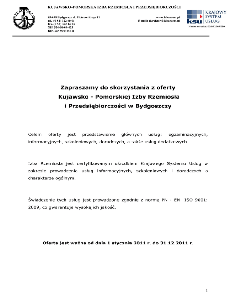 KUJAWSKO–POMORSKA IZBA RZEMIOSŁA I PRZEDSIĘBIORCZOŚCI 85-098 Bydgoszcz ul. Piotrowskiego 11 tel. (0 52) 322 60 01 fax. (0 52) 322 14 23 NIP 554-10-09-423 REGON 000446411 www.izbarzem.pl E-mail: [email protected] Zapraszamy do skorzystania z oferty Kujawsko - Pomorskiej Izby Rzemiosła i Przedsiębiorczości w Bydgoszczy Celem oferty jest przedstawienie głównych usług: egzaminacyjnych, informacyjnych, szkoleniowych, doradczych, a także usług dodatkowych. Izba Rzemiosła jest certyfikowanym ośrodkiem Krajowego Systemu Usług w zakresie prowadzenia usług informacyjnych, szkoleniowych i doradczych o charakterze ogólnym. Świadczenie tych usług jest prowadzone zgodnie z normą PN - EN ISO 9001: 2009, co gwarantuje wysoką ich jakość. Oferta jest ważna od dnia 1 stycznia 2011 r. do 31.12.2011 r. 1 ZAKRES OFERTY Usługi egzaminacyjne Izba rzemieślnicza realizuje usługi egzaminacyjne na tytuł czeladnika i mistrza w zawodzie. Obecnie KPIRiP przeprowadza egzaminy w zawodach: bioenergoterapeuta, blacharz, blacharz samochodowy, cukiernik, cieśla, dekarz, drukarz, elektromechanik, elektromechanik pojazdów samochodowych, elektryk, fotograf, fryzjer, introligator, kaletnik, kamieniarz, kominiarz, kowal, krawiec, lakiernik, lakiernik samochodowy, malarz - tapeciarz, mechanik pojazdów i maszyn rolniczych, mechanik pojazdów samochodowych, monter - elektronik, monter instalacji gazowych, monter instalacji i urządzeń sanitarnych, murarz, piekarz, radiestezja, renowator zabytków architektonicznych, rzeźnik - wędliniarz, stolarz, ślusarz, sztukator, tapicer, wulkanizator, zdun. Od 2009 r. po powołaniu przy Izbie Centrum Kształcenia Ustawicznego Rzemiosła i Przedsiębiorczości w Bydgoszczy realizowane są również usługi egzaminacyjne na tytuł kwalifikacyjny zawodowy oraz tytuł mistrza w zawodzie kucharz małej gastronomii. Usługi informacyjne Od 2008 roku Kujawsko-Pomorska Izba Rzemiosła i Przedsiębiorczości w Bydgoszczy prowadzi Lokalny Punkt Konsultacyjny z siedzibą w Świeciu w ramach podpisanej umowy z Polską Agencją Rozwoju Przedsiębiorczości. Projekt współfinansowany ze środków Europejskiego Funduszu Społecznego w ramach Programu Operacyjnego Kapitał Ludzki. Lokalny Punkt Konsultacyjny świadczy bezpłatne usługi informacyjne dla przedsiębiorców oraz osób zainteresowanych rozpoczęciem działalności gospodarczej. 2 Celem tych usług jest dotarcie do jak najszerszego grona klientów z informacją. Koszt realizacji usług liczony jest zgodnie z cennikiem. LPK świadczy bezpłatne usługi informacyjne obejmujące zagadnienia związane z: podejmowaniem działalności gospodarczej (własna firma krok po roku); wykonywanie działalności zatrudnienie pracowników, gospodarczej finansowanie (obowiązki działalności, podatkowe, kontrola przedsiębiorstw); możliwości uzyskania wparcia na realizację projektów w latach 2007-2013 (dostępne programy pomocy, finansowanie budżetu Państwa, fundusze strukturalne, zasady ubiegania się o dotacje); prawo pracy, marketing, finanse, podatki itp. dostępne na rynku oferty finansowania zewnętrznego przez banki, warunki udzielenia kredytu/pożyczki, inne instytucje finansowe- firmy leasingowe, fundusze pożyczkowe, fundusze poręczeń kredytowych, fundusze kapitałowe itp. zasady przygotowania dokumentacji aplikacyjnej w ramach uruchomionych programów pomocowych; zasady rozliczania poszczególnych programów wsparcia; inne dane, w tym dane teleadresowe. Usługi doradcze Kujawsko-Pomorska Izba Rzemiosła i Przedsiębiorczości w Bydgoszczy świadczy klientom, poza usługami informacyjnymi również usługi doradcze w zakresie: opracowywania wniosków i dokumentacji programowej zasad opracowywania załączników do wniosków /biznes plan/ zarządzania finansami /analizy i prognozy/ marketingu /plan marketingowy/ zarządzania zasobami ludzkimi /dobór i planowanie kadr/. Koszt realizacji usług liczony jest zgodnie z cennikiem. 3 Usługi szkoleniowe Od początku swej działalności Kujawsko - Pomorska Izba Rzemiosła i Przedsiębiorczości oferuje swoim klientom szeroki zakres usług szkoleniowych, w tym przede wszystkim: szkolenia zamknięte na zlecenie firmy oraz otwarte dla określonych grup zawodowych kursy doskonalące i podnoszące kwalifikacje zawodowe, przygotowujące do egzaminów na uzyskanie tytułu czeladnika i mistrza w wybranym zawodzie kurs pedagogiczny dla instruktorów praktycznej nauki zawodu szkolenia dla osób pozostających bez pracy, rozpoczynających i prowadzących własną działalność gospodarczą szkolenia z zakresu zarządzania zasobami ludzkimi, komunikacji interpersonalnej, negocjacji oraz szkolenia trenerskie szkolenia z zakresu zasad sporządzania wniosków aplikacyjnych o dofinansowanie działalności gospodarczej ze środków publicznych sesje informacyjno-promocyjne w ramach funkcjonowania Lokalnego Punktu Konsultacyjnego. Proponujemy Państwu szeroką ofertę profesjonalnie przygotowanych szkoleń, kursów podnoszących i uzupełniających kwalifikacje oraz umiejętności. Stwarzamy naszym klientom możliwości rozwoju firmy lub indywidualnej kariery poprzez udostępnienie sprawdzonej wiedzy psychologicznej, organizacyjnej oraz doświadczenia i wyczucia biznesowego naszych ekspertów. Szczególną uwagę przykładamy do możliwości zaspokojenia potrzeb firm małych i średnich oraz osób indywidualnych, które chcą się rozwijać a także tych, którzy kompleksowo podchodzą do planowania i realizacji swojej ścieżki kariery zawodowej. Uczestnicy szkoleń, kursów otrzymują zaświadczenia i certyfikaty potwierdzające zdobycie nowych wiadomości. 4 Powołane w Przedsiębiorczości w formach 2009 r. prowadzi Centrum Kształcenia dokształcanie pozaszkolnych, i doskonalenie Ustawicznego doskonalenie metod pracy Rzemiosła osób dorosłych dydaktyczno – wychowawczej, w szczególności w zakresie dokształcania i doskonalenia osób dorosłych. W ramach CKU oferujemy: Szkol