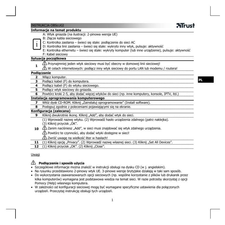 INSTRUKCJA OBSŁUGI Informacje na temat produktu A: Wtyk gniazda (na ilustracji: 2-pinowa wersja UE) B: Złącze kabla sieciowego C: Kontrolka zasilania – świeci się stale: podłączenie do sieci AC D: Kontrolka linii zasilania – świeci się stale: wykryto inny wtyk, pulsuje: aktywność E: Kontrolka ethernetu – świeci się stale: wykryty komputer (lub inne urządzenie), pulsuje: aktywność F: Kabel sieciowy Sytuacja początkowa Przynajmniej jeden wtyk sieciowy musi być obecny w domowej linii sieciowej! W celach internetowych: podłącz inny wtyk sieciowy do portu LAN lub modemu / routera! Podłączanie 2 Włącz komputer. 3 Podłącz kabel (F) do komputera. 4 Podłącz kabel (F) do wtyku sieciowego. 5 Podłącz wtyk sieciowy do gniazda. 6 Powtórz kroki 2-5, aby dodać więcej wtyków do sieci (np. inne komputery, konsole, IPTV, itd.) Instalacja oprogramowania komputerowego 7 Włóż dysk CD-ROM. Kliknij „Zainstaluj oprogramowanie” (Install software). 8 Postępuj zgodnie z poleceniami pojawiającymi się na ekranie. Konfiguracja (zalecana) 9 Kliknij dwukrotnie ikonę. Kliknij „Add”, aby dodać wtyk do sieci. (1) Wprowadź nazwę wtyku. (2) Wprowadź hasło urządzenia zdalnego (patrz naklejka). (3) Kliknij przycisk „OK”. Zanim naciśniesz „Add”, w sieci musi znajdować się wtyk zdalnego urządzenia. 10 Powtórz te czynności, aby dodać wtyki dostępne w sieci! Zwróć uwagę na wielkość liter w hasłach! 11 (1) Kliknij opcję „Privacy”. (2) Wprowadź nazwę własnej sieci. (3) Kliknij „Set All Devices”. 12 (1) Kliknij przycisk „OK”. (2) Kliknij „Close”. 1 Uwagi Podłączenie i sposób użycia • Szczegółowe informacje można znaleźć w instrukcji obsługi na dysku CD (w j. angielskim). • Na rysunku przedstawiono 2-pinowy wtyk UE. 3-pinowe wersje brytyjskie działają w taki sam sposób. • Do wykorzystania zaawansowanych opcji sieciowych (np. wspólne korzystanie z plików lub drukarek przez kilka komputerów) wymagana jest podstawowa wiedza na temat sieci. W razie potrzeby skorzystaj z opcji Pomocy (Help) własnego komputera. • W zależności od konfiguracji sieciowej mogą być wymagane specyficzne ustawienia dla połączonych urządzeń. Przeczytaj instrukcję obsługi tych urządzeń. 1 PL INSTRUKCJA OBSŁUGI • W celu korzystania z połączenia internetowego dla konsoli przez wtyk Trust należy przeczytać instrukcję obsługi konsoli, aby uzyskać prawidłowe ustawienia. • Podłącz produkt bezpośrednio do gniazda w ścianie. Nie korzystaj z (wielogniazdowych) przedłużaczy lub filtrów przeciwprzepięciowych. • Zasięg linii elektrycznej wynosi maksymalnie 200 metrów. • Produkt jest zgodny z wtykami sieciowymi o innej prędkości, ale łączna prędkość będzie w takim przypadku ograniczona przez wtyk o najniższej prędkości. • Maksymalna teoretyczna prędkość sieci wynosi 85 Mbps, ale rzeczywista prędkość zależy od jakości linii zasilania oraz ilości „szumów” elektrycznych na linii. Na stronie www.trust.com/14815 znajdziesz najnowsze odpowiedzi na pytania, oprogramowanie i instrukcje obsługi. Aby uzyskać większy zakres usług zarejestruj się na stronie www.trust.com/register. Instrukcje dotyczące bezpieczeństwa • Urządzenia nie wolno ani otwierać ani naprawiać. • Nie używaj urządzenia w miejscach wilgotnych. Do czyszczenia używaj suchej ściereczki. • Jeśli urządzenie zostanie upuszczone lub obudowa zostanie uszkodzona, wyjmij wtyk z gniazdka i oddaj do naprawy fachowcowi: • Pozostaw przynajmniej 20 mm wolnego miejsca wokół urządzenia, aby zagwarantować odpowiednią wentylację. Otworów wentylacyjnych nie wolno zastawiać np. gazetami, obrusami, serwetkami, itd. • Niniejszy produkt spełnia wszystkie najważniejsze wymogi i przepisy obowiązujących dyrektyw Unii Europejskiej. Deklaracja zgodności (DoC) znajduje się na stronie www.trust.com/14815/ce. • W miarę możliwości prosimy o utylizację produktu w zakładzie odzysku odpadów. Urządzenia nie należy wyrzucać razem z odpadkami domowymi. Gwarancja i prawa autorskie • Urządzenie jest objęte 2-letnią gwarancją producenta, licząc od daty zakupu. Więcej informacji znajdziesz pod adresem www.trust.com/warranty. • Zabrania się kopiowania niniejszej instrukcji w całości lub w części bez zezwolenia firmy Trust International B.V. 2