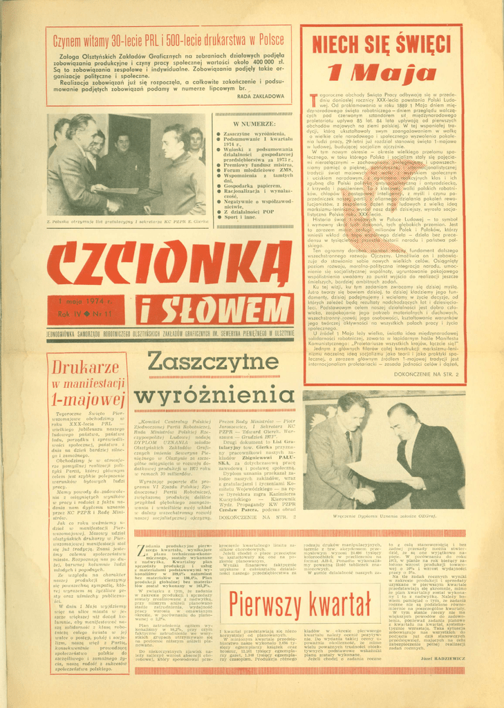 Czynem witamy 30-lecie PRL i 500-lecie drukarstwa w Polsce NIECH SIĘ ŚWIĘCI Załoga Olsztyńskich Zakładów Graficznych na zebraniach działowych podjęła zobowiązania produkcyjne i czyny pracy społecznej wartości około 400 000 zł. Sq to zobowiązania zespołowe i indywidualne. Zobowiązania podjęły także organizacje polityczne i społeczne. Realizacja zobowiązań już się rozpoczęła, a całkowite zakończenie i podsumowanie podjętych zobowiązań podamy w numerze lipcowym br. RADA ZAKŁADOWA T lllillllllllllllllllllllllllllllllllllllllllllllllllllllllll W NUMERZE: • Zaszczytne wyróżnienia, • Podsumowanie I kwartału 1974 r., 9 Wnioski z podsumowania działalności gospodarczej przedsiębiorstwa za 1973 r., • Premiowy fundusz mistrza, • Forum młodzieżowe ZMS, 9 Wspomnienia z tamtych dni, • Gospodarka papierem, • Racjonalizacja i wynalazczość, • Negatywnie o współzawodnictwie, • Z działalności POP • Sport i inne. Z. Paluska otrzymuje list gratulacyjny I sekretarza KC PZPR E. Gierka Illllllllllllllllllllllllllllllllllllllllllllllllllllillllll CZCIONKĄ Rok I V • I SŁOWEM N r 11 JEDNODNIÓWKA SAMORZĄDU ROBOTNICZEGO OLSZTYŃSKICH ZAKŁADÓW GRAFICZNYCH 1 . SEWERYNA PIENIĘŻNEGO W OLSZTYNIE H H H i H H M — ~ T e g o r o c z n e o b c h o d y Święta Pracy o d b y w a j ą s i ę w p r z e d e dniu d o n i o s ł e j rocznicy XXX-lecia p o w s t a n i a Polski Ludowej. O d p r o k l a m o w a n i a w roku 1889 1 M a j a d n i e m m i ę d z y n a r o d o w e g o święta r o b o t n i c z e g o — d n i e m p r z e g l ą d u w a l c z ą cych p o d czerwonym s z t a n d a r e m sił m i ę d z y n a r o d o w e g o p r o l e t a r i a t u upływa 8 5 lat. 8 4 lata u p ł y w a j ą o d pierwszych o b c h o d ó w m a j o w y c h n a ziemi polskiej. W t e j w s p a n i a ł e j t r a dycji, którą ukształtowały swym z a a n g a ż o w a n i e m w w a l k ę o wielkie c e l e n a r o d o w e g o i s p o ł e c z n e g o wyzwolenia p o k o l e nia ludzi pracy, 29-letni j u ż rozdział s t a n o w i ą święta 1 - m a j o w e w ludowej, b u d u j ą c e j socjalizm ojczyźnie. W tym nowym okresie — okresie wielkiego przełomu społecznego, w toku którego Polska i socjalizm stały się pojęciami nierozłącznymi — .i upowszechniamy pamięć o pięknej(/.;jit<^-t^^^ tradycji świat społecznym i uciskiem narodowym,.-:;^e^'óiXf^^:-1^.f'cyjnych klas i ich zgubną dla Polski p o I i t y ną i antyradziecką, z krzywdą i panjżeniem/.-^-.-i klaso^feiśwalki polskich robotników, chłopów 'i^pstęp^^f-'inteli^t^fi, z myśli i czynu poprzedniczek n a '^^Si) a rt ofiarne ćj&ę-d z i a ł a n i a pokoleń rewolucjonistów, z nia-"v£fqżeń mOX-'" ludowych z wielką ideą m a r k s i z m u - l e n i n i z m u - nasz dzfcĘłiń dzisiejszy, wyrosła socjalistyczna Polsk e c i a. Historia w Polsce Ludowej — to symbol i wymowny skr^^j^.^ófrpnań, tych głębokich przemian. Jest to zarazem miśf^-^ośf^l;-.milionów Polek i Polaków, którzy wnieśli wkład dzieła — dzieła bez precedensu w tysiqcle^fe^^>.^^ąVv^istorii narodu i państwa polskiego. Ten ogromny dorofe^^ta^w^-^^fty. fundament dalszego wszechstronnego rozwoju Ojczyzny. Umożliwia on i zobowiązuje do stawiania sobie nowych wielkich celów. Osiągnięty poziom rozwoju, moralno-polityczna integracja narodu, umocnienie się socjalistycznej wspólnoty, ugruntowanie pokojowego współistnienia uważamy za punkt wyjścia do realizacji jeszcze śmielszych, bardziej ambitnych zadań. Ku tej wizji, ku tym zadaniom zwracamy się dzisiaj myślą. Jutro tworzy się bowiem dzisiaj, to dzisiaj kładziemy jego fundamenty, dzisiaj podejmujemy i wcielamy w życie decyzje, od których zależeć będą rezultaty nadchodzących lat i dziesięcioleci. Podstawowym ceiem naszej działalności jest dobro człowieka, zaspokajanie jego potrzeb materialnych i duchowych, wszechstronny rozwój jego osobowości, kształtowanie warunków jego twórczej aktywności na wszystkich polach pracy i życia społecznego. U źródeł 1 Maja leży wielka, światła idea międzynarodowej solidarności robotniczej, zawarta w lapidarnym haśle Manifestu Komunistycznego: „Proletariusze wszystkich krajów, łączcie się!" Jednym z głównych filarów całej konstrukcji marksizmu-leninizmu naczelną ideą socjalizmu jako teorii i jako praktyki społecznej, a zarazem głównym źródłem 1-majowej tradycji jest internacjonalizm proletariacki - zasada jedności celów i dążeń, H M H n BE Zaszczytne w manifestacji 1-majowejwyróżnienia I Drukarze DOKOŃCZENIE NA STR. 2 iiiiiiiiiiiiiiiiiiiiiiiimiiiiiimiiiiimiiiiiiiiiiiiiiiiiiiiiiiiiiiitiiiiMiiiiiiiiiiiiiiiiiiiiiii iiiiiiiiiiiiiiiiiiititiiłiiitiiiiitiitiiiiiiiitiiiiiiiitiiiiłiiiiiitiiiiitiiiiiiiiiiiiiitiłitaiiiiłiiiiiiiiiiiiiiiiii>iiti*it> Tegoroczne Święto Pierwszomajowe obchodzimy w roku XXX-lecia PRL — wielkiego jubileuszu naszego ludowego państwa, państica ładu, porządku i spraioiedliivości społecznej, państwa z dnia na dzień bardziej silnego i zamożnego. Obchodzimy je w atmosferze pomyślnej realizacji polityki Partii, której głównym celem jest szybkie polepszenie warunków bytowych ludzi pracy. Mamy powody do zadoicolenia z osiągniętych wyników w pracy i radości z faktu nadania nam dyplomu uznania przez KC PZPR i Radę Ministrów. Jak co roku weźmiemy udział w manifestacji Pierwszomajowej. Masowy udział olsztyńskich drukarzy w Pierwszomajowej manifestacji stał się już tradycją. Znani jesteśmy całemu społeczeństwu miasta. Rozpoznają nas po dużej, barwnej kolumnie ludzi młodych i pogodnych. Ze względu na charakter naszej produkcji cieszymy się powszechną sympatią, której wyrazem są życzliwe gesty oraz uśmiechy publiczności. W dniu 1 Maja wyjdziemy więc na ulice miasta w jeszcze większej niż dotąd kolumnie, aby manifestować naszą solidarność z klasą robotniczą całego świata w jej walce o postęp, pokój 