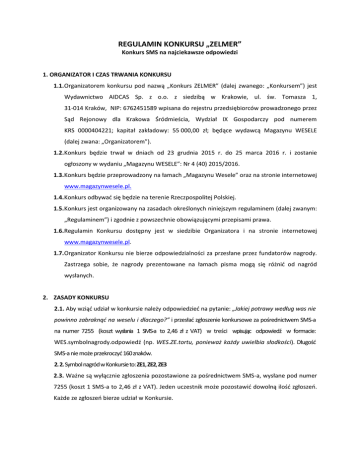REGULAMIN KONKURSU „ZELMER” Konkurs SMS na najciekawsze odpowiedzi 1. ORGANIZATOR I CZAS TRWANIA KONKURSU 1.1. Organizatorem konkursu pod nazwą „Konkurs ZELMER” (dalej zwanego: „Konkursem”) jest Wydawnictwo AIDCAS Sp. z o.o. z siedzibą w Krakowie, ul. św. Tomasza 1, 31-014 Kraków, NIP: 6762451589 wpisana do rejestru przedsiębiorców prowadzonego przez Sąd Rejonowy dla Krakowa Śródmieścia, Wydział IX Gospodarczy pod numerem KRS 0000404221; kapitał zakładowy: 55 000,00 zł; będące wydawcą Magazynu WESELE (dalej zwana: „Organizatorem”). 1.2. Konkurs będzie trwał w dniach od 23 grudnia 2015 r. do 25 marca 2016 r. i zostanie ogłoszony w wydaniu „Magazynu WESELE”: Nr 4 (40) 2015/2016. 1.3. Konkurs będzie przeprowadzony na łamach „Magazynu Wesele” oraz na stronie internetowej www.magazynwesele.pl. 1.4. Konkurs odbywać się będzie na terenie Rzeczpospolitej Polskiej. 1.5. Konkurs jest organizowany na zasadach określonych niniejszym regulaminem (dalej zwanym: „Regulaminem”) i zgodnie z powszechnie obowiązującymi przepisami prawa. 1.6. Regulamin Konkursu dostępny jest w siedzibie Organizatora i na stronie internetowej www.magazynwesele.pl. 1.7. Organizator Konkursu nie bierze odpowiedzialności za przesłane przez fundatorów nagrody. Zastrzega sobie, że nagrody prezentowane na łamach pisma mogą się różnić od nagród wysłanych. 2. ZASADY KONKURSU 2.1. Aby wziąć udział w konkursie należy odpowiedzieć na pytanie: „Jakiej potrawy według was nie powinno zabraknąć na weselu i dlaczego?” i przesłać zgłoszenie konkursowe za pośrednictwem SMS-a na numer 7255 (koszt wysłania 1 SMS-a to 2,46 zł z VAT) w treści wpisując odpowiedź w formacie: WES.symbolnagrody.odpowiedź (np. WES.ZE.tortu, ponieważ każdy uwielbia słodkości). Długość SMS-a nie może przekroczyć 160 znaków. 2. 2. Symbol nagród w Konkursie to: ZE1, ZE2, ZE3 2.3. Ważne są wyłącznie zgłoszenia pozostawione za pośrednictwem SMS-a, wysłane pod numer 7255 (koszt 1 SMS-a to 2,46 zł z VAT). Jeden uczestnik może pozostawić dowolną ilość zgłoszeń. Każde ze zgłoszeń bierze udział w Konkursie. 2.4. Przystąpienie do Konkursu, zgodnie z postanowieniami niniejszego Regulaminu jest równoznaczne ze złożeniem przez uczestnika oświadczenia w przedmiocie akceptacji niniejszego Regulaminu. 2.5. Wyłonienie zwycięzców Konkursu odbędzie się najpóźniej do 23 maja 2016 r. według poniższych zasad: 2.5.1. Uczestnicy Konkursu wysyłają SMS-a o treści podanej w pkt. 2.1. a Komisja Konkursowa wybiera te osoby, które prześlą najciekawsze odpowiedzi na zadane pytanie. Nie ma znaczenia kolejność zgłoszeń. 2.5.2. Komisja Konkursowa wybierając najciekawsze odpowiedzi będzie brała pod uwagę: konkretne przykłady, spójność odpowiedzi, oryginalną argumentację przytoczoną w odpowiedzi na zadane pytanie. 2.5.3. Przedstawiciel Komisji Konkursowej od dnia zakończenia konkursu tj. od 25 marca 2016 r. do 23 maja 2016 r. skontaktuje się ze zwycięzcą w celu powiadomienia go o wygranej. Warunkiem uzyskania prawa do nagrody jest przesłanie przez uczestnika danych mailem, umożliwiających identyfikację zwycięzcy. Organizator oświadcza, że dane osobowe uczestnika w zakresie: imię i nazwisko, numer telefonu komórkowego lub odpowiednio adres zamieszkania, będą przetwarzane przez Organizatora Konkursu na potrzeby odbioru nagrody przez zwycięzcę oraz w celach marketingowych Organizatora. Uczestnik konkursu wyraża zgodę na otrzymywanie na numer telefonu komórkowego, z którego zostało wysłane zamówienie, informacji handlowych dotyczących produktów i usług Organizatora oraz promocji organizowanych przez Organizatora, jak również na otrzymywanie SMS-ów zwrotnych, zawierających hiperłącza do pobrania katalogów promocyjnych Java. Organizator gwarantuje prawo wglądu do swoich danych osobowych oraz ich poprawiania, jak również żądania zaprzestania przetwarzania danych. Dane osobowe nie będą udostępniane innym podmiotom. 2.5.4. W przypadku braku możliwości skontaktowania się ze zwycięzcą w ciągu dwóch dni roboczych lub odmowy wskazania danych umożliwiających identyfikację uczestnika Konkursu, a także w przypadku wybrania osoby, która jest już zwycięzcą w niniejszym Konkursie, przedstawiciel Komisji Konkursowej wybiera następną w kolejności najciekawszą odpowiedź, aż do wyłonienia kandydata zgodnie z zasadą wskazaną w punkcie 2.5.1. i 2.5.2. Procedura ta nie zmienia zasad ustalania kolejnych zwycięzców konkursu zgodnie z punktem 2.5 powyżej. 2.6. Nagrodami w konkursie są: a) 2 (słownie: dwie) kuchenki mikrofalowe (symbol ZMW3100X). Wartość jednej nagrody wynosi 289 złotych brutto (słownie: dwieście osiemdziesiąt dziewięć złotych) (z VAT). b) 1 (słownie: jeden) wielofunkcyjny robot kuchenny (symbol ZFP1100C). Wartość nagrody wynosi 699 złotych brutto (słownie: sześćset dziewięćdziesiąt dziewięć złotych) (z VAT). c) 2 (słownie: dwa) blendery ręczne (symbol ZHB1320B). Wartość jednej nagrody wynosi 246,47 złote (słownie: dwieście czterdzieści sześć złotych, czterdzieści siedem groszy) (z VAT). Nagrody ufundowane przez firmę BSH Sprzęt gospodarstwa domowego sp. z o.o. 2.7. Łączna wartość nagród wynosi 1769,94 złotych (słownie: tysiąc siedemset sześćdziesiąt dziewięć złotych, dziewięćdziesiąt cztery grosze) (z VAT). 3. WARUNKI UCZESTNICTWA W KONKURSIE 3.1. Uczestnikiem Konkursu może być osoba fizyczna, pełnoletnia, posiadająca pełną zdolność do czynności prawnych i uprawniona do użytkowania telefonu komórkowego w sieci Orange, T-Mobile, Plus i Play. Osoby nie mające pełnej zdolności do czynności prawnych mogą wziąć udział w Konkursie pod warunkiem uzyskania zgody opiekuna prawnego lub przedstawiciela ustawowego na uczestnictwo w Konkursie. 3.2. W konkursie nie mogą brać udziału pracownicy Organizatora i realizatorów oraz inne os