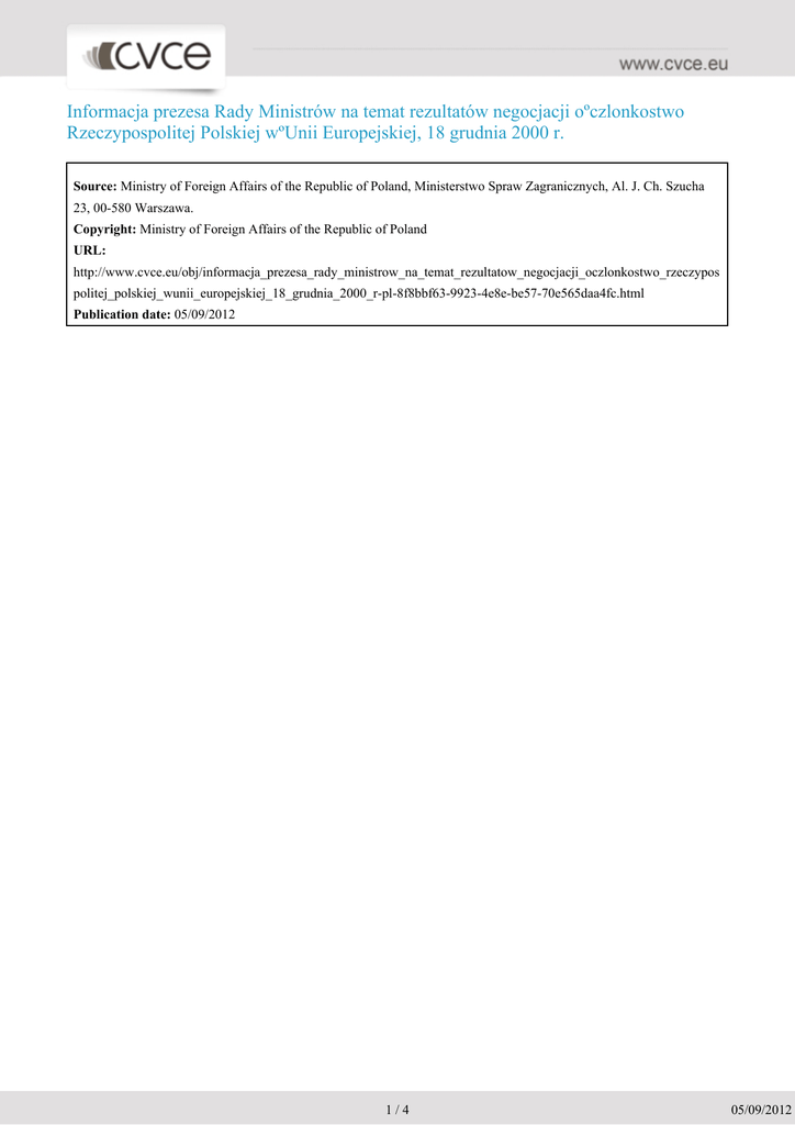 Informacja prezesa Rady Ministrów na temat rezultatów negocjacji oºczlonkostwo Rzeczypospolitej Polskiej wºUnii Europejskiej, 18 grudnia 2000 r. Source: Ministry of Foreign Affairs of the Republic of Poland, Ministerstwo Spraw Zagranicznych, Al. J. Ch. Szucha 23, 00-580 Warszawa. Copyright: Ministry of Foreign Affairs of the Republic of Poland URL: http://www.cvce.eu/obj/informacja_prezesa_rady_ministrow_na_temat_rezultatow_negocjacji_oczlonkostwo_rzeczypos politej_polskiej_wunii_europejskiej_18_grudnia_2000_r-pl-8f8bbf63-9923-4e8e-be57-70e565daa4fc.html Publication date: 05/09/2012 1/4 05/09/2012 Informacja prezesa Rady Ministrów na temat rezultatów negocjacji o członkostwo Rzeczypospolitej Polskiej w Unii Europejskiej, 18 grudnia 2000 r. Prezes Rady Ministrów Leszek Miller: Panie Marszałku! Panie i Panowie Senatorowie! Do kalendarza polskich dat, które pozytywnie odmieniały losy narodu, dopisujemy datę nową: 13 grudnia 2002 r. Tego dnia w Kopenhadze Polska wraz z dziewięcioma innymi krajami: Cyprem, Czechami, Estonią, Litwą, Łotwą, Maltą, Słowacją, Słowenią i Węgrami, zakończyła negocjacje i stanęła u progu Unii Europejskiej, wspólnoty wolnych narodów, które razem budują dobrobyt i bezpieczeństwo naszego kontynentu. Z naszym pełnoprawnym udziałem Europa kładzie kres nienaturalnemu podziałowi kontynentu, rozwijając zaufanie, partnerstwo i wspólne myślenie o przyszłości. Parafrazując słowa Willy'ego Brandta można powiedzieć, że przeszliśmy ogromnie długą drogę - od ostrego podziału i bycia przeciwko sobie poprzez współistnienie, bycie obok siebie, do bycia razem. Jałta, Poczdam, żelazna kurtyna, mury i bariery dzielące państwa, miasta i ludzi odchodzą coraz głębiej w przeszłość. To w Polsce zaczęło się burzenie tych murów i podziałów. Dziś historia daje nam satysfakcję, na którą w pełni zasłużyliśmy, i na którą sami zapracowaliśmy. Nie byłoby delegacji polskiej w Kopenhadze gdyby nie polski Sierpień i polska "Solidarność", gdyby nie Okrągły Stół, przy którym zaczęliśmy naszą Polaków rozmowę o lepszej polskiej przyszłości, przełamując w ten sposób brak zdolności do współdziałania oraz nieumiejętność prowadzenia dialogu, czego symbolem jest inny 13 grudnia. Zestawienie tych dat pokazuje, o ile dziś jesteśmy mądrzejsi i dokąd możemy dojść, idąc razem. Tak jak Europa przeszła od Kopenhagi z czerwca 1993 r., kiedy Rada Europejska zadecydowała o możliwości rozszerzenia Unii, do Kopenhagi w grudniu 2002 r., kiedy zakończono negocjacje z dziesięcioma państwami, tak my od polskiej "Solidarności" roku 1980 doszliśmy do solidarności europejskiej dwudziestego pierwszego wieku. Wysoka Izbo! Możemy wejść do Unii Europejskiej na warunkach najlepszych z możliwych. Szczegółowy opis tych warunków, genezę i przebieg negocjacji, prezentację ich wyników w poszczególnych dziedzinach, uzyskane rezultaty zawiera przyjęty przez Radę Ministrów "Raport na temat rezultatów negocjacji o członkostwo Rzeczypospolitej Polskiej w Unii Europejskiej". Przedstawi go za chwilę paniom i panom senatorom pani minister Danuta Hubner. Będzie on także udostępniony opinii publicznej. To są dobre wiadomości. Polska delegacja była w Kopenhadze silna życzliwością i determinacją Polaków, którzy chcą, by ich kraj, leżący w środku europejskiego kontynentu, pozostawał w głównym nurcie życia Europy i w głównym nurcie europejskiej polityki. Kiedy negocjowaliśmy w trudnych, trzeba przyznać, okolicznościach, kiedy dochodziliśmy do ostatecznego porozumienia, jako szef delegacji wiedziałem, że mam nie tylko odpowiednie pełnomocnictwa rządu, parlamentu, poparcie pana prezydenta, wielu partii politycznych i sił społecznych, ale że działam przede wszystkim w interesie wszystkich moich rodaków, którzy popierają integrację z Unią Europejską. Wiedziałem, że finalizuję proces, w który zaangażowane były wszystkie rządy po 1989 r. i wszystkie parlamenty poprzednich kadencji. Przyniosła efekty ofensywa dyplomatyczna Polski, którą prowadziliśmy szczególnie intensywnie w ostatnich tygodniach. Bez niej nie byłoby duńskiej propozycji poprawy warunków akcesyjnych, zgody na te warunki państw członkowskich, ani tego co uzyskaliśmy w ostatnich godzinach i minutach negocjacji. Mam dzisiaj zaszczyt i obowiązek, który spełniam ze szczególną przyjemnością, przekazać Wysokiemu Senatowi wyrazy szacunku i podziękowania. To jest nasz wspólny sukces i bez takiej wspólnoty nie byłby on możliwy. Wyrazy podziękowania chciałbym przekazać zaangażowanym, w tej i poprzedniej kadencji, w prace Komisji Spraw Zagranicznych i Integracji Europejskiej senatorom, którzy szczególnie intensywnie uczestniczyli w procesie dostosowania polskiego prawa do norm unijnych. Bez tego ogromnego wysiłku nie 2/4 05/09/2012 byłoby możliwe zamknięcie negocjacji. Tu zresztą mamy jeszcze sporo pracy do wykonania. Składam te podziękowania na ręce szefowej komisji pani senator Genowefy Grabowskiej. Panie i Panowie Senatorowie! Robimy kolejny, bardzo ważny krok w budowie systemu bezpieczeństwa kontynentu europejskiego i w dużej mierze bezpieczeństwa świata. To nie jest zbyt wielkie słowo na opisanie procesu rozszerzania Unii Europejskiej, w którym Polacy uczestniczą na równorzędnych prawach i przy równych obowiązkach jako odpowiedzialny i pewny partner. Taką odpowiedzialnością wobec własnych obywateli polski rząd wykazał się w negocjacjach: wiedzieliśmy, co chcemy uzyskać i dlaczego do określonych celów dążymy. Taką odpowiedzialnością wykazaliśmy się wobec partnerów: rozumieliśmy położenie innych, ale też wymagaliśmy zrozumienia dla naszych problemów. Negocjacje o członkostwo Polski w Unii Europejskiej rozpoczęły się 31 marca 1998 r. w wyniku decyzji podjętej przez Radę Europejską w Luksemburgu. Wcześniej, 16 grudnia 1991 r., podpisano u