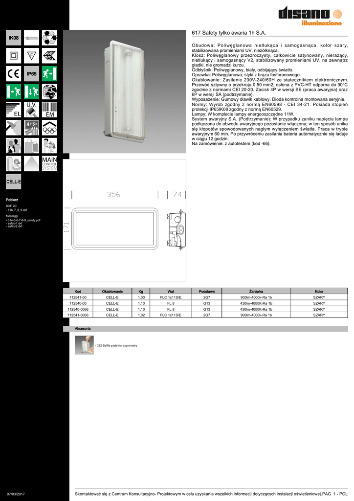 617 Safety tylko awaria 1h S.A. Obudowa: Poliwęglanowa nietłukąca i samogasnąca, kolor szary, stabilizowana promieniami UV, nieżółknąca. Klosz: Poliwęglanowy przezroczysty, całkowicie satynowany, nierażący, nietłukący i samogasnący V2, stabilizowany promieniami UV, na zewnątrz gładki, nie gromadzi kurzu. Odbłyśnik: Poliwęglanowy, biały, odbijający światło. Oprawka: Poliwęglanowa, styki z brązu fosforanowego. Okablowanie: Zasilanie 230V-240/60H ze statecznikiem elektronicznym. Przewód sztywny o przekroju 0.50 mm2, osłona z PVC-HT odporna do 90°C zgodnie z normami CEI 20-20. Zacisk 4P w wersji SE (praca awaryjna) oraz 6P w wersji SA (podtrzymanie). Wyposażenie: Gumowy dławik kablowy. Dioda kontrolna montowana seryjnie. Normy: Wyrób zgodny z normą EN60598 - CEI 34-21. Posiada stopień protekcji IP65IK08 zgodny z normą EN60529. Lampy: W komplecie lampy energooszczędne 11W. System awaryjny S.A. (Podtrzymanie): W przypadku zaniku napięcia lampa podłączona do obwodu awaryjnego pozostanie włączona; w ten sposób unika się kłopotów spowodowanych nagłym wyłączeniem światła. Praca w trybie awaryjnym 60 min. Po przywróceniu zasilania bateria automatycznie się ładuje w ciągu 12 godzin. Na zamówienie: z autotestem (kod -66). Pobierz DXF 2D - 616_7_8_9.dxf Montaggi - 614-5-6-7-8-9_safety.pdf - safety1.dxf - safety2.dxf Kod Okablowanie Kg Wat Podstawa Źarówka Kolor 112541-00 CELL-E 1,00 FLC 1x11S/E 2G7 900lm-4000k-Ra 1b SZARY 112540-00 CELL-E 1,10 FL 8 G13 430lm-4000K-Ra 1b SZARY 112540-0066 CELL-E 1,10 FL 8 G13 430lm-4000K-Ra 1b SZARY 112541-0066 CELL-E 1,02 FLC 1x11S/E 2G7 900lm-4000k-Ra 1b SZARY Akcesoria - 322 Baffle plate for asymmetry 07/03/2017 Skontaktować się z Centrum Konsultacyjno- Projektowym w celu uzyskania wszelkich informacji dotyczących instalacji oświetleniowej. PAG 1 - POL