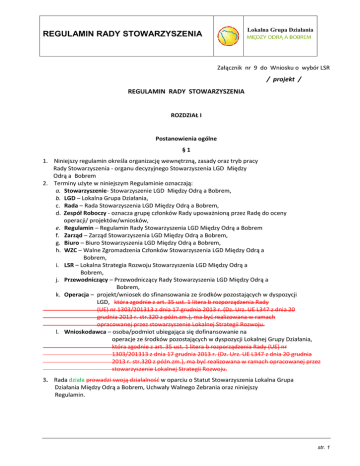 Lokalna Grupa Działania REGULAMIN RADY STOWARZYSZENIA Załącznik nr 9 do Wniosku o wybór LSR / projekt / REGULAMIN RADY STOWARZYSZENIA ROZDZIAŁ I Postanowienia ogólne §1 1. Niniejszy regulamin określa organizację wewnętrzną, zasady oraz tryb pracy Rady Stowarzyszenia - organu decyzyjnego Stowarzyszenia LGD Między Odrą a Bobrem 2. Terminy użyte w niniejszym Regulaminie oznaczają: a. Stowarzyszenie- Stowarzyszenie LGD Między Odrą a Bobrem, b. LGD – Lokalna Grupa Działania, c. Rada – Rada Stowarzyszenia LGD Między Odrą a Bobrem, d. Zespół Roboczy - oznacza grupę członków Rady upoważnioną przez Radę do oceny operacji/ projektów/wniosków, e. Regulamin – Regulamin Rady Stowarzyszenia LGD Między Odrą a Bobrem f. Zarząd – Zarząd Stowarzyszenia LGD Między Odrą a Bobrem, g. Biuro – Biuro Stowarzyszenia LGD Między Odrą a Bobrem, h. WZC – Walne Zgromadzenia Członków Stowarzyszenia LGD Między Odrą a Bobrem, i. LSR – Lokalna Strategia Rozwoju Stowarzyszenia LGD Między Odrą a Bobrem, j. Przewodniczący – Przewodniczący Rady Stowarzyszenia LGD Między Odrą a Bobrem, k. Operacja – projekt/wniosek do sfinansowania ze środków pozostających w dyspozycji LGD, która zgodnie z art. 35 ust. 1 litera b rozporządzenia Rady (UE) nr 1303/201313 z dnia 17 grudnia 2013 r. (Dz. Urz. UE L347 z dnia 20 grudnia 2013 r. str.320 z późn.zm.), ma być realizowana w ramach opracowanej przez stowarzyszenie Lokalnej Strategii Rozwoju. l. Wnioskodawca – osoba/podmiot ubiegająca się dofinansowanie na operacje ze środków pozostających w dyspozycji Lokalnej Grupy Działania, która zgodnie z art. 35 ust. 1 litera b rozporządzenia Rady (UE) nr 1303/201313 z dnia 17 grudnia 2013 r. (Dz. Urz. UE L347 z dnia 20 grudnia 2013 r. str.320 z późn.zm.), ma być realizowana w ramach opracowanej przez stowarzyszenie Lokalnej Strategii Rozwoju. 3. Rada działa prowadzi swoją działalność w oparciu o Statut Stowarzyszenia Lokalna Grupa Działania Między Odrą a Bobrem, Uchwały Walnego Zebrania oraz niniejszy Regulamin. str. 1 REGULAMIN RADY STOWARZYSZENIA Lokalna Grupa Działania §2 1. Rada jest organem decyzyjnym, do kompetencji którego należy wybór operacji i ustalenie kwoty wsparcia. zgodnie z rozumieniem art.2 pkt 9 rozporządzenia nr 1303/2013 z dnia 17 grudnia 2013 oraz ustalenie kwoty wsparcia dla operacji zgodnie z art.34 ust 3 lit.f rozporządzenia nr 1303/2013 z dnia 17 grudnia 2013 oraz zgodnie z Ustawą z dnia 20 lutego 2015r. o rozwoju lokalnym z udziałem lokalnej społeczności a w szczególności zapisami art.21 i zapisami LSR. 2. Rada przyznaje pomoc na operacje polegające na przygotowaniu lub realizacji przedsięwzięć w zakresie współpracy dotyczących: a. wzmocnienia kapitału społecznego, w tym przez podnoszenie wiedzy społeczności lokalnej w zakresie ochrony środowiska i zmian klimatycznych, a także z wykorzystaniem rozwiązań innowacyjnych b. rozwoju rynków zbytu produktów i usług lokalnych, z wyłączeniem operacji polegających na budowie lub modernizacji targowisk objętych zakresem wsparcia przez Samorząd Województwa c. zachowania dziedzictwa lokalnego d. budowy lub przebudowy ogólnodostępnej i niekomercyjnej infrastruktury turystycznej lub rekreacyjnej lub kulturalnej e. promowania obszaru objętego strategią rozwoju lokalnego kierowanego przez społeczność w tym produktów lub usług lokalnych oraz lokalnej przedsiębiorczości f. stworzenie warunków do rozwoju przedsiębiorczości na obszarze objętym LSR 2. W toku prac Rada może powołać w swoim składzie zespoły robocze i posiłkować się rekomendacjami i materiałami opracowanymi przez Biuro, zewnętrzne podmioty lub ekspertów., z zachowaniem zasad, o których mowa w paragrafie 19 statutu. 3. W celu usprawnienia oceny wniosków, które mają być realizowane w ramach LSR, Rada może wyłonić spośród siebie zespoły robocze składające się z co najmniej 5 i nie więcej niż 7 członków Rady. W przypadku obecności mniej niż 10 członków Rada pracuje w całym składzie obecnych. 3. Rada ma prawo może również: a. opiniować projekt i zmiany LSR opracowane przez Zarząd, b. opiniować inne sprawy wnioskowane przez Zarząd, c. wnioskować do Zarządu i Walnego Zebrania Członków w sprawach dotyczących bieżącej działalności stowarzyszenia oraz realizacji LSR. d. wnioskować zmiany w Regulaminie, do Zarządu i Walnego Zebrania Członków, które zostały przyjęte uchwałą przez Radę. podczas posiedzenia w trybie podstawowym, bezwzględną większością głosów. e wnioskować o zmianę kryteriów wyboru 4. Rada/Zespoły Robocze podejmują rozstrzygnięcia w bezwzględnej większości ustalonego składu osobowego na posiedzeniu. 4. W kwestiach nieuregulowanych w statucie i niniejszym regulaminie, szczegółowy tryb postępowania w odniesieniu do zadań Rady zostanie ustalany jest w drodze uchwały Rady. ROZDZIAŁ II Członkowie Rady Stowarzyszenia str. 2 REGULAMIN RADY STOWARZYSZENIA Lokalna Grupa Działania §3 1. W skład Rady wchodzi 15 osóbwybieranych i odwoływanych przez Walne Zebranie Członków spośród członków tego organu w głosowaniu na posiedzeniu, bezwzględną większością głosów, w obecności przynajmniej połowy uprawnionych do głosowania członków Stowarzyszenia. 1. Członkowie Rady wybierani są zgodnie z trybem opisanym w statucie. 2. W przypadku zmiany liczby członków Rady w trakcie kadencji, Rada pracuje w zmienionym składzie, jeżeli zachowana jest wymagana reprezentatywność i parytety. 3. Członkami Rady mogą być przedstawiciele sektora publicznego, społecznego, gospodarczego oraz mieszkańcy. 4. Procentowy udział przedstawicieli każdego z sektorów / publiczny, społeczny, gospodarczy, mieszkańcy) nie może posiadać więcej aniżeli 49 % ogólnej liczby członków w Radzie Programowej. Liczba przedstawicieli sektorów poza publicznym musi wynosić ponad 50 % 4. Na poziomie podejmowania decyz